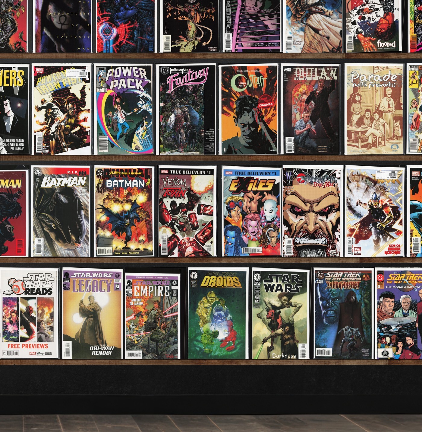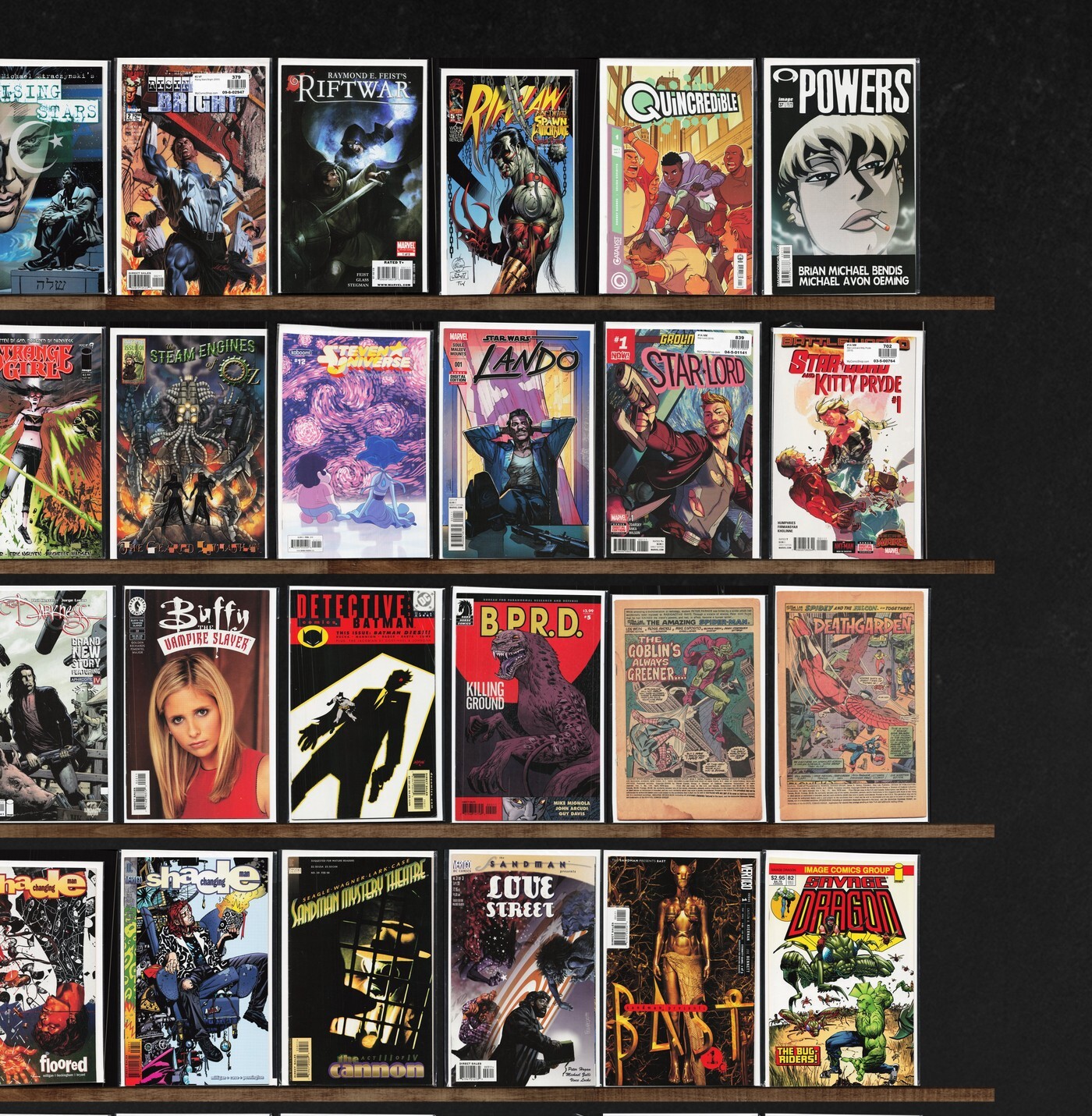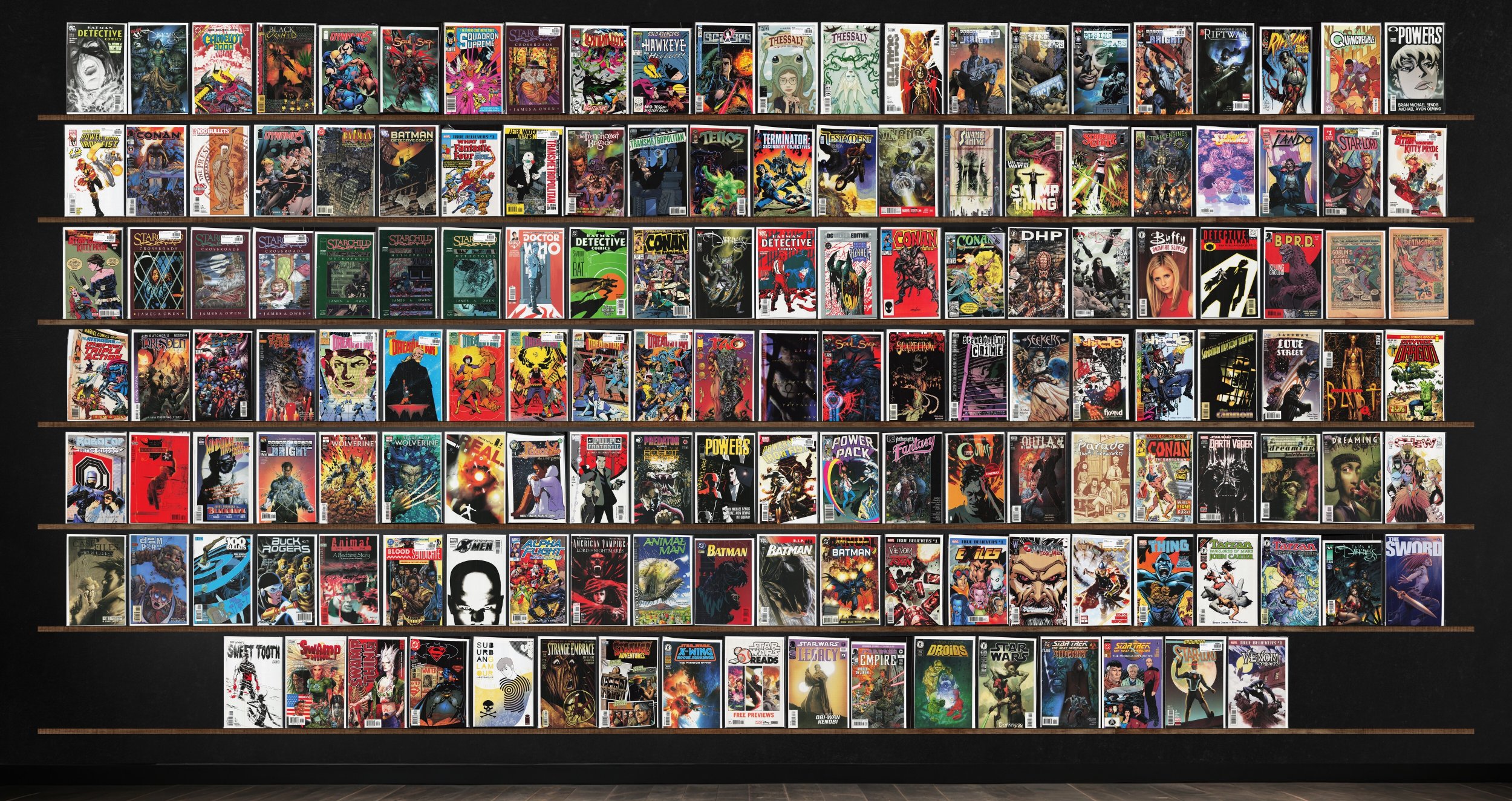 Dreadstar, Detective Comics, Starchild: Crossroads, Swamp Thing, Conan The Barbarian, The Darkness, Rising Stars: Bright, Starchild: Mythopolis, Dynamo 5, Soul Saga, Rising Stars, Powers, 100 Bullets, Star Lord, Doom Patrol, Sandman Mystery Theatre, Return Of Wolverine, The Dreaming, Animal Man, Batman, Camelot 3000, Black Orchid, Squadron Supreme, Sleepwalker, Solo Avengers, Sci Spy, Scalped, Riftwar, Ripclaw, Quincredible, Conan, Batman Chronicles (1995), What If?, Trenchcoat Brigade, Transmetropolitan, Tellos, Terminator: Secondary Objectives, Testament, Thanos Rising, Strange Girl, Steven Universe Ongoing, Lando, Doctor Who, Dark Horse Presents, B.P.R.D.: Killing Ground, Amazing Spider-Man, Marvel Team Up, Marvel Triple Action, Dv8, Savage Dragon, Robocop: Prime Suspect, The Sandman, Princeless: Find Yourself, Pulp Fantastic, Power Pack, Pathways To Fantasy, Outlaw Nation, Parade (With Fireworks), Darth Vader, Chew, Buck Rogers, Blood Syndicate, Astonishing X-Men, Alpha Flight, Batman Annual, Exiles, Thor, Tarzan, The Sword, Sweet Tooth, Superman / Batman, Suburban Glamour, Strange Embrace, Strange Adventures, Star Wars Reads, Star Wars: Empire, Star Wars: Droids, Star Wars