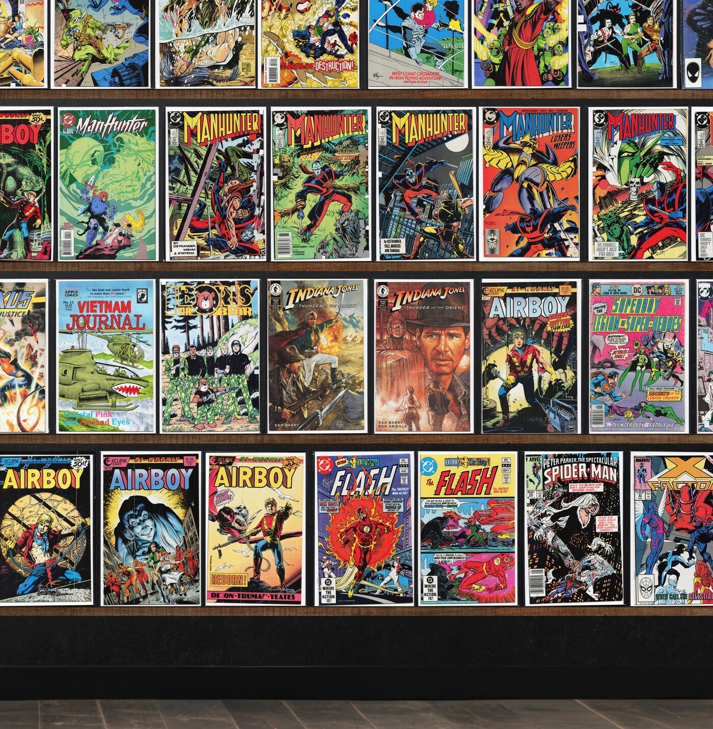Manhunter, Airboy, X-Factor, Ka Zar The Savage, Boris The Bear, Magnus Robot Fighter, Nexus, The Spectacular Spider-Man, The H.A.R.D. Corps, Rai, The Badger, The Flash, Turok, Dinosaur Hunter, Silver Surfer, Iron Man, The New Mutants, Nexus Alien Justice, Superboy, Justice League Europe, Amazing X-Men, Avengers Strikefile (1994), The Incredible Hulk, Shadow Riders, Dc Universe: Trinity, Warlock Chronicles, Major Bummer, Moonshadow, Micronauts, Motormouth & Killpower, Squalor, Dark Horse Presents, Whisper, Green Arrow, Feud, Midnight Men, Nomad, Strontium Dog, Damage Control, Dalgoda, Vietnam Journal, Legion Of Super Heroes, Blue Ribbon Comics, Dennis The Menace, Action Comics