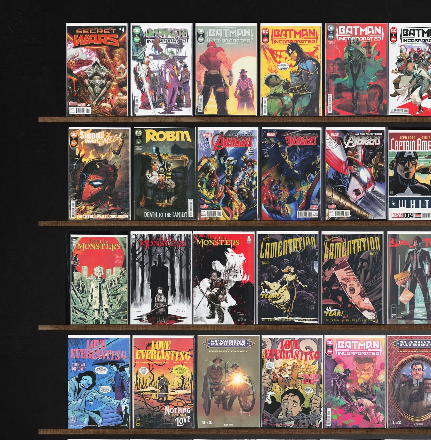 Manhunter, Little Monsters, Batman Incorporated, Robin, Ka Zar The Savage, Love Everlasting, Maskerade, Unstoppable Doom Patrol, Captain America: White, Blood Tree, John Flood, Low, Nightwalkers, Order & Outrage, Gilgamesh Ii, All New, All Different Avengers, Deadshot, Lamentation, Josif 1957, Sunshine Patriots!, Secret Wars
