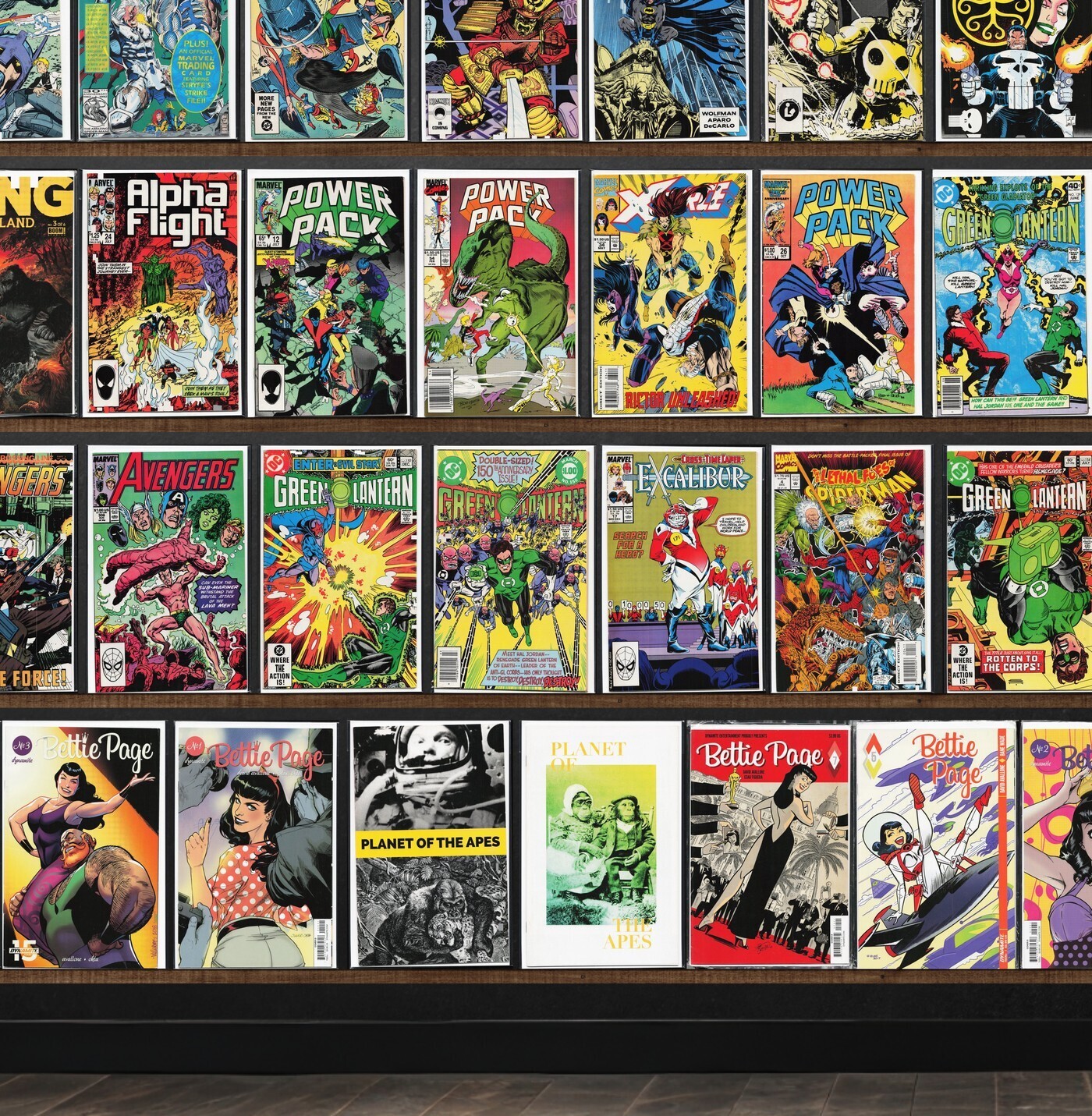 Power Pack, Green Lantern, Alpha Flight, Bettie Page, The Avengers, X-Force, Batman, Thor, Rom, Action Comics Weekly, Ka (2014 Marvel), Marvel Team Up, Darkman, Marvel Comics Presents, Cable, Namor, The Sub Mariner, What The ?!, All Star Squadron, The Punisher, Vanguard Illustrated, Soleil Sampler (2008), What If...?, The Expanse, Excalibur, Marvelman Family'S Finest, Starslayer, Fantastic Four, The Uncanny X-Men, Daredevil, The Flash