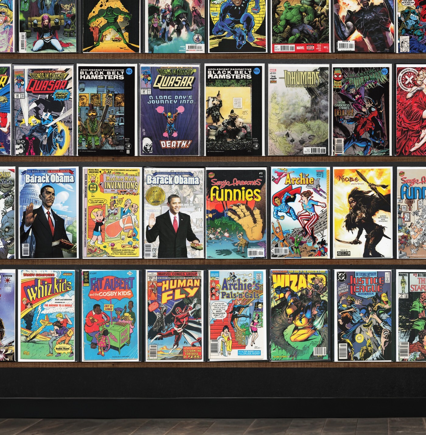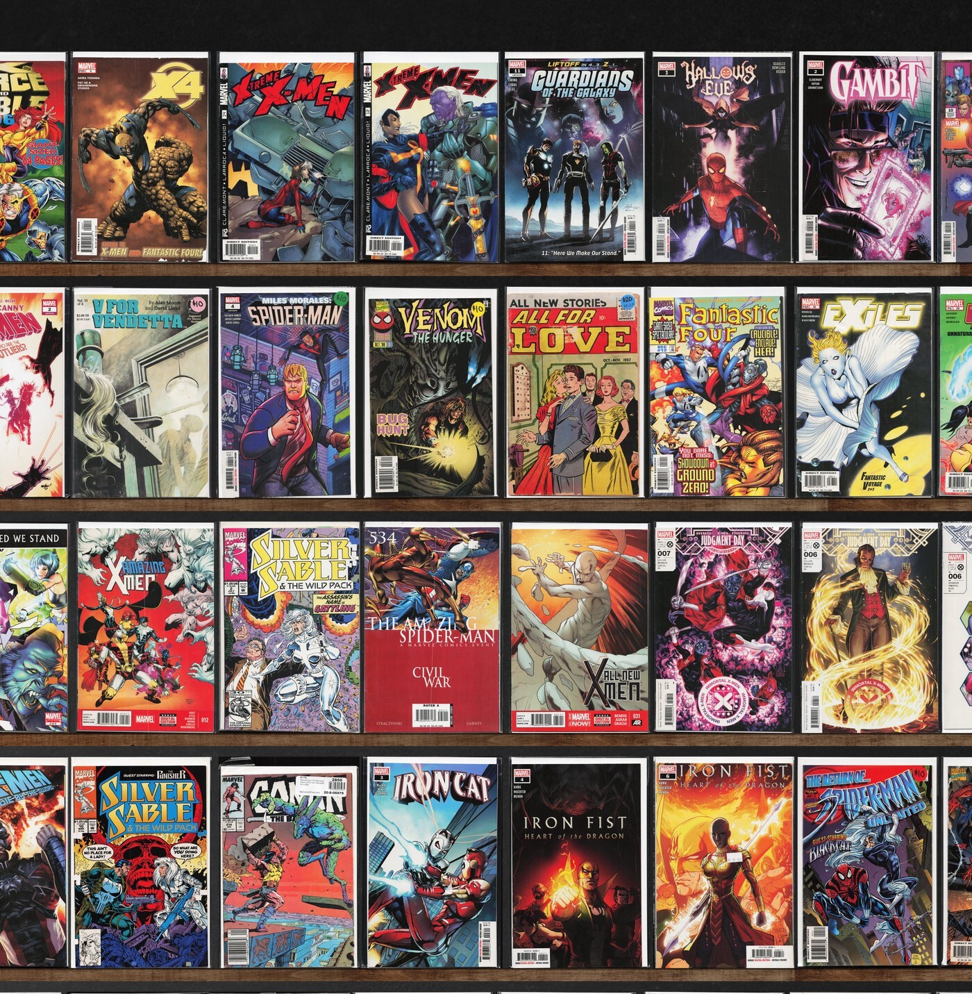 Quasar, Hellions, Excalibur, The H.A.R.D. Corps, Magnus Robot Fighter, Gambit, The Spectacular Spider-Man, Immortal X-Men, All New X-Men, Ultimate X-Men, Wolverine, X-Men/Fantastic Four, X-Treme X-Men, Batman/Superman: World'S Finest, Fantastic Four, Exiles, X-Men, The Amazing Spider-Man, Legion Of X, Spider-Man, Heroes Reborn, Sergio Aragonés Funnies, The Transformers, Captain America, Sub Mariner, Avengers West Coast, Thor, Wolverine: Soultaker, The Uncanny X-Men, X-Men: Colossus Bloodline, Hallows' Eve, The Maxx, Prophet, The Mighty Magnor, Shang Chi, X-Force, Uncanny X-Men, V For Vendetta, Miles Morales: Spider-Man, Venom: The Hunger, All For Love, Avengers, What If...?, Iron Man, New Avengers, Amazing X-Men, Nightcrawler, Haywire, Barack Panther (2018), Hulk, Conan The Barbarian, Iron Cat, Spider-Man Unlimited, The Incredible Hulk, Avengers: Twilight, Barack Obama, Richie Rich Inventions, Archie, Super Powers!, Fat Albert, The Human Fly, Justice League America, The Last Starfighter, X-Men Adventures, Daredevil, Red Sonja