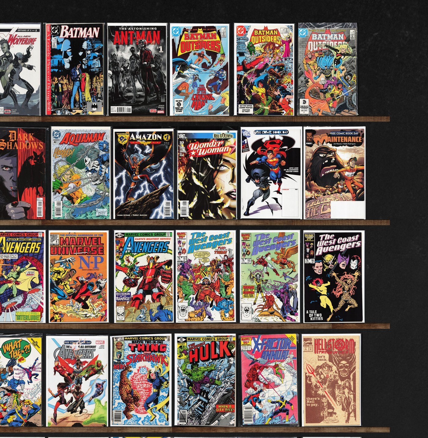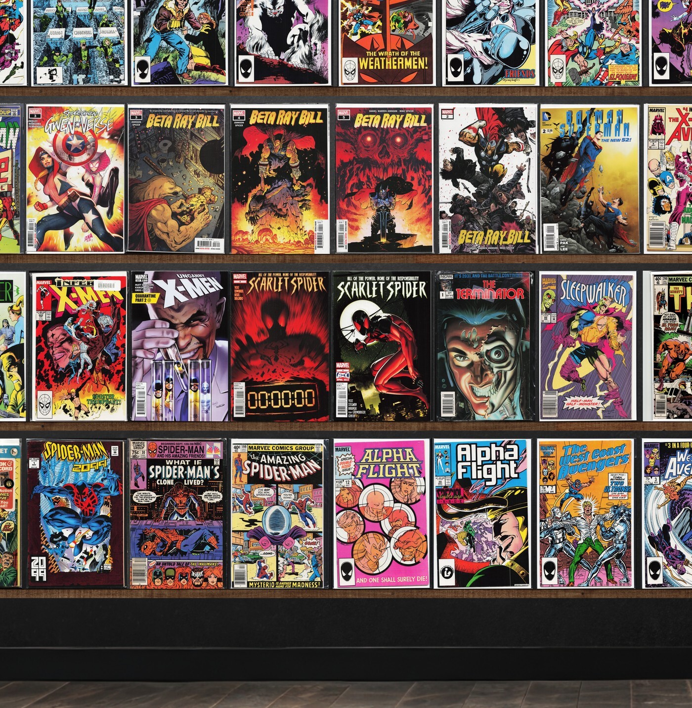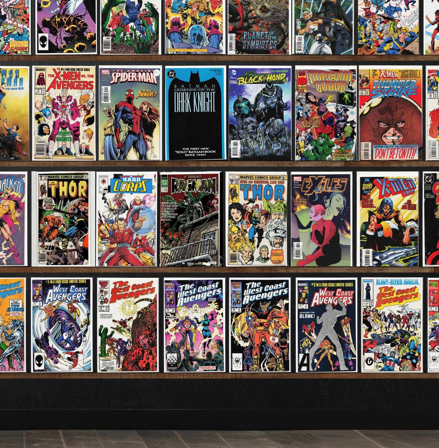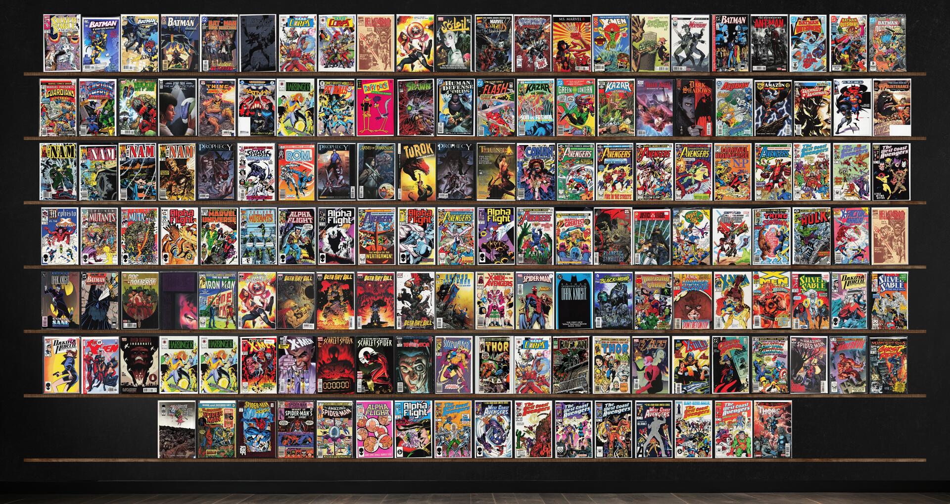 West Coast Avengers, The Avengers, Alpha Flight, The 'Nam, Beta Ray Bill, The H.A.R.D. Corps, Harbinger, Prophecy, The New Mutants, The Amazing Spider-Man, Batman Confidential, Spider-Gwen: Gwenverse, Batman, Captain America, Marvel Two In One, Ka Zar The Savage, Green Lantern, Dakota North, The Uncanny X-Men, Scarlet Spider, Thor, Detective Comics, Batman: Dark Detective, Magnus Robot Fighter, Soleil Sampler (2008), Shadowhawk, Ms. Marvel, X-Men Adventures, All New Wolverine, The Astonishing Ant Man, Marvel Presents, Hulked Out Heroes, Daffy Duck, Spawn, Human Defense Corps, The Flash, Dark Shadows, Aquaman, Amazon (1996) Amazon, Wonder Woman, Tomorrow Stories, Rom, Army Of Darkness, Turok: Dinosaur Hunter, Thun'Da, Conan The Barbarian, Mephisto Vs. ..., Marvel'S Greatest Comics, What The ?!, The Incredible Hulk, X-Factor Annual, Poe Dameron, Magneto, Iron Man, Thunderstrike, X-Men, X-Men Unlimited, X-Treme X-Men, Red Skull, The Terminator, Sleepwalker, Ragman, Exiles, X-Men 2099, Crimson Avenger, Daredevil, Ghost Rider, Spider-Man 2099, What If?, Thors