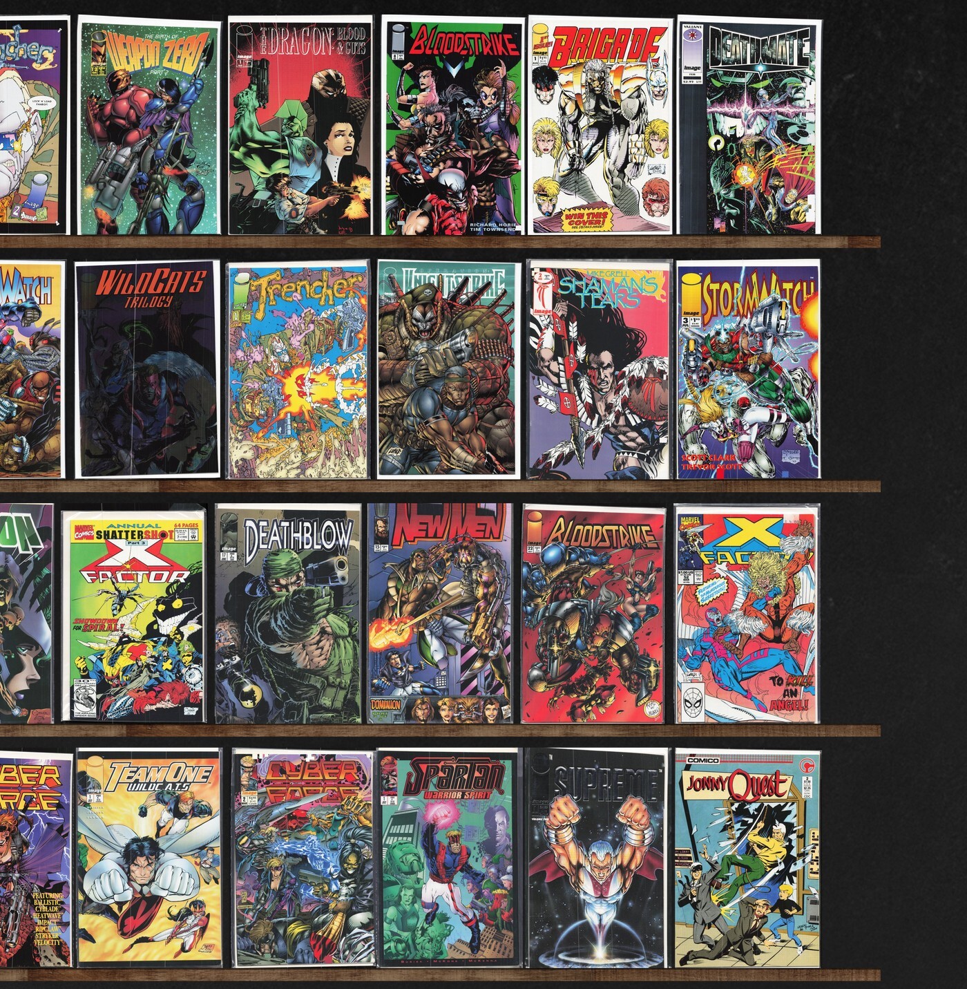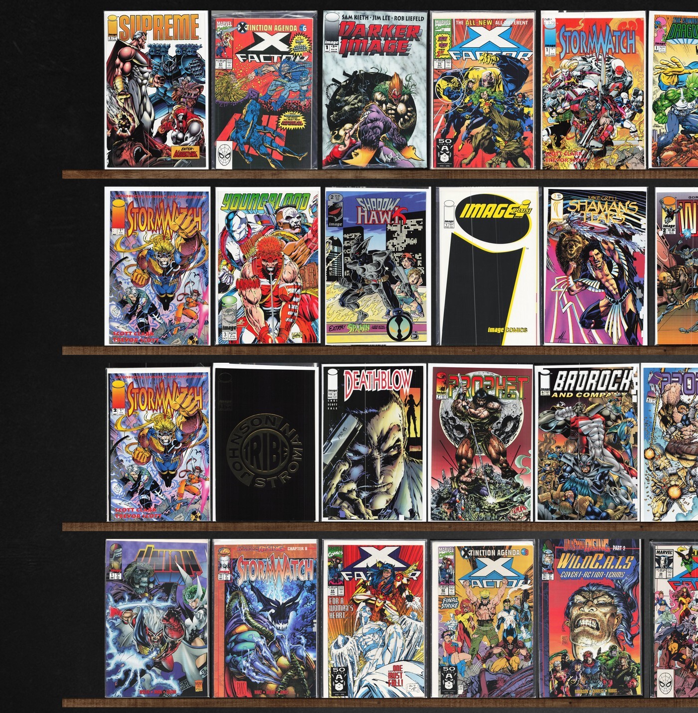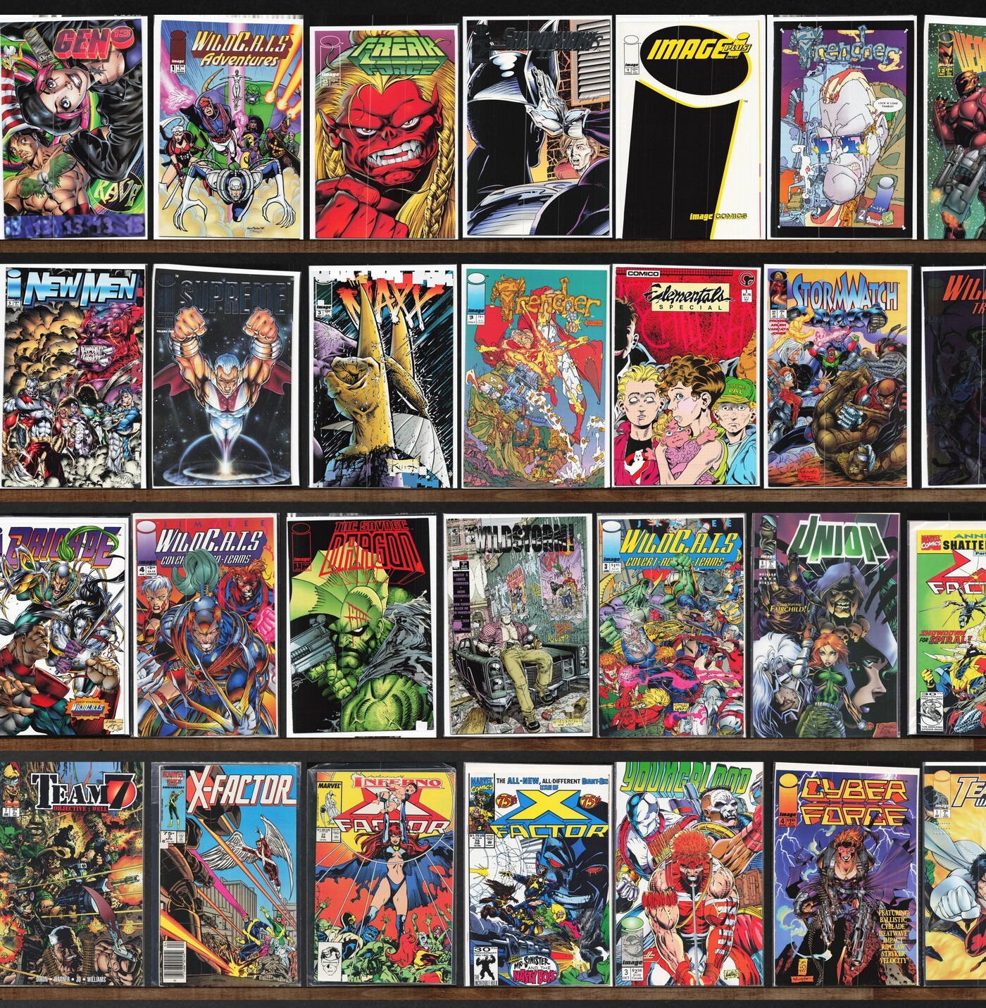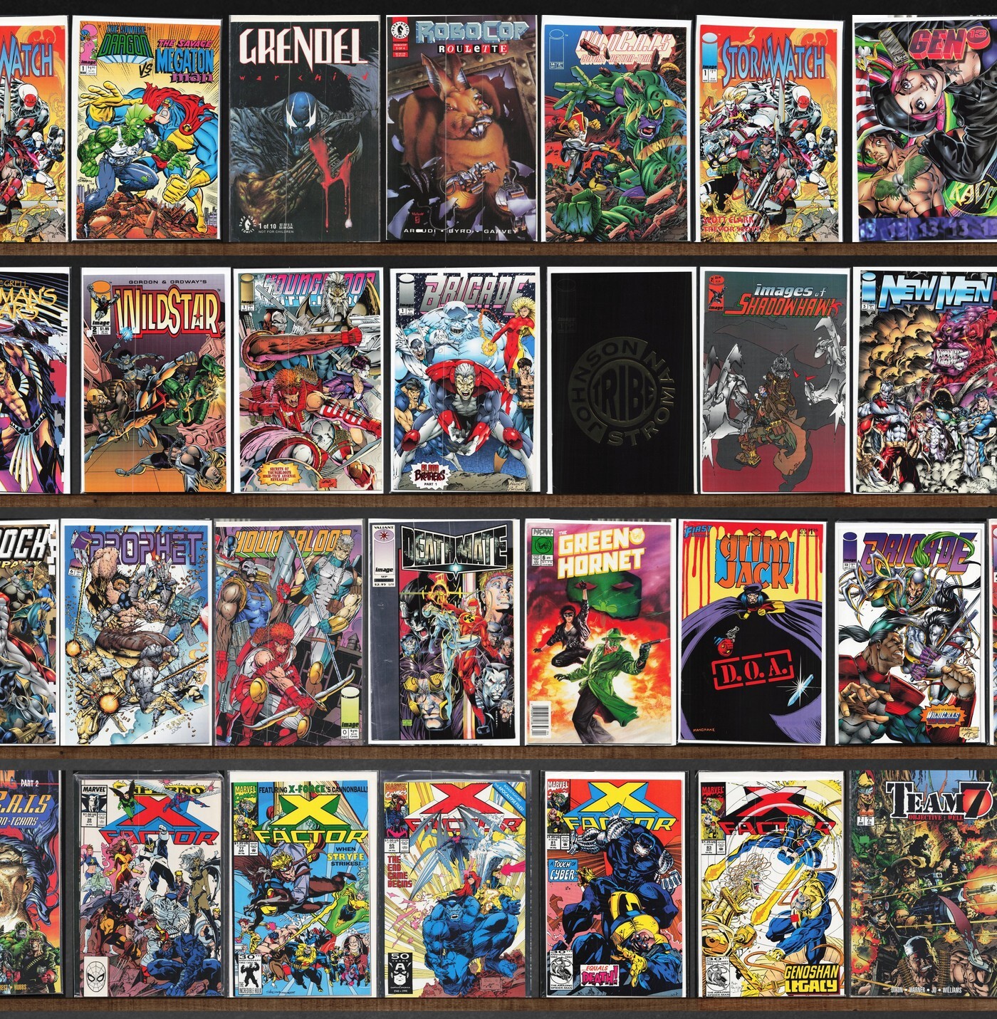 X-Factor, Stormwatch, Brigade, Deathmate, Trencher, Bloodstrike, Youngblood, Cyberforce, Image Plus (1993), Weapon Zero, Shaman'S Tears, Tribe, Newmen, The Malibu Sun, Deathblow, Prophet, The Green Hornet, Savage Dragon, Union, X-Factor Annual, Shadowhawk Iii, Backlash, Grendel: War Child, Robocop: Roulette, Wildc.A.T.S Adventures, Freak Force, Shadowhawk Ii, Shadowhawk, Wildstar: Sky Zero, Youngblood Battlezone, Images Of Shadowhawk, The Maxx, Elementals Special, Wildc.A.T.S Trilogy, Operation: Knightstrike, Badrock & Company, Grimjack, Wildstorm!, Team One: Wildc.A.T.S, Cyber Force, Spartan: Warrior Spirit, Jonny Quest, Deathlok, Grifter, Eternal Warrior, Predator: Race War, Superpatriot, The Maxx: Maxximized, Team Youngblood, Wildc.A.T.S Special (1993), Aster, Judgment Day, Cain, Violator Vs. Badrock, Re Animator