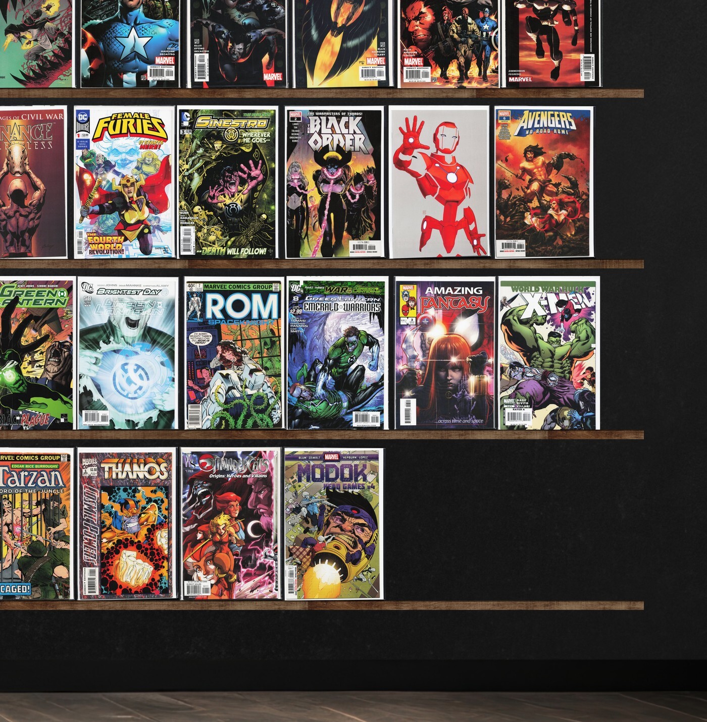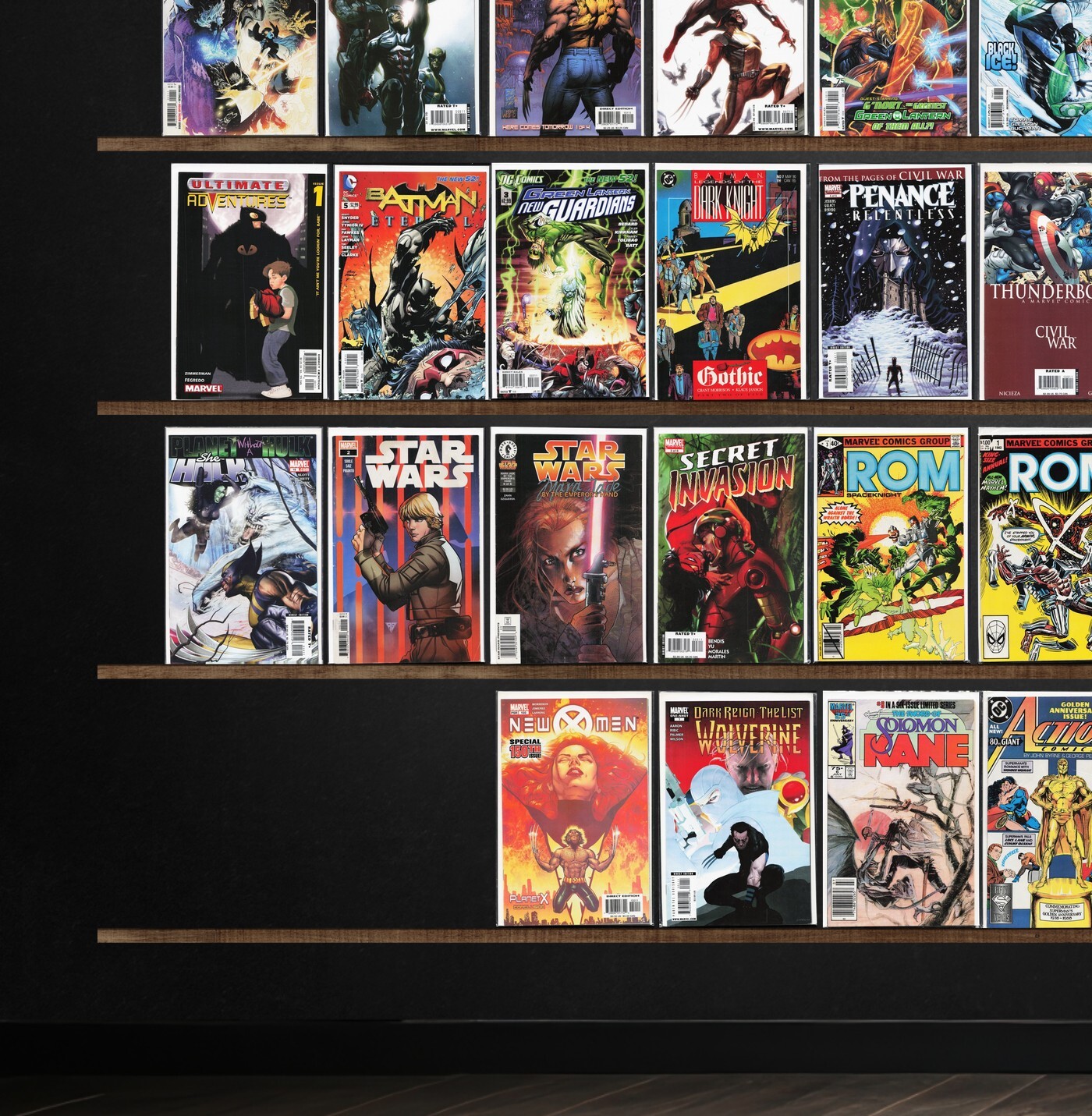 Alf, New X-Men, Squadron Supreme, Green Lantern, Green Lantern Corps, Penance, Secret Invasion, Black Order, Larfleeze, Thunderbolts, Ultimate Nightmare, She Hulk, Amazing Fantasy, Thanos, Witches, Ultimate Adventures, Rom, M.O.D.O.K.: Head Games, Punisher 2099, Wolverine/Hulk, Avengers, Blackest Night, Ultimates, Terror Inc., Batman Eternal, Female Furies, Sinestro, Star Wars, Rom Annual, Action Comics, Batman Confidential, Red Lanterns, Two Gun Kid, U.S. 1, Warheads, X-51, Tarzan Annual, Tarzan, Cosmic Powers
