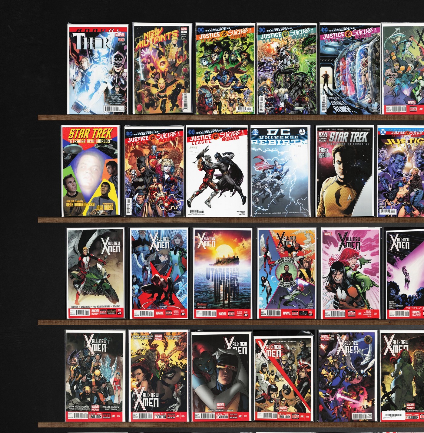 All New X-Men, Hellblazer, H E R O, Fables, Powers Of X, Batman '66, Justice League, New Super Man, Suicide Squad, Daredevil, Outsiders, New Mutants, Uncanny X-Men, X-Men, Faster Than Light, Metal Men, Justice League Odyssey, Thor, Astonishing X-Men, Captain America, The New Titans, Teen Titans Spotlight, The Outsiders