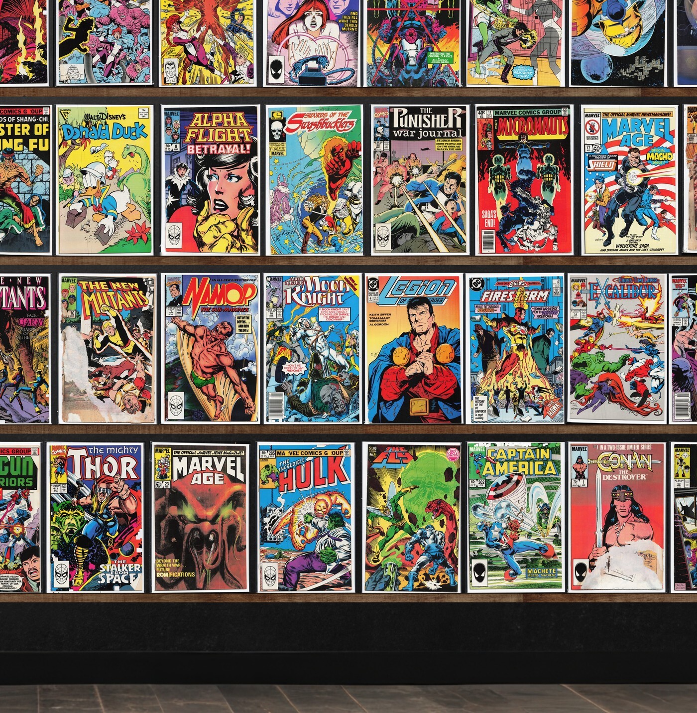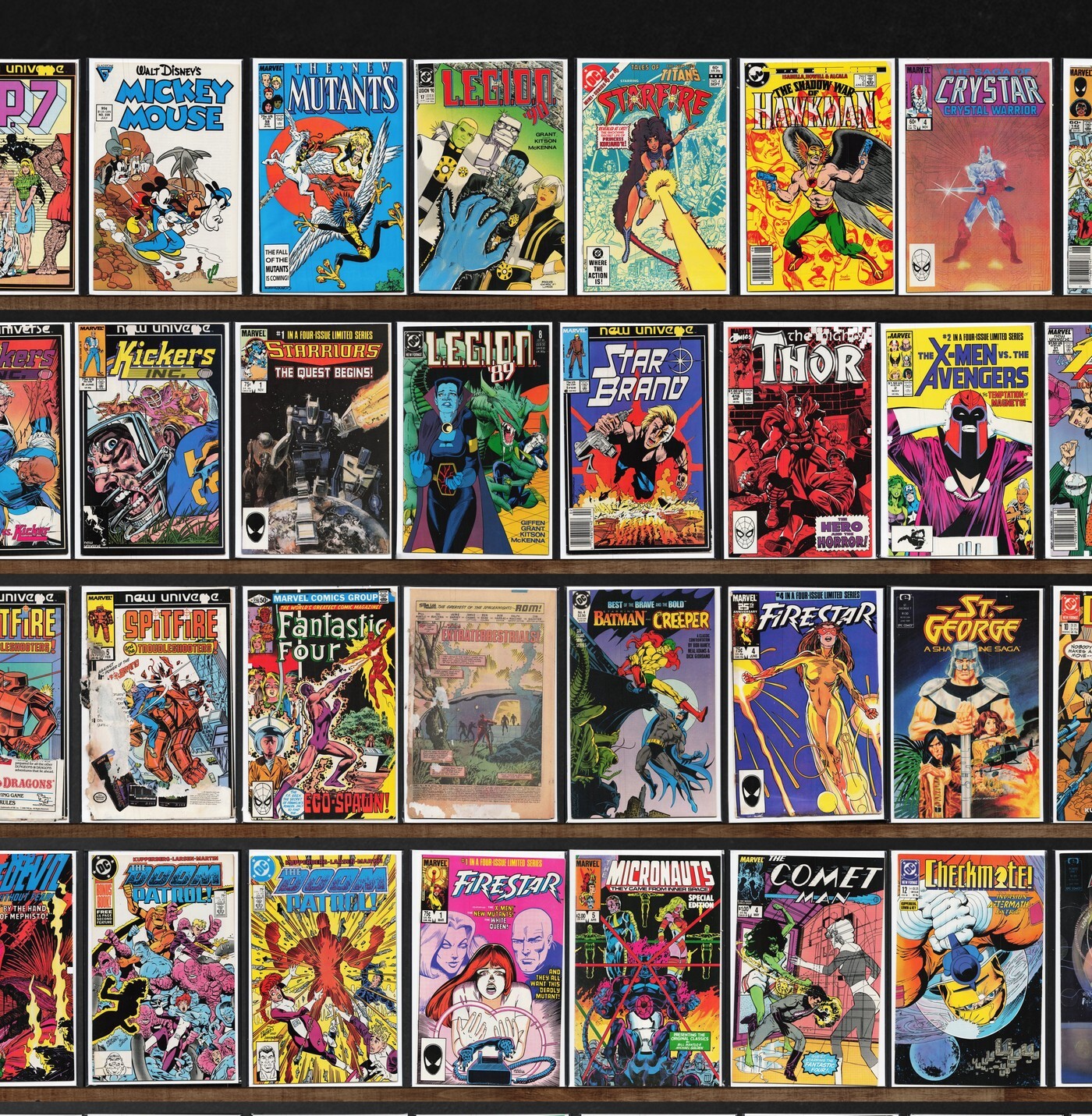 Alpha Flight, The Avengers, Rom, The Defenders, Kickers, Inc., Mickey Mouse, The New Mutants, Fantastic Four, Conan The King, Suicide Squad, L.E.G.I.O.N., Marvel Team Up, Conan The Barbarian, Excalibur, Doom Patrol, Marvel Age, Time Masters, D.P.7, The Mighty Thor, Marvel Comics Presents, Namor, The Sub Mariner, Firestar, Checkmate, Thor, The Punisher, X-Factor, Starman, The Thing, Ka Zar The Savage, Hero, Justice, Starriors, Star Brand, Psi Force, The Shadow Strikes, St. George, Cosmic Boy, The Pink Panther, Doctor Zero, Avengers West Coast, Secret Origins, Daredevil, Micronauts: Special Edition, Comet Man, Powerline, Marvel Two In One, Spellbound, The Phantom, Team America, Donald Duck, Micronauts, Iron Man, Classic X-Men, Tarzan, She Hulk: Ceremony, Quasar, Amazing Heroes, Legion Of Super Heroes, Silverhawks, Superman, Uncle Scrooge, Shogun Warriors, The Incredible Hulk, The Fly, Captain America, Conan The Destroyer, The Falcon