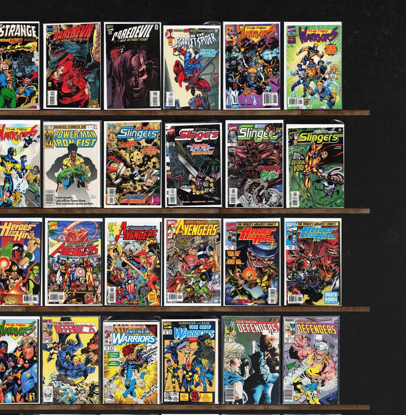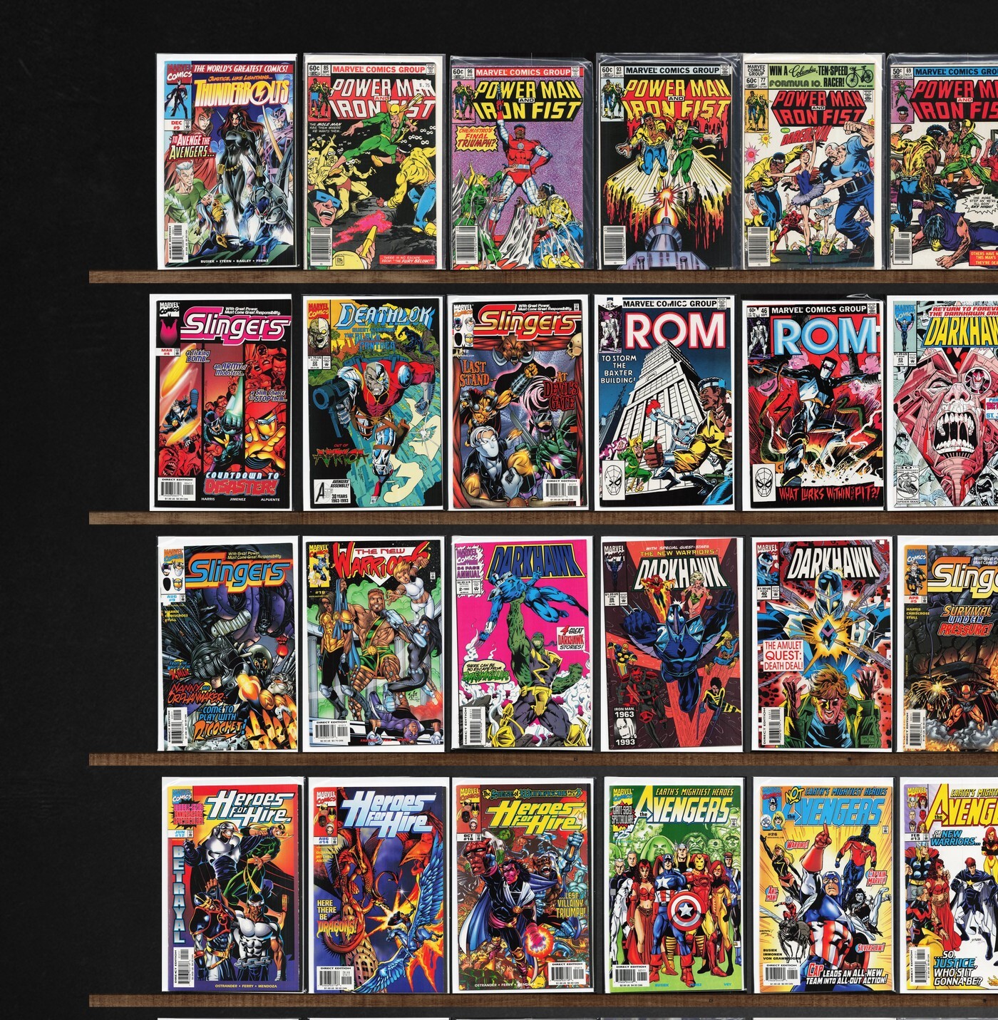 Avengers, The Defenders, Slingers, Heroes For Hire, The New Warriors, Darkhawk, The Amazing Spider-Man, Daredevil, Deathlok, Thor, The Avengers, Domination Factor: Avengers, Rom, Captain Marvel, Dazzler, Scarlet Witch, Thunderbolts, The Shroud, Darkhawk Annual, Iron Man, Savage Dragon/Marshal Law