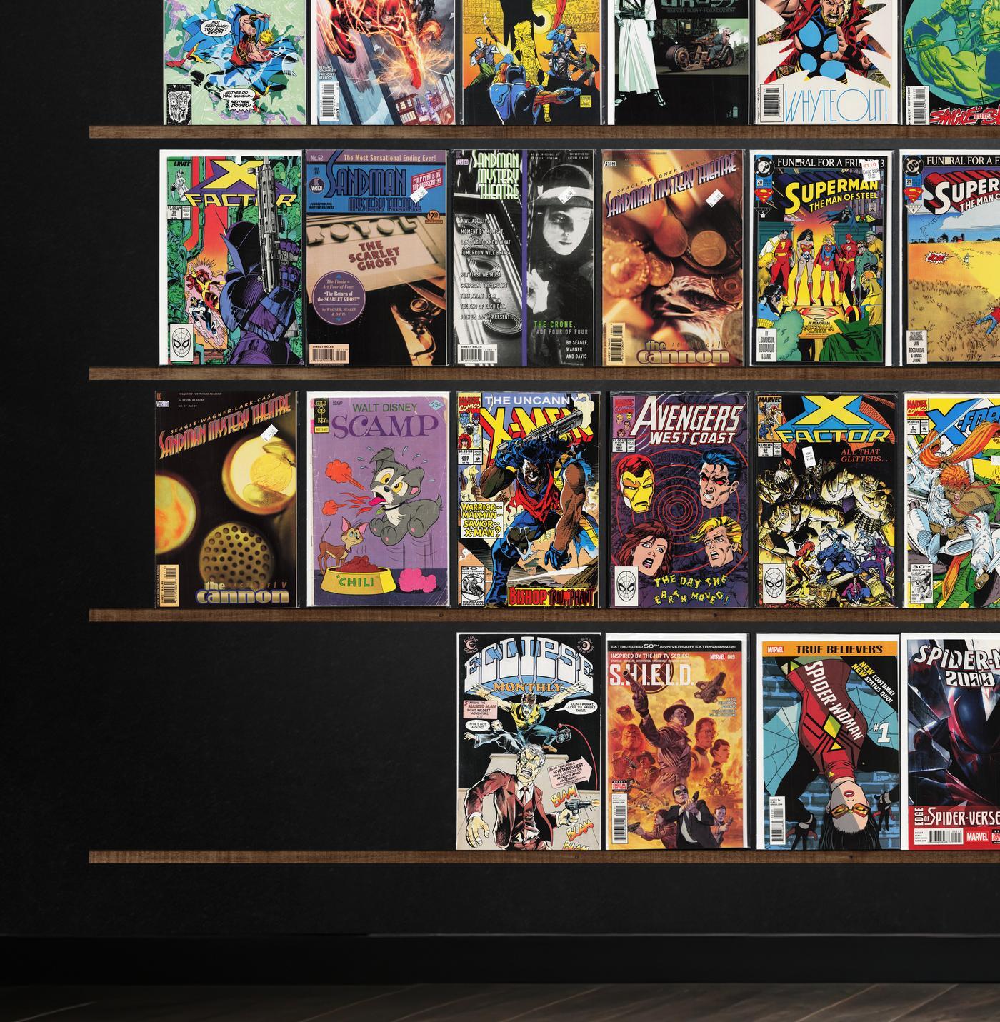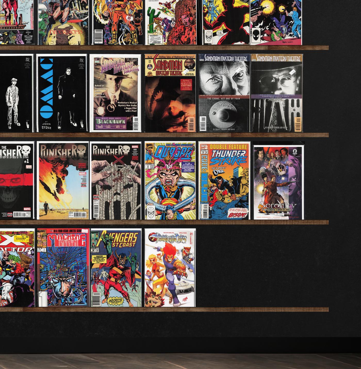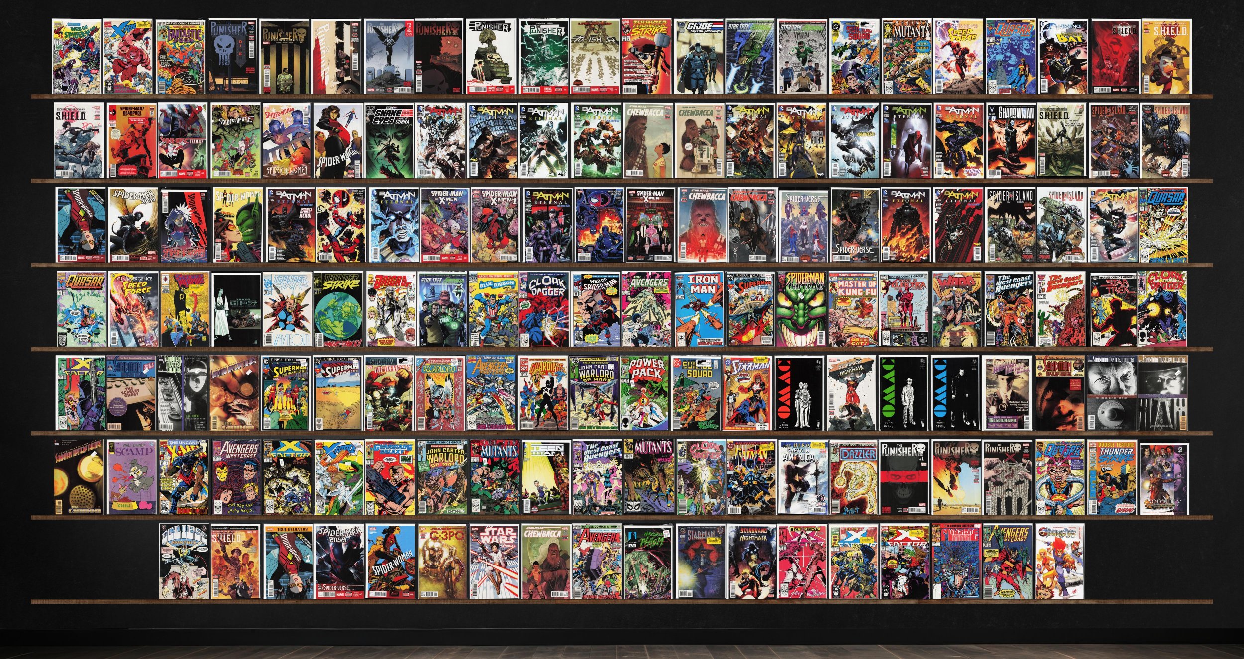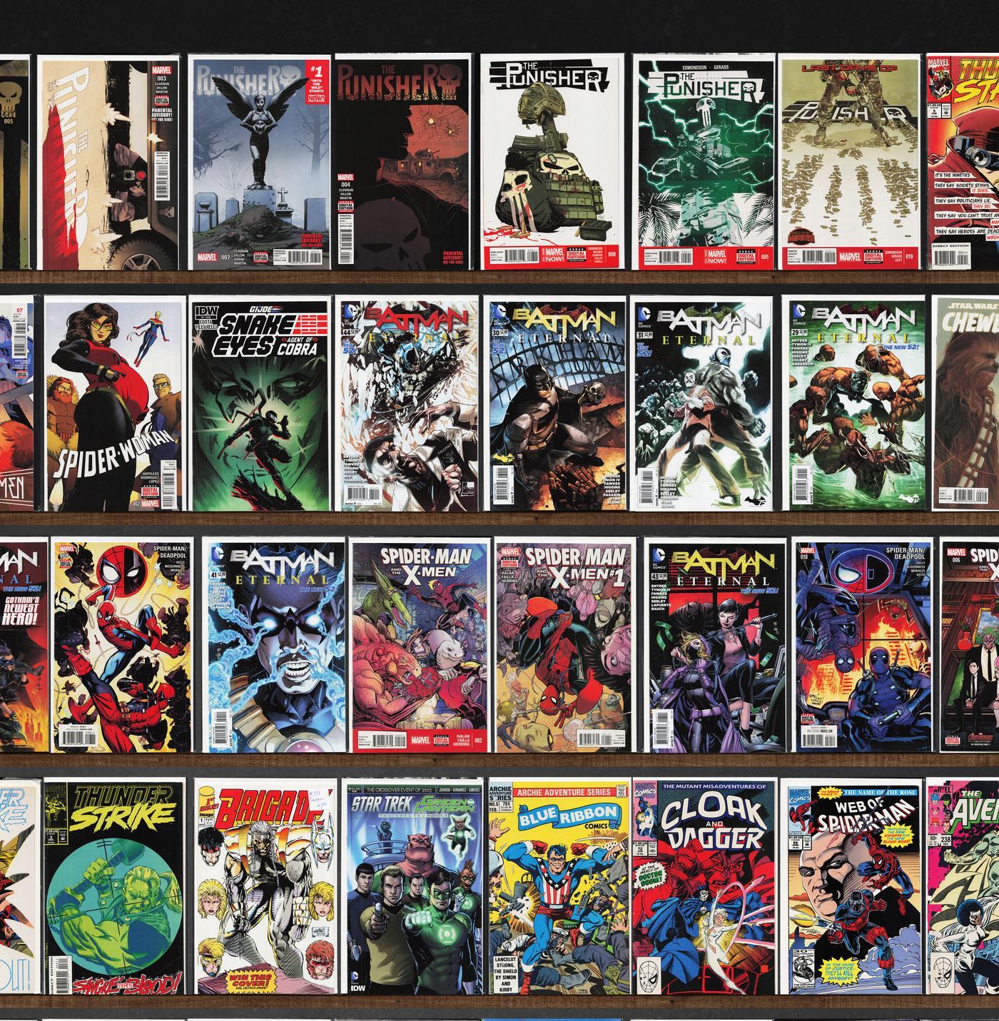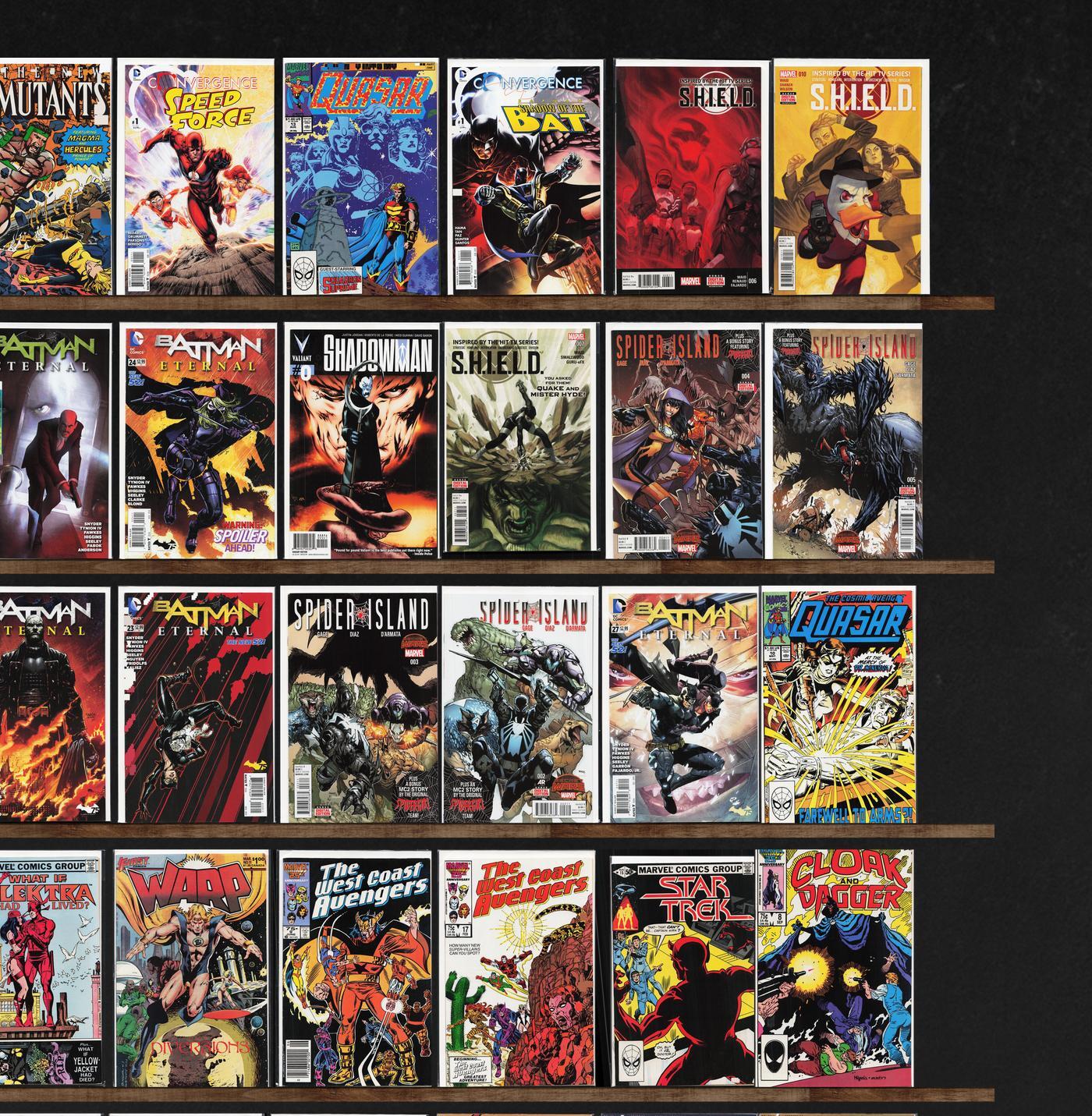 Batman Eternal, The Punisher, Sandman Mystery Theatre, Spider-Woman, S.H.I.E.L.D., Chewbacca, X-Factor, Quasar, Spider-Island, Thunderstrike, Star Trek/Green Lantern, The New Mutants, Spider-Man/Deadpool, Spider-Verse, West Coast Avengers, Web Of Spider-Man, X-Force, Suicide Squad, Convergence Speed Force, Spider-Man 2099, The Avengers, Cloak And Dagger, Starman, Starbrand & Nightmask, Avengers West Coast, Marvel&, Spider-Verse Team Up, Shadowman, Secret Weapons, Tokyo Ghost, Brigade, Blue Ribbon Comics, Iron Man, Superman, Spider-Man: Chapter One, What If?, Warp, Star Trek, Thunderbolts, Warlord, Power Pack, Scamp, The Uncanny X-Men, Teen Titans, Batman, Captain America, Dazzler, Eclipse Monthly, Star Wars Annual, Warriors Of Plasm, Machine Man, Thundercats