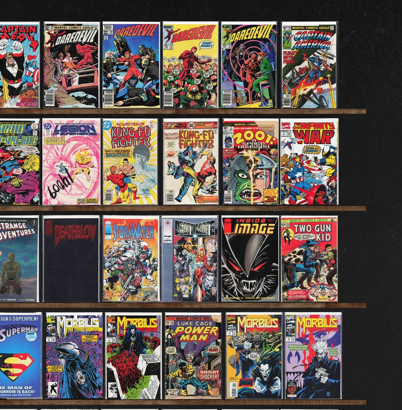 Captain America, Action Comics, Daredevil, Ghost Rider, Ravage 2099, Power Man, Rom, The Punisher 2099, Nightstalkers, Turok, Dinosaur Hunter, Strange Sports Stories, Darkhawk, Pitt, Justice League America, Superman, Moon Knight, Harbinger, Captain America Annual, Superboy, Legion Of Super Heroes, The Infinity War, The New Warriors, Shadowhawk, Champion Sports, Hawkman, Vigilante, Claw The Unconquered, Strange Adventures, Deathblow, Stormwatch, Deathmate, Inside Image, Two Gun Kid, The Punisher, Lois Lane, Power Pack, Youngblood, Justice League Odyssey, Cage, Aliens Vs. Predator