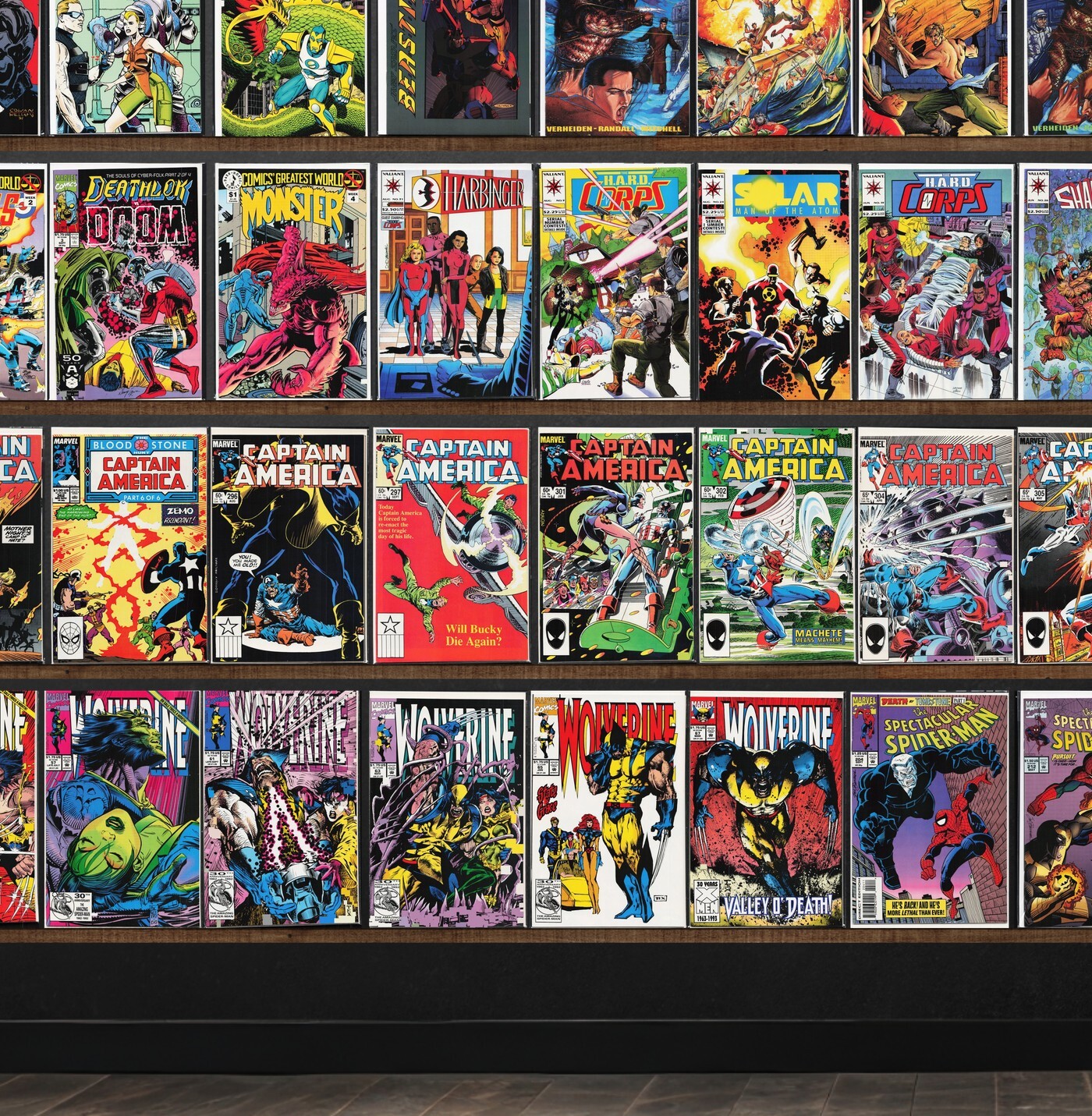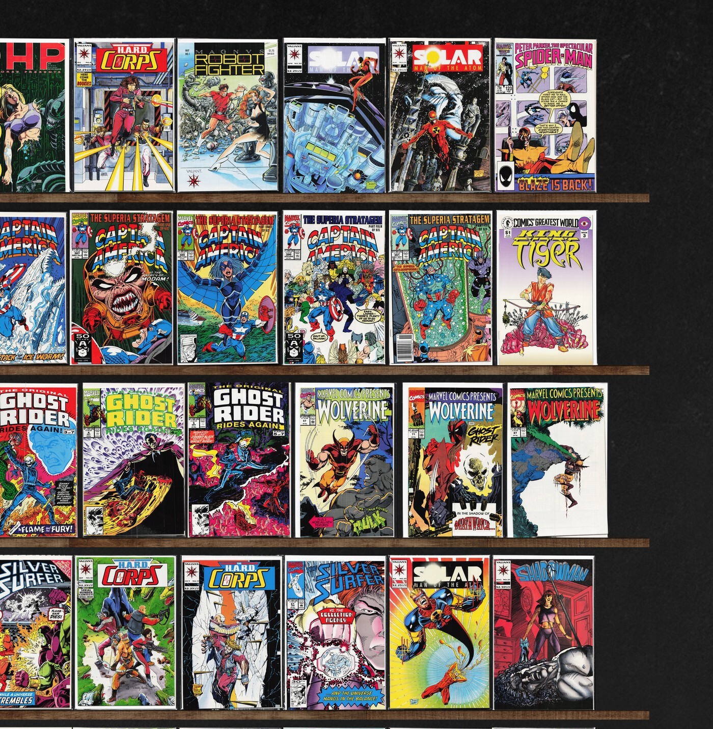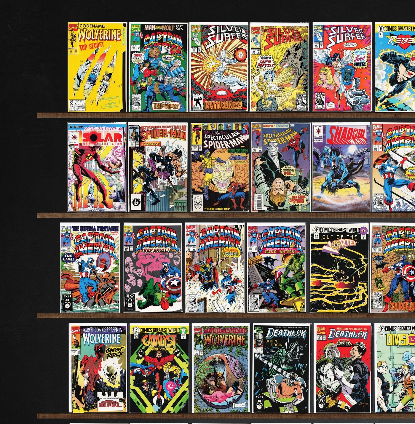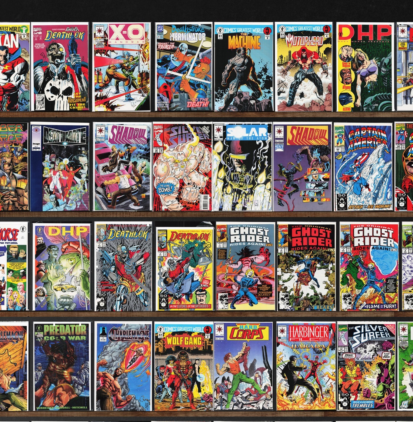Captain America, Wolverine, The H.A.R.D. Corps, Shadowman, The Spectacular Spider-Man, Silver Surfer, Deathlok, Marvel Comics Presents, Dark Horse Presents, Charlemagne, Predator: Cold War, The Amazing Spider-Man, X-O Manowar, Deathstroke The Terminator, Magnus Robot Fighter, Cyber Force, Deathmate, Dreadstar, B.E.A.S.T.I.E.S. (1994) B.E.A.S.T.I.E.S., Harbinger Files, Harbinger, Spider-Man, The Uncanny X-Men, X-Men, What If...?, Spider-Man Classics, Showcase, Action Comics