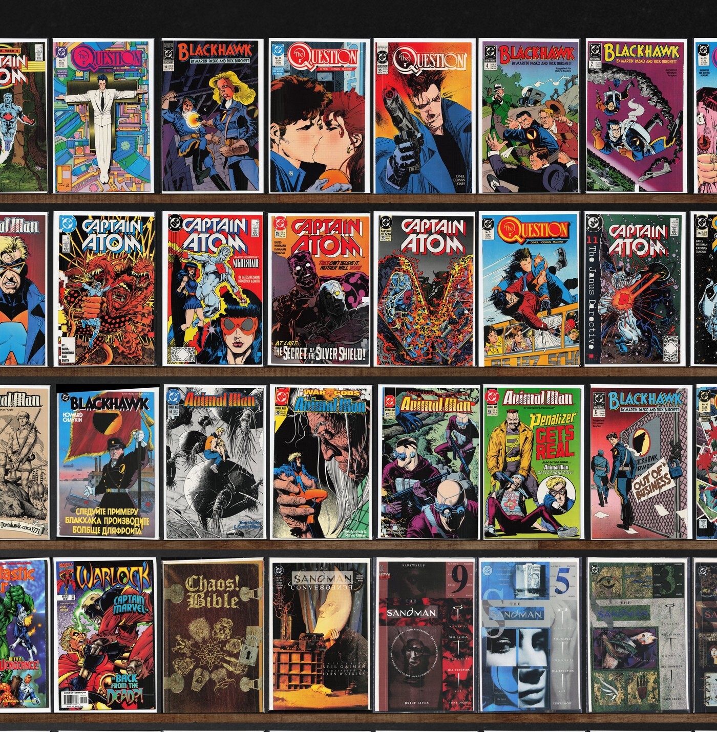 Captain Atom, Animal Man, Blackhawk, The Sandman, The Question, Black Condor, Action Comics, The Ray, Suicide Squad, Dazzler, Deadshot, The Question Annual, The Kents, X-Force, Fantastic Four, Warlock, Chaos Bible ( ... Read More