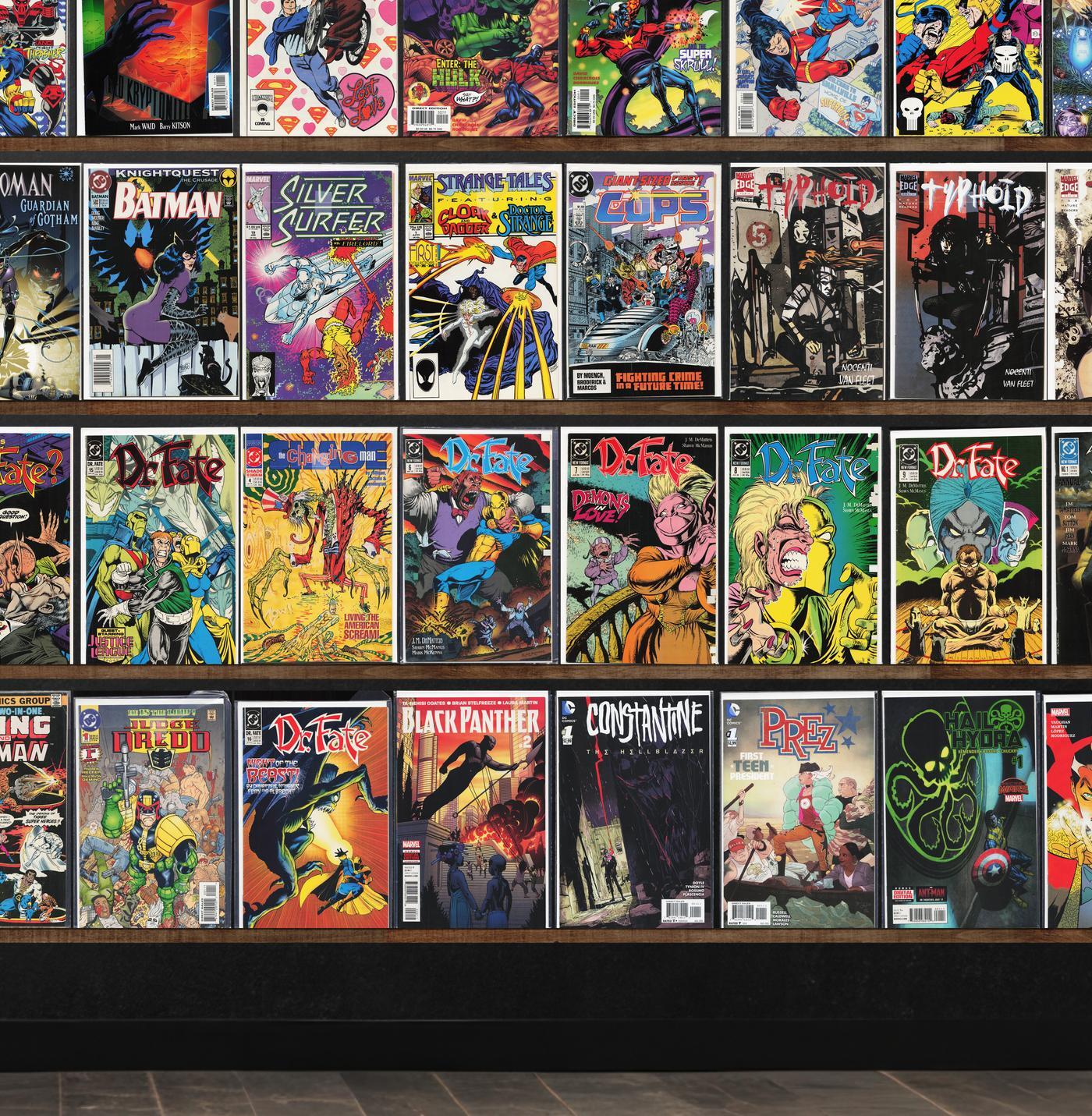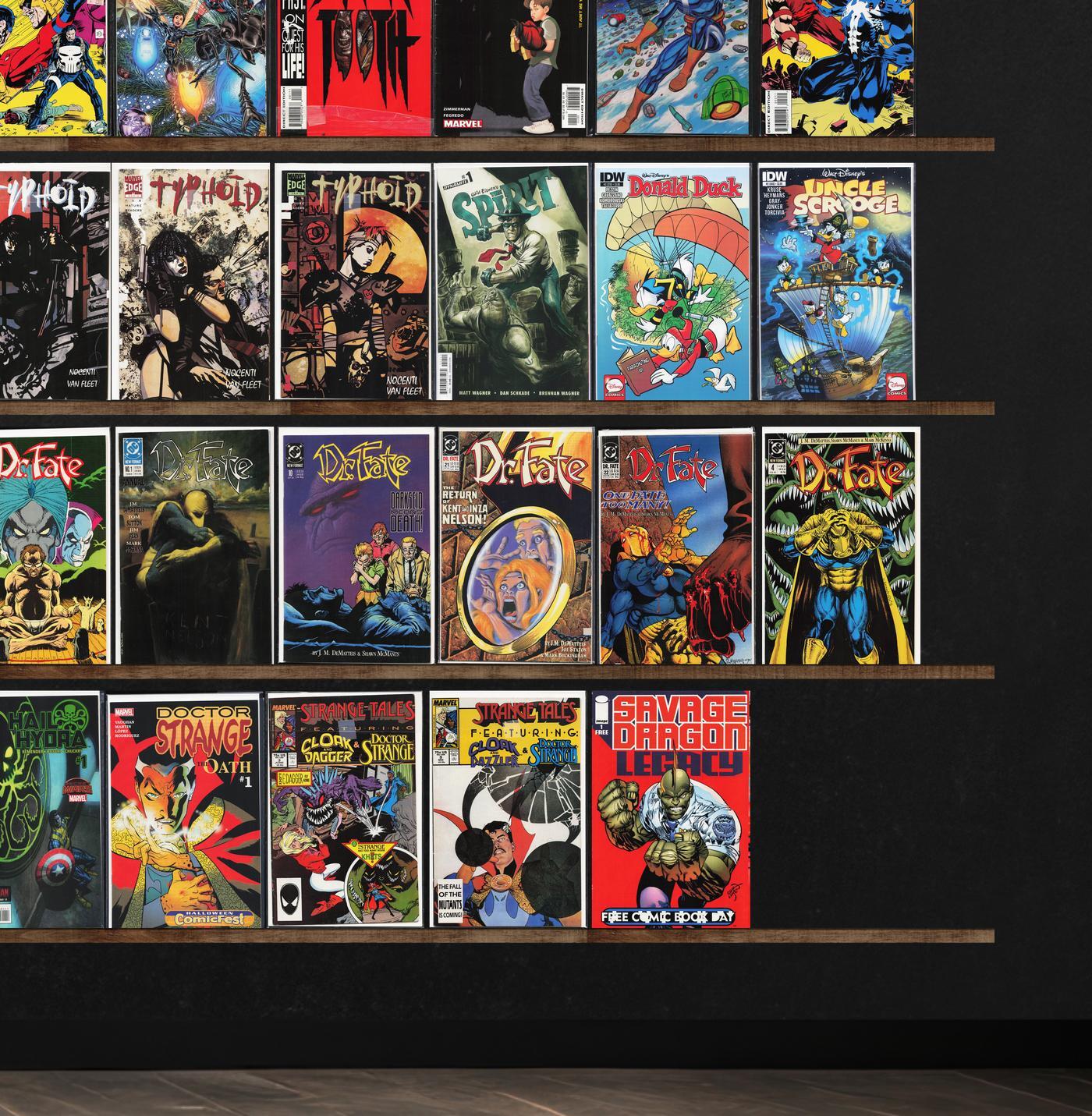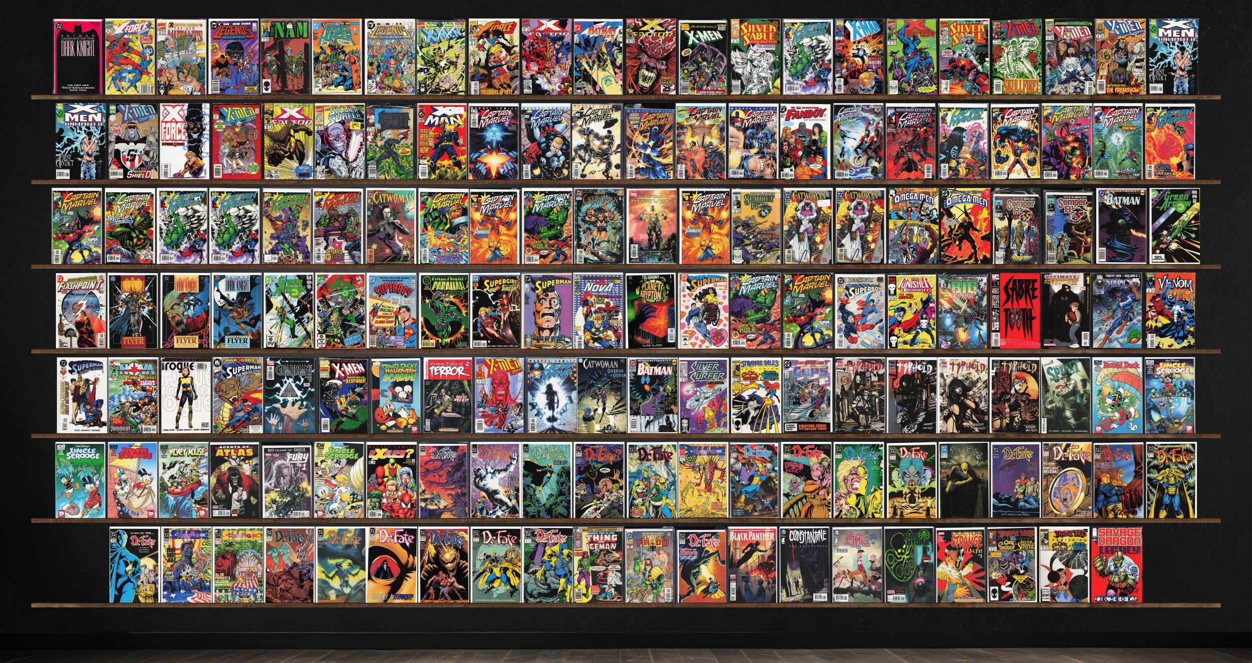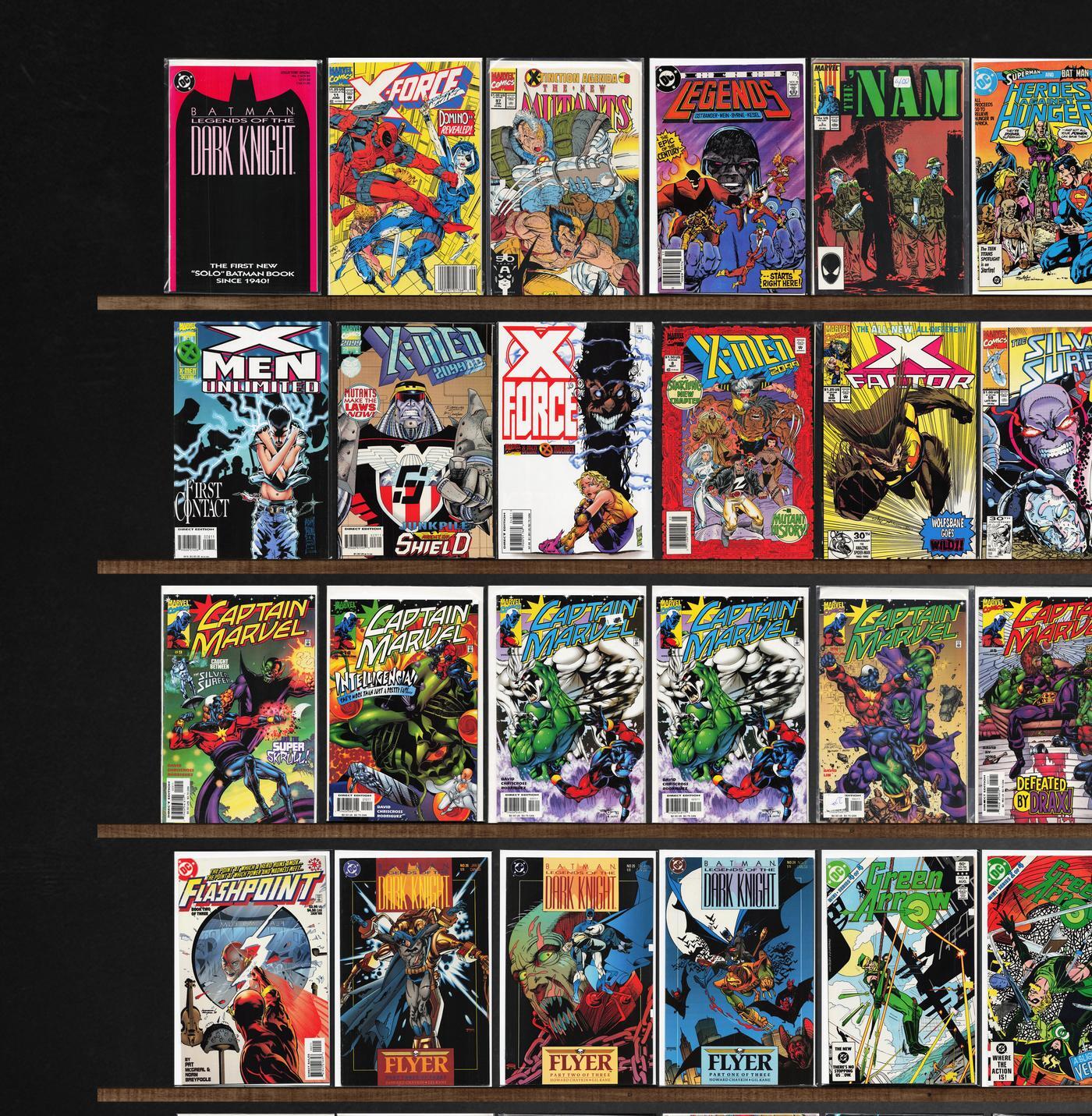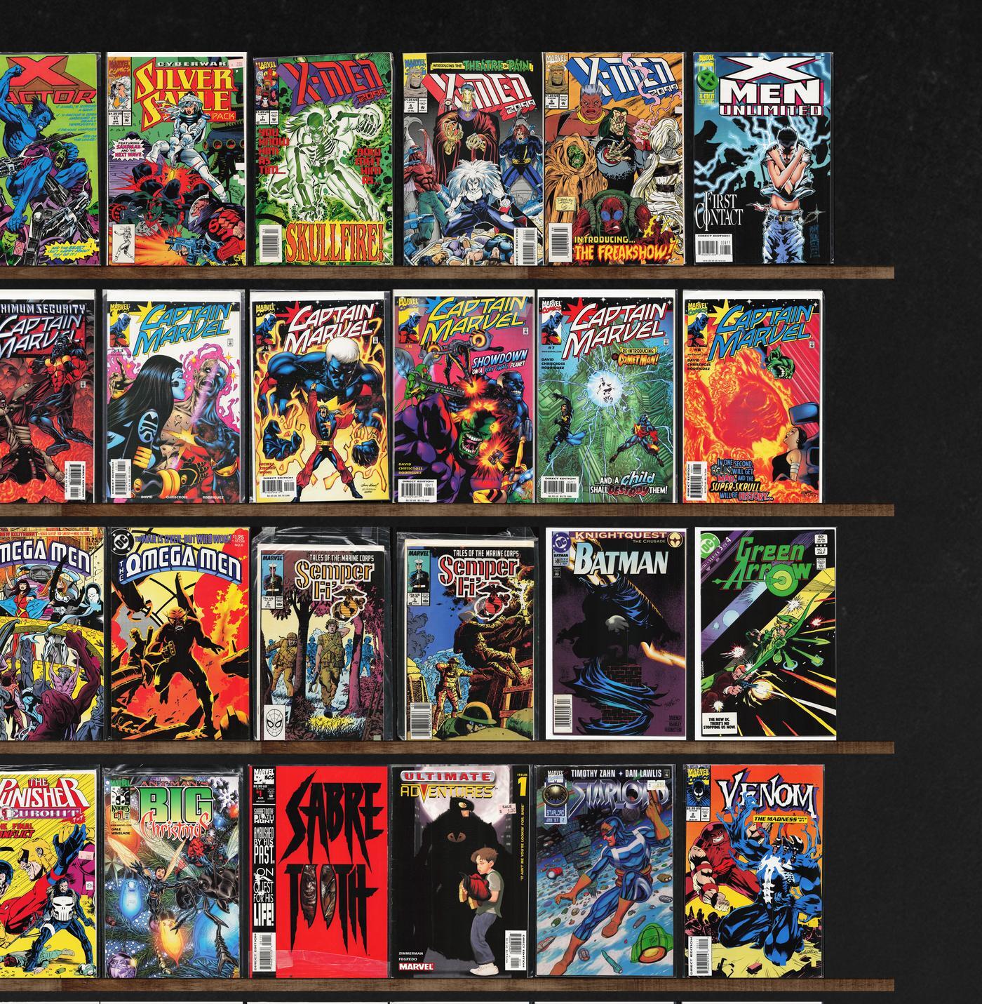 Captain Marvel, Doctor Fate, X-Men 2099, X-Factor, Typhoid, Uncle Scrooge, X-Force, Batman, Catwoman, Semper Fi, Green Arrow, Strange Tales, Legends, X-Men Annual, X-Man, X-Men Unlimited, Silver Surfer, The Omega Men, Superman, Nova, The New Mutants, The 'Nam, Fanboy, Catwoman Annual, Flashpoint, Superboy, The Punisher, Sabretooth, Ultimate Adventures, Starlord, Venom: The Madness, Rogue, Guardians, Cops, Donald Duck, Mickey Mouse, Exiles, Marvel Two In One, Judge Dredd, Black Panther, Constantine: The Hellblazer, Prez, Hail Hydra