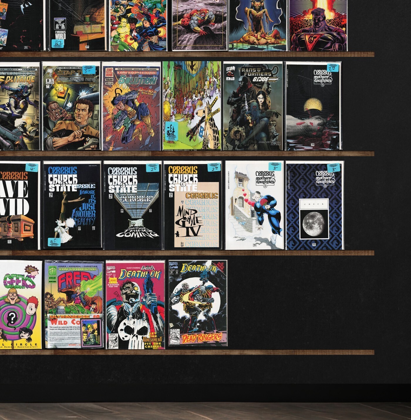 Cerebus (1977 2004 Aardvark Vanaheim), Deathlok, Prototype, Prime, Will To Power, Cerebus, The Strangers, Sludge, Freex, The Spectre, Lady Justice, Hardcase, Comics&, Badger: Shattered Mirror, Egypt, Solution, War Dancer, Mantra, Touch Of Death, The Good Guys, Break Thru, Dreadstar, Q Unit (1993) Q Unit, Madman Comics, The Crusades, The Haunted, Neil Gaiman&, Atlas, Trekker, Deadenders, Outsiders, Accident Man, Fighting American, Showcase &, Hawkman, Spider-Woman, The Malibu Sun, Rune, Firearm, The Night Man, Solitaire, Dragon Arms, Bone, Nightjar, Echo Of Futurepast, The Mighty Mites, Ruse