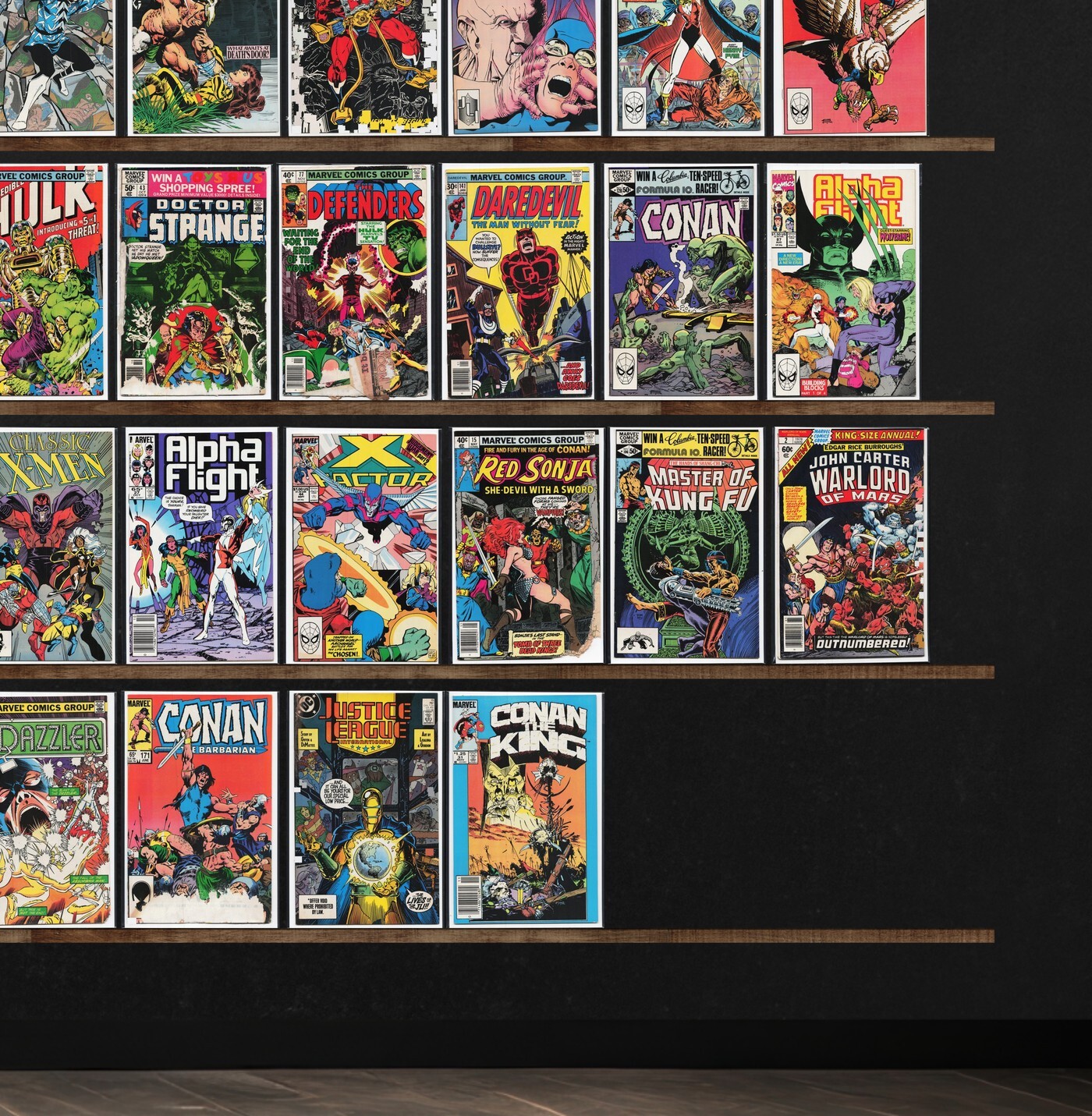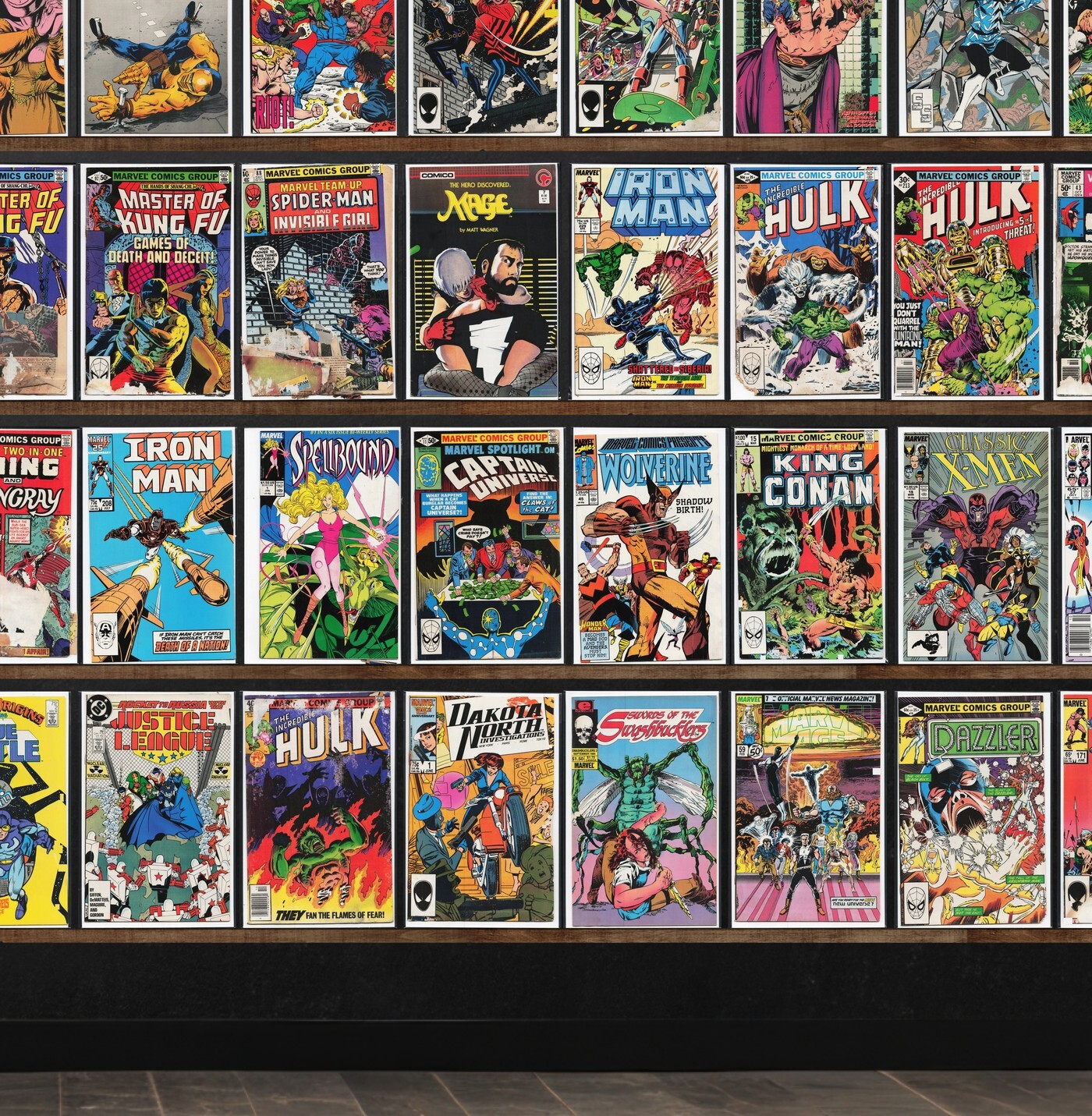 Conan The Barbarian, Alpha Flight, Captain America, Micronauts, Iron Man, The Incredible Hulk, The Defenders, Checkmate, Power Pack, Marvel Comics Presents, Marvel Team Up, Suicide Squad, Dazzler, The New Mutants, The Thing, Silver Surfer, Daredevil, Cloak And Dagger, Justice, Tarzan, Conan The King, Moonshadow, Doctor Fate, Cremator: Hell&, Strange Tales, D.P.7, Justice League International, Red Sonja, Visionaries, Mark Hazzard: Merc, Avengers Spotlight, The Shadow Strikes, Star Trek, Justice League Europe, Dreadstar And Company, Balder The Brave, Swamp Thing, The War, Shadowmasters, Quasar, Nathaniel Dusk, World&, Tomorrow Knights, Justice League America, Omega The Unknown, Steel Sterling, Psi Force, Solo Avengers, Comet Man, Legion Of Super Heroes, Strikeforce: Morituri, New Gods, Web Of Spider-Man, Incredible Hulk, Superhero Catalogue (1976), Edgar Rice Burroughs&, Doctor Strange, Excalibur, Ms. Marvel, Invasion, Marvel Two In One, Spellbound, Marvel Spotlight, King Conan, Classic X-Men, X-Factor, Secret Origins, Justice League, Dakota North, Marvel Age