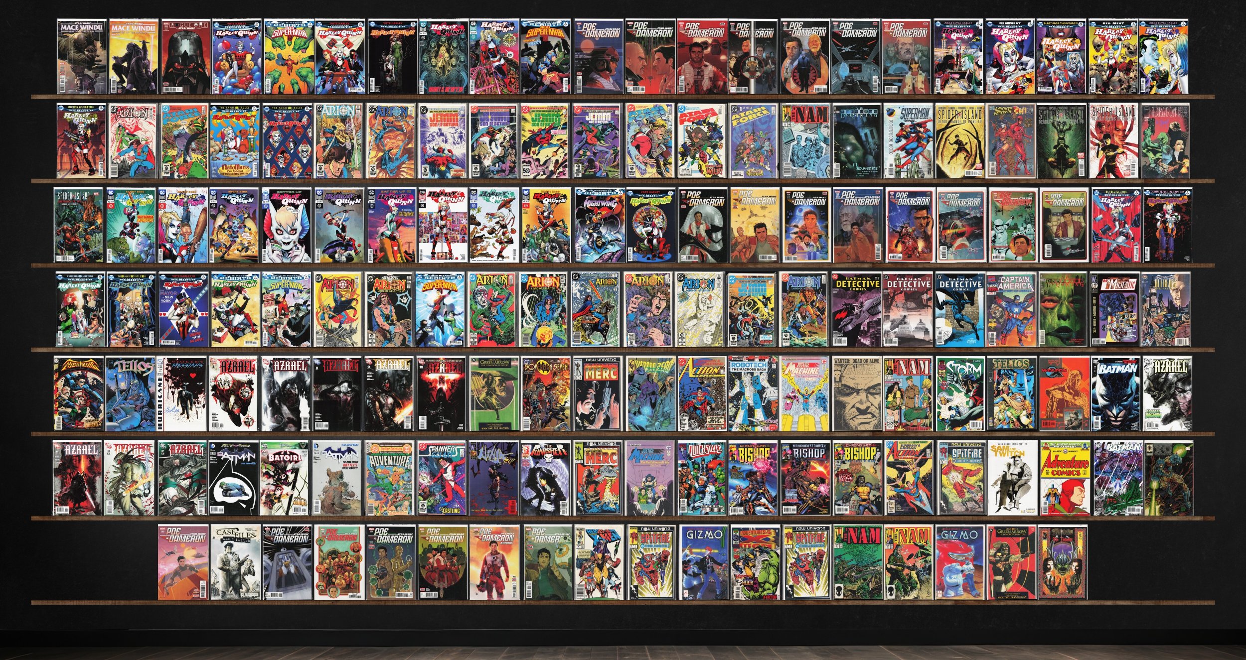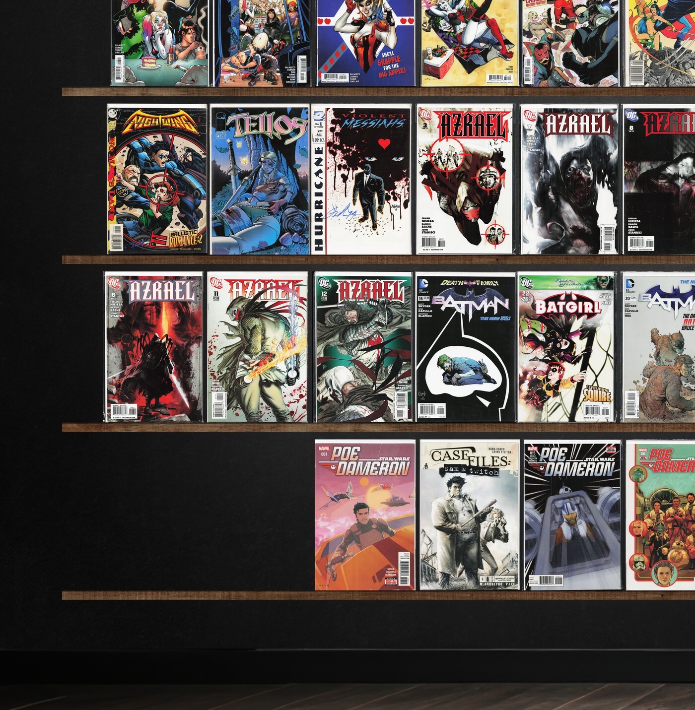 Harley Quinn, Poe Dameron, Azrael, New Super Man, Atari Force, Batman, Detective Comics, The &, The Dreaming, Nightwing, Tellos, Action Comics, Justice Machine, The Punisher, Gizmo, The 'Nam, Daredevil/Shi (1997) Shi, Mr. Majestic, Nightwing: Alfred&, Violent Messiahs, Sovereign Seven, Star Brand, Weapon Zero, Storm, Batgirl, Adventure Comics, Spanner&, Ninja Boy, Mark Hazzard: Merc, Quicksilver, Sam And Twitch, X-O Manowar, Spawn: The Impaler