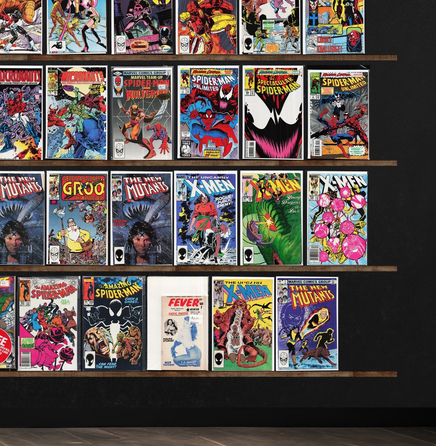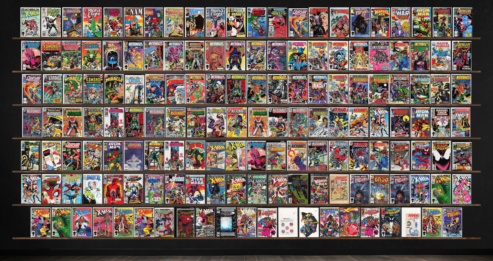 Micronauts, The Uncanny X-Men, The Amazing Spider-Man, Avengers Spotlight, Alpha Flight, Iron Man, The New Mutants, Quasar, Marvel Age, Mister Miracle, What The ?!, X-Men, Spider-Man Unlimited, Spider-Man, X-Men Annual, Excalibur, The 'Nam, The New Warriors, Namor, The Sub Mariner, Solo Avengers, The Thing, The Infinity War, Six From Sirius, Marvel Fanfare, Avengers West Coast, Omac, Silver Star, The Sandman, The Mighty Thor, Nomad, The Sensational She Hulk, Marvel Team Up, The Spectacular Spider-Man, Web Of Spider-Man, The Incredible Hulk, Rocket Raccoon, Star Wars, Howard The Duck, X-Force