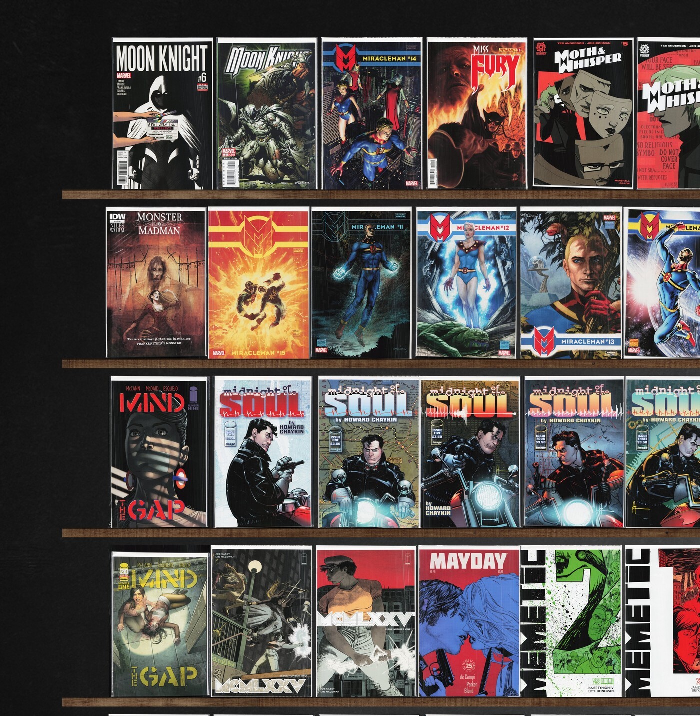 Mind The Gap, The Flash, Miracleman, Midnighter, The Fuse, Five Ghosts, Mother Panic, Masks 2, Mosaic, Moth & Whisper, Men Of Wrath, Motherlands, Micronauts, Material, Mcmlxxv, Memetic, Flashpoint: Citizen Cold, Moon Knight, Monster & Madman, Masks, Mayday, Mask