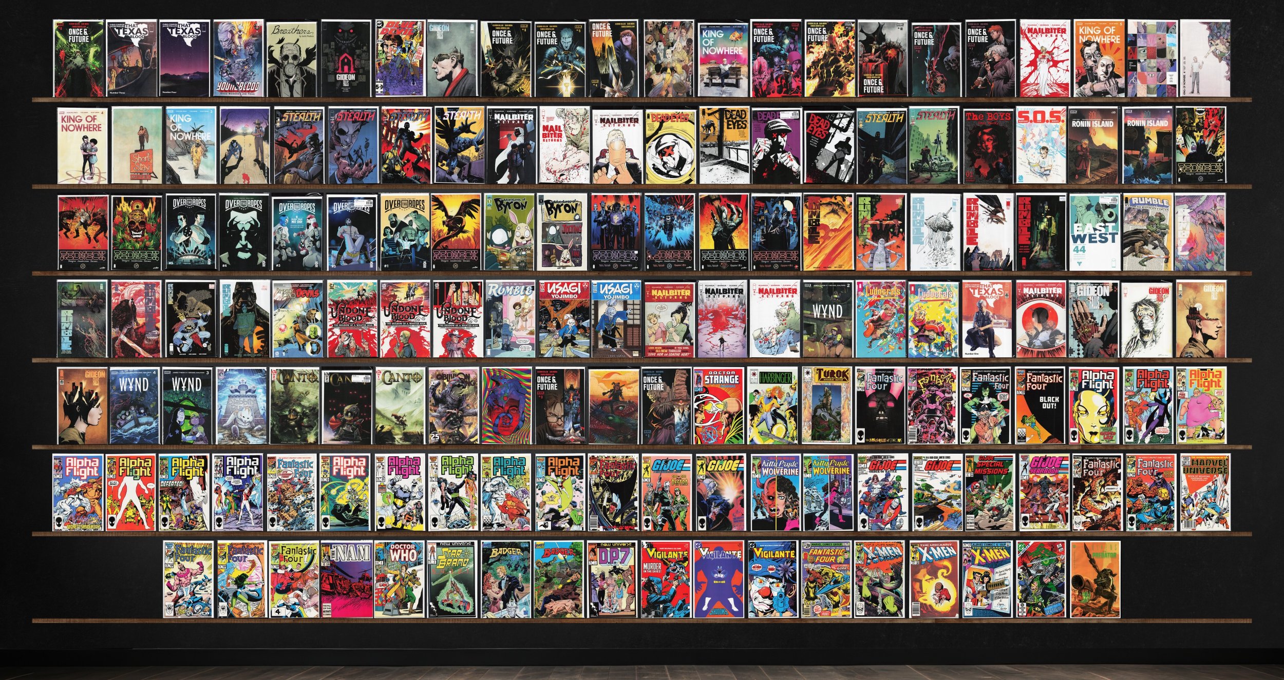 Rumble, Fantastic Four, Alpha Flight, Once & Future, King Of Nowhere, Nailbiter Returns, Redneck, Gideon Falls, Stealth, Over The Ropes, Dead Eyes, That Texas Blood, Wynd, Canto, Vigilante, The Uncanny X-Men, Ronin Island, Usagi Yojimbo, The Ludocrats, Badger, Youngblood, Breathers 3, Blue Devil, East Of West, Stabbity Bunny, Oblivion Song, Doctor Strange Classics, Harbinger, Turok, Dinosaur Hunter, G.I. Joe Yearbook, The 'Nam, Doctor Who, Star Brand, D.P.7, Green Arrow, Aliens Vs. Predator