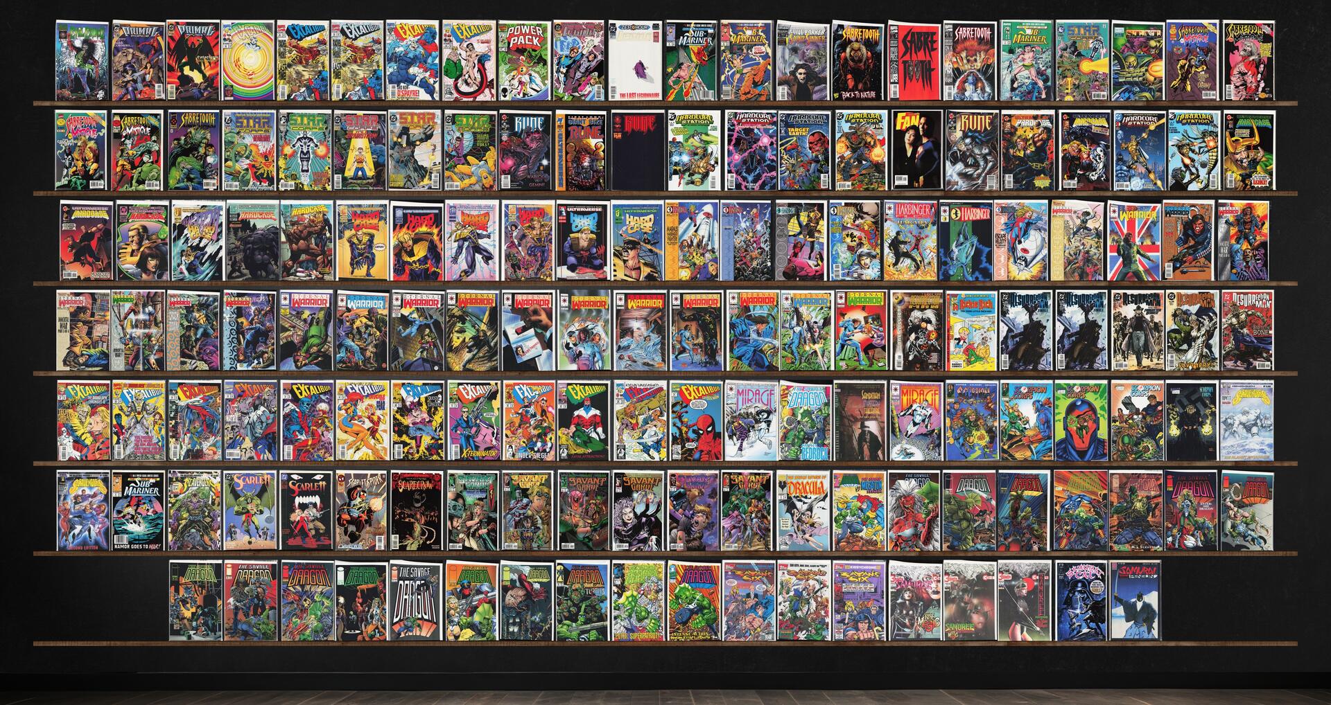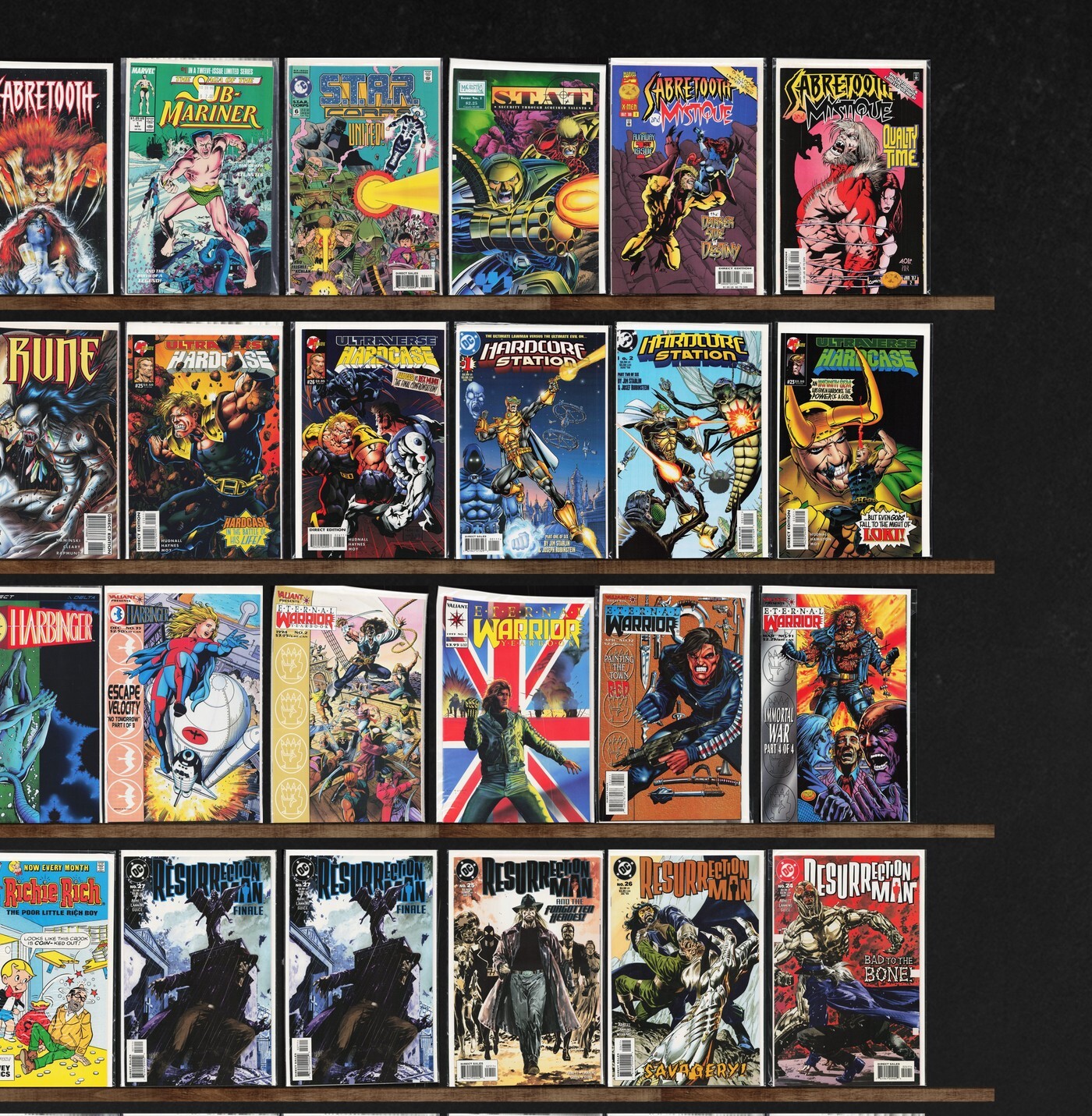 Savage Dragon, Excalibur, Eternal Warrior, Hardcase, S.T.A.R. Corps, Hardcore Station, Harbinger, Resurrection Man, Savant Garde, Scorpion Corps, Mystique & Sabretooth, Scavengers, Satan'S Six, Samuree, Primal Force, Legion Of Super Heroes, Sabretooth, Rune, Eternal Warrior Yearbook, Scarlett, Power Pack, Saint Sinner, Sabretooth (1998) Sabretooth, S.T.A.T. S.T.A.T., Sabretooth Classic, Rune: Infinity, Overstreet'S Fan, Harbinger Files, Richie Rich, Sandman Mystery Theatre, Scarlet Spider, Samurai Cat, Samurai Penguin
