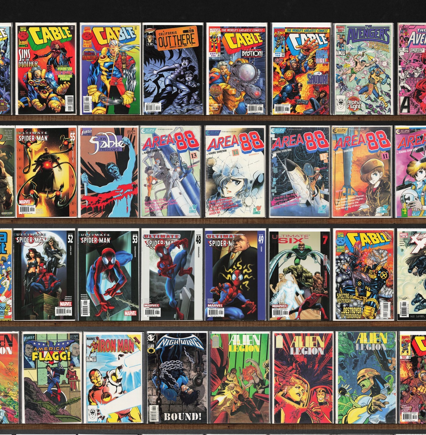 The Avengers, Cable, Alpha Flight, American Flagg!, Area 88, Alien Legion, Ultimate Spider-Man, Ultimate Fantastic Four, Ultimate Six, Iron Man, Classic X-Men, All Star Squadron, Nightwing, Teen Titans, Out There, S ... Read More