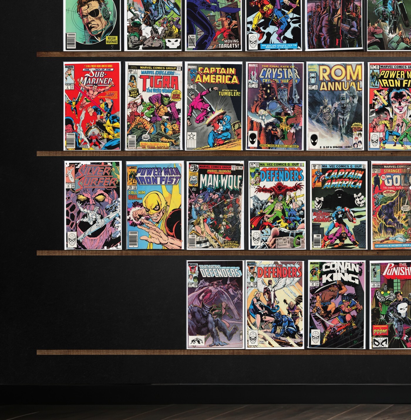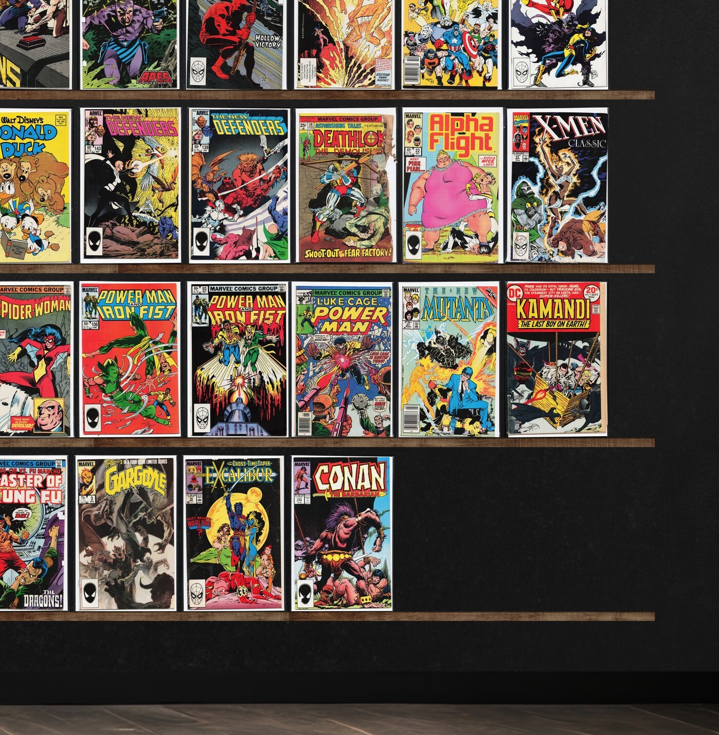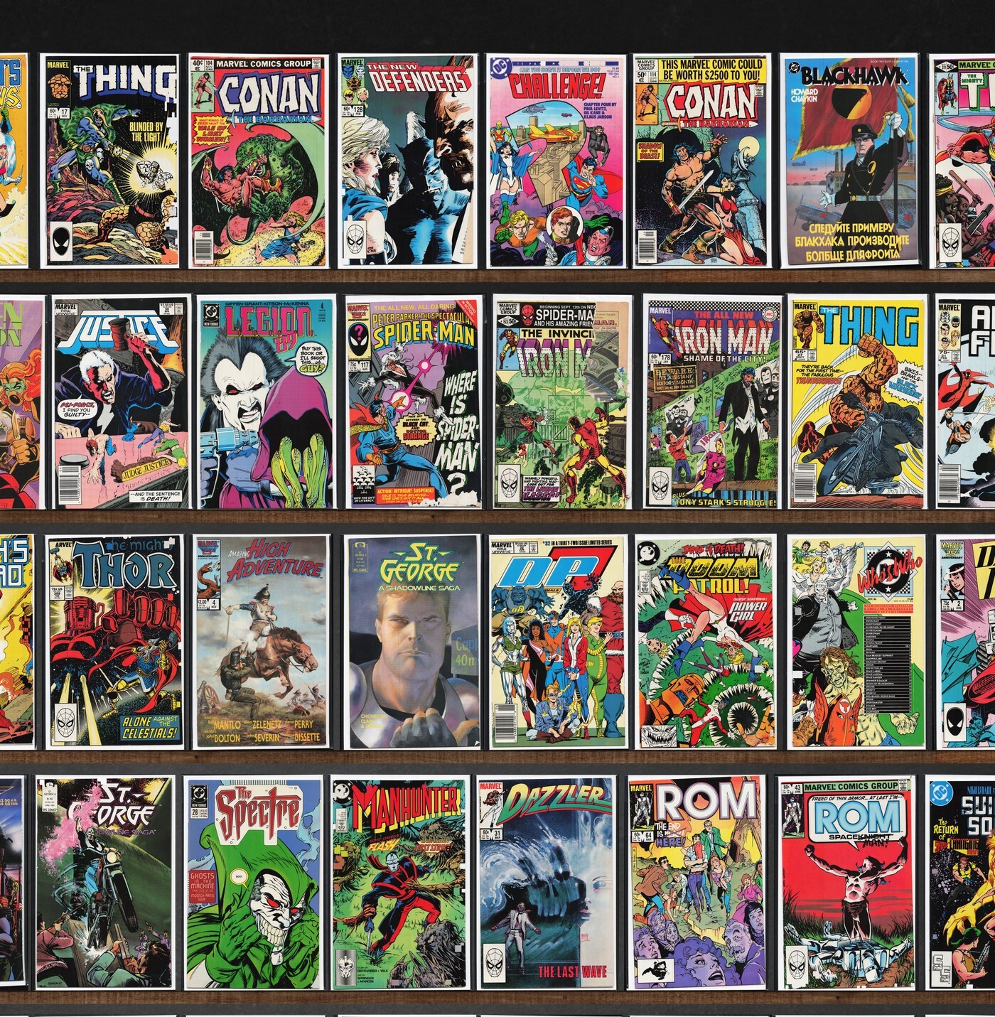 The Defenders, Alpha Flight, Rom, Conan The Barbarian, The New Mutants, Thor, The Avengers, Conan The King, Excalibur, Iron Man, West Coast Avengers, Micronauts, Ka Zar The Savage, The Thing, Namor, The Sub Mariner, Daredevil, Alien Legion, Justice, Doom Patrol, The New Guardians, St. George, Spider-Woman, Marvel Comics Presents, The Punisher, Dazzler, Marvel Fanfare, The Phantom, X-Men Classic, Captain America, Donald Duck, Dragon&, Dc Challenge, Blackhawk, Fantastic Four, L.E.G.I.O.N., The Spectacular Spider-Man, Moonshadow, Powerline, Mickey Mouse Adventures, Death&, Amazing High Adventure, D.P.7, Who&, Dakota North, Update &, Hex, Avengers Spotlight, The War, The Spectre, Manhunter, Suicide Squad, Starman, Marvel Chillers, Rom Annual, Marvel Requirer, Astonishing Tales, Silver Surfer, Marvel Premiere, Strange Tales, Shogun Warriors, Classic X-Men, Super Villain Team Up, Power Man, X-Factor, Machine Man, Silverhawks, Gargoyle