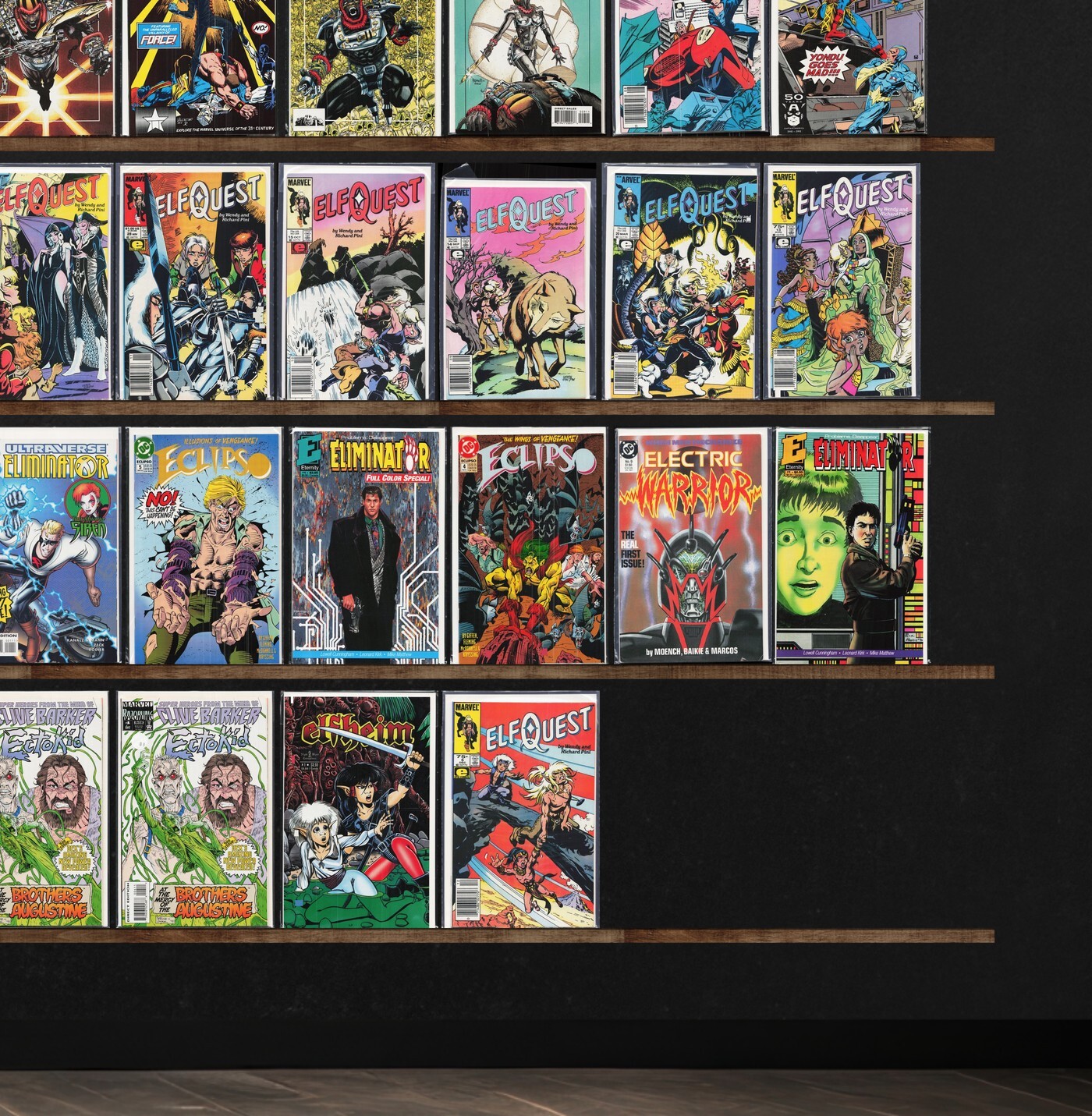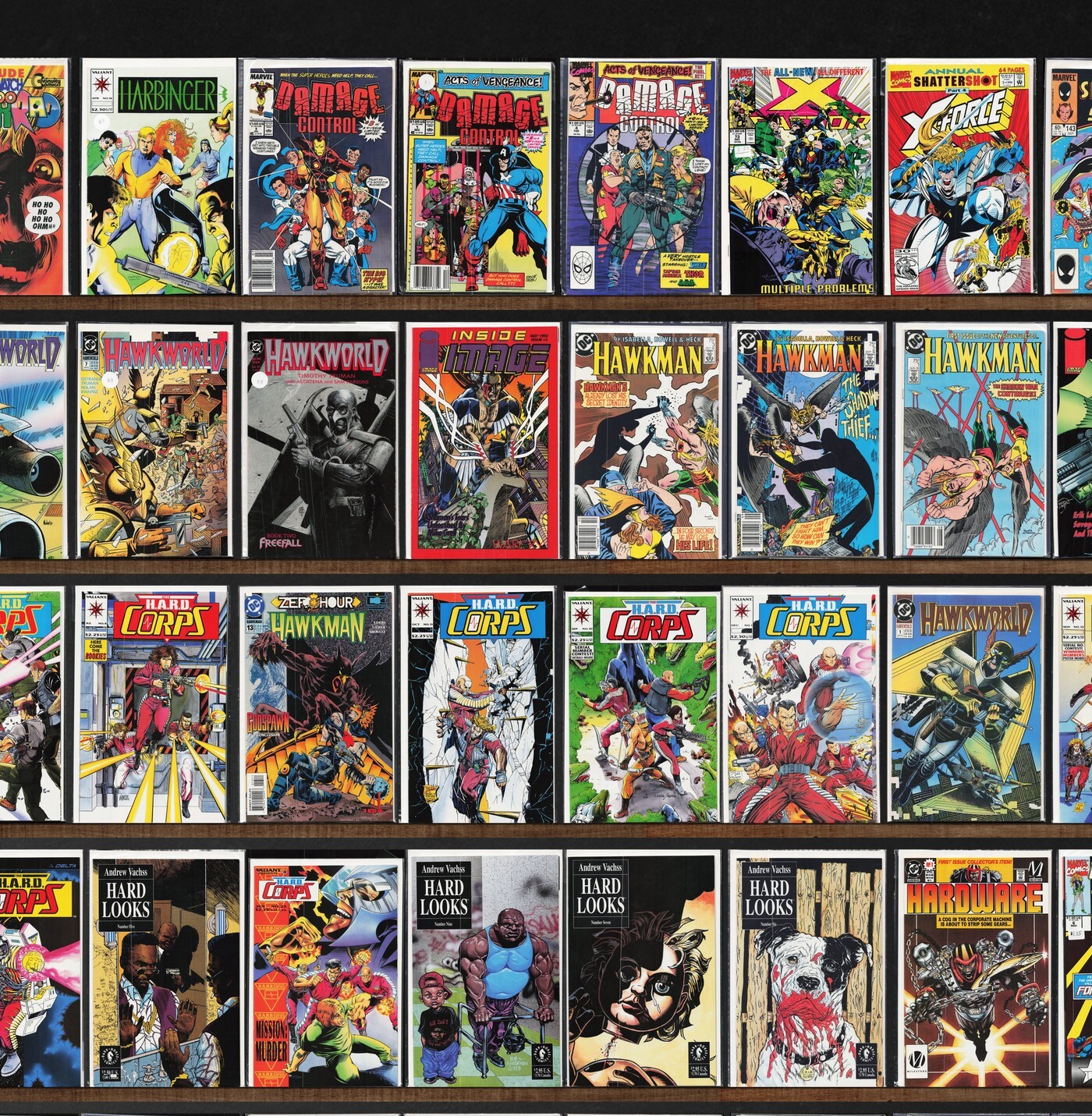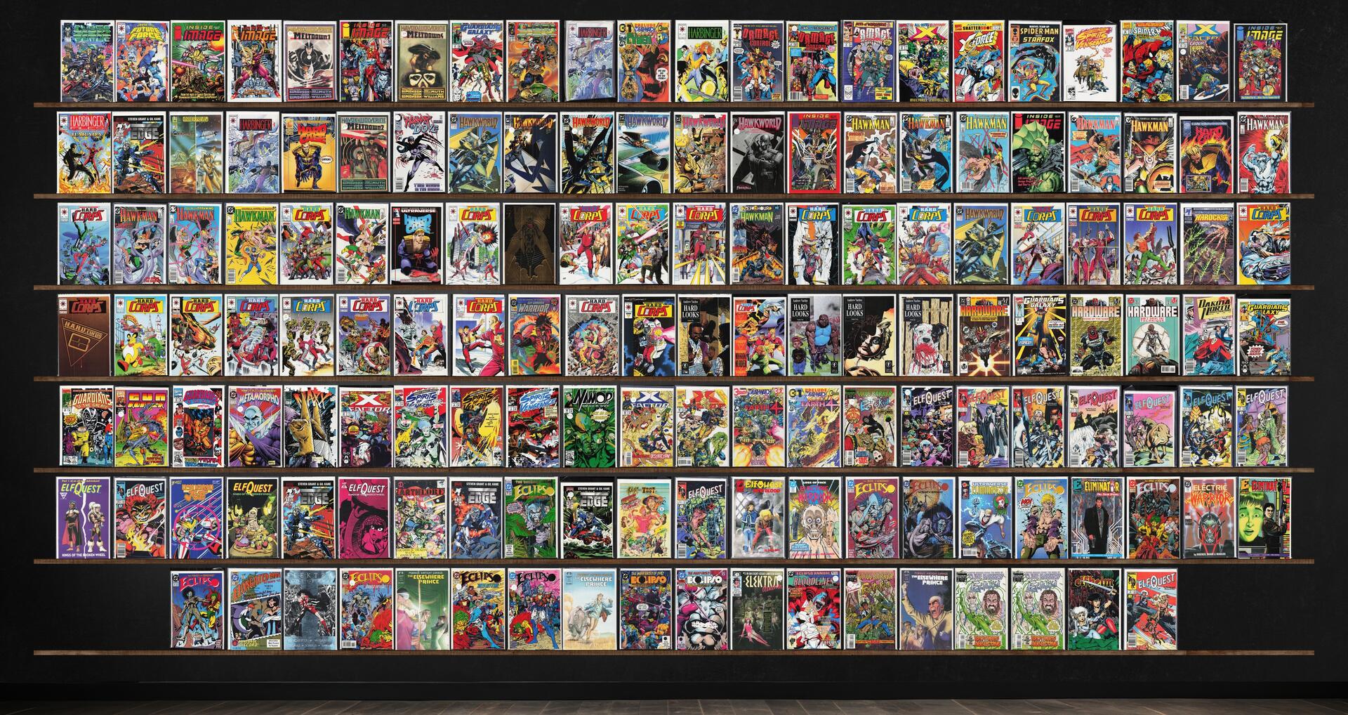 The H.A.R.D. Corps, Hawkman, Elfquest, Eclipso, Hawkworld, X-Factor, Inside Image, Edge, Hardcase, Hard Looks, Ectokid, Harbinger, Damage Control, Hardware, The Elsewhere Prince, Cyber Force, Electric Warrior, Eliminator, Rai, Deathmate, Cyberrad, X-Force Annual, Marvel Team Up, Spider-Man, Harbinger Files, Hawk And Dove, Inside Image (1993), Guy Gardner: Warrior, Dakota North, Gun Runner, Metamorpho, The Maxx, Namor, The Sub Mariner, Dynamo Joe, Earthlore, Elfquest: New Blood, Elongated Man, Elektra, Elektra: Assassin, Elfheim