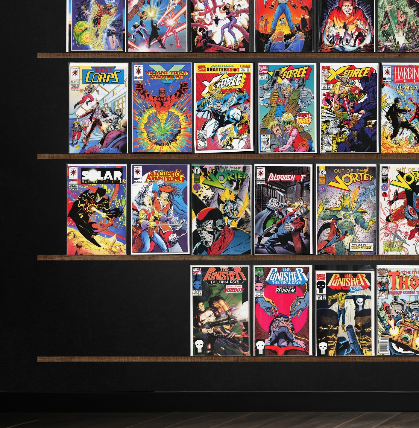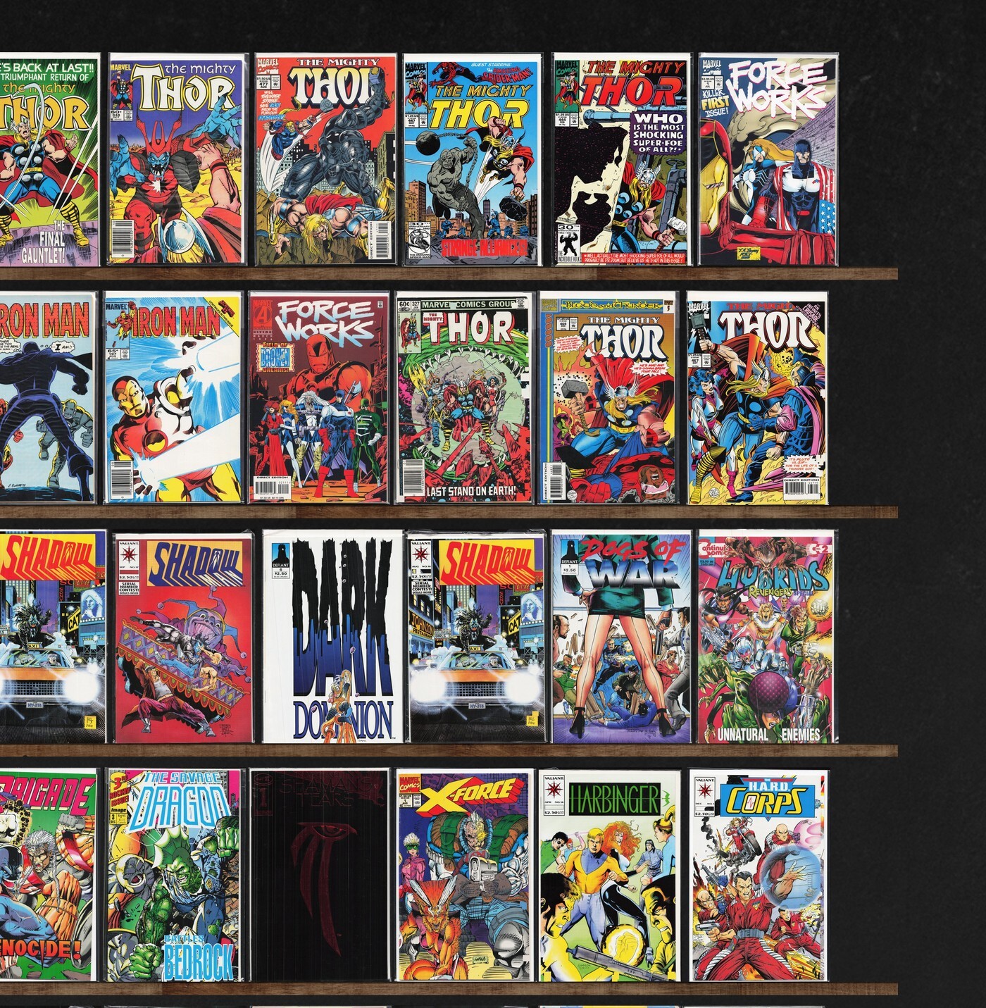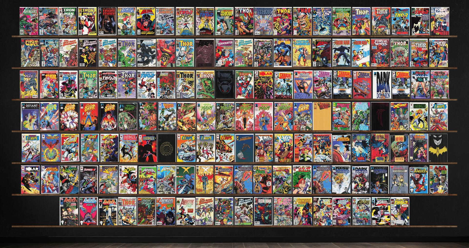 The Mighty Thor, Iron Man, Thor, Warriors Of Plasm, West Coast Avengers, The H.A.R.D. Corps, The Avengers, Force Works, Shadowman, The Good Guys, The Punisher, Dark Dominion, Captain America, U.S.Agent, Avengers West Coast, X-Force, Charlemagne, Secret Weapons, Harbinger, Archer & Armstrong, Will To Power, X, War Machine, Marvel Comics Avengers, The New Warriors, Shadowhawk, War Dancer, Dogs Of War, Hybrids: The Origin, Brigade, Savage Dragon, Shaman&, X-Force Annual, Harbinger Files, Tribe, Images Of Shadowhawk, X-Men Adventures, X-Men, Amazing X-Men, Batman: Gotham Nights, Bloodshot, Cyberrad, Earth 4, Extremes Of Violet, Sachs & Violens, Wonder Man