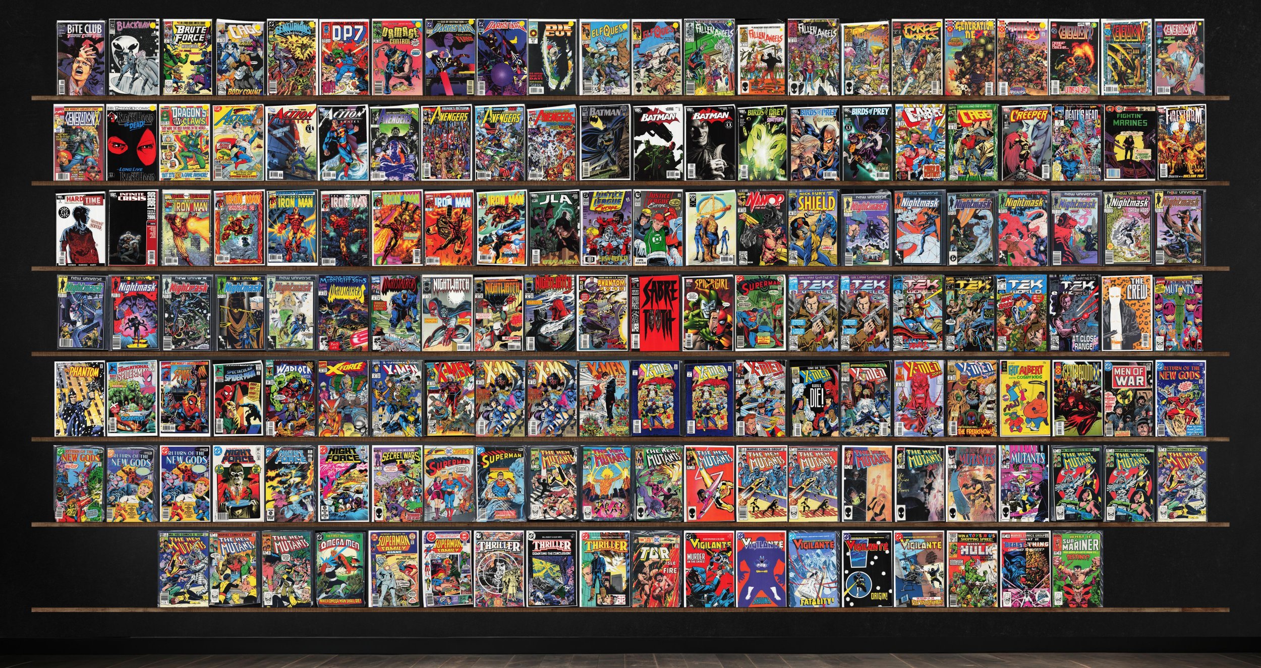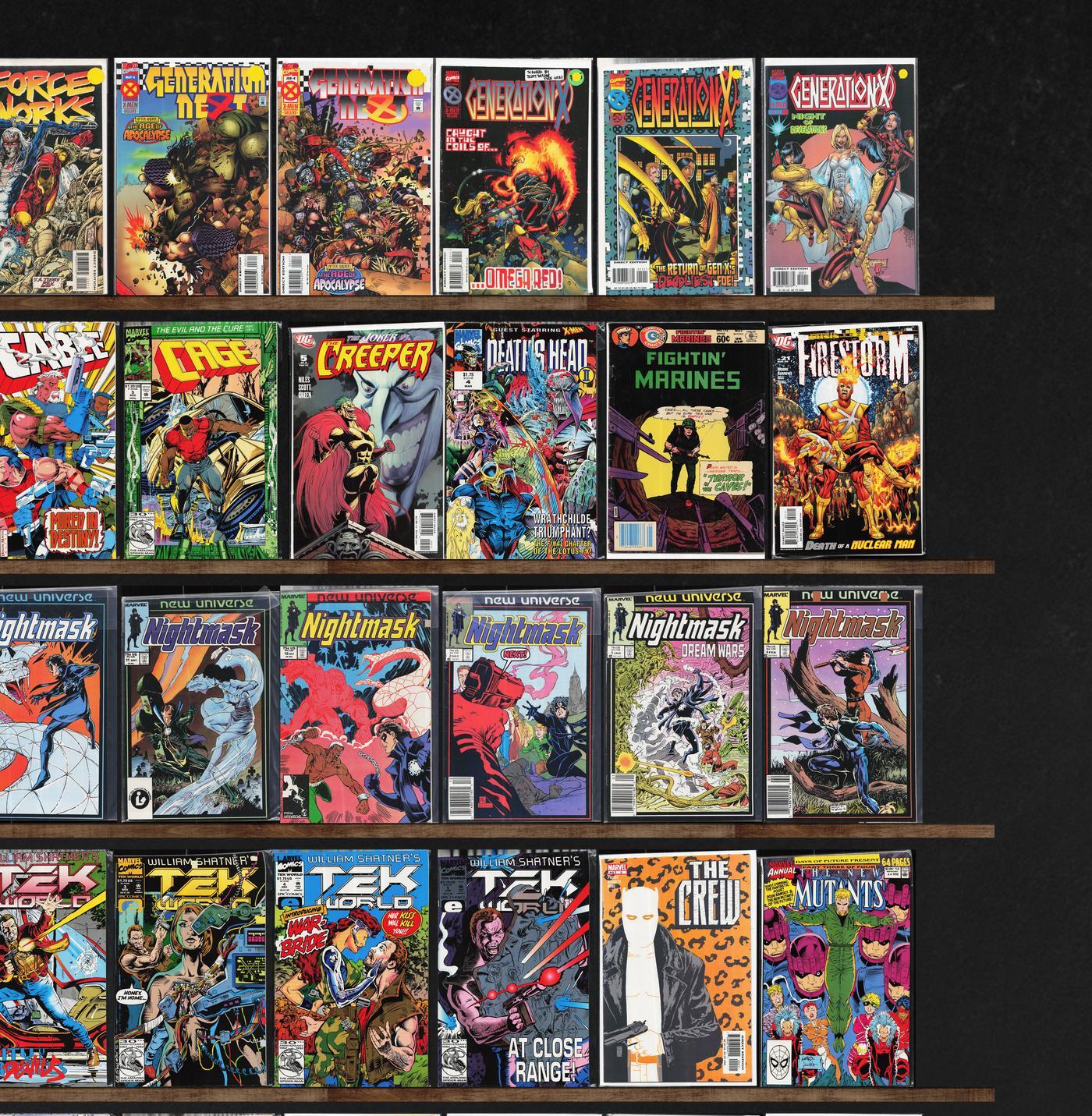 The New Mutants, Nightmask, Iron Man, X-Men 2099, Tekworld, Generation X, X-Men, Vigilante, Fallen Angels, Avengers, New Gods, Action Comics, Batman, Birds Of Prey, Nightwatch, Superman, Night Force, Thriller, What If?, Cage, Darkstars, Elfquest, Generation Next, Justice League Europe, Nightstalkers, The Sensational Spider-Man, The Superman Family, Blackhawk, Brute Force, Centurions, D.P.7, Damage Control, Die Cut, Force Works, The Black Hood, Cable, Creeper, Death'S Head Ii, Fightin' Marines, Firestorm, Jla, Marvel Knights: 4, Namor, The Sub Mariner, Phantom 2040, Sabretooth, Spider-Girl, The Crew, The Spectacular Spider-Man, X-Force, Fat Albert, Men Of War, Secret Wars Ii, The Omega Men, Tor