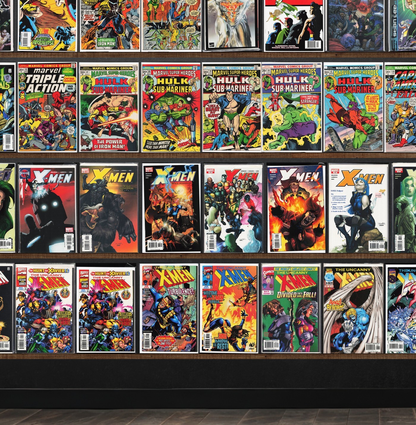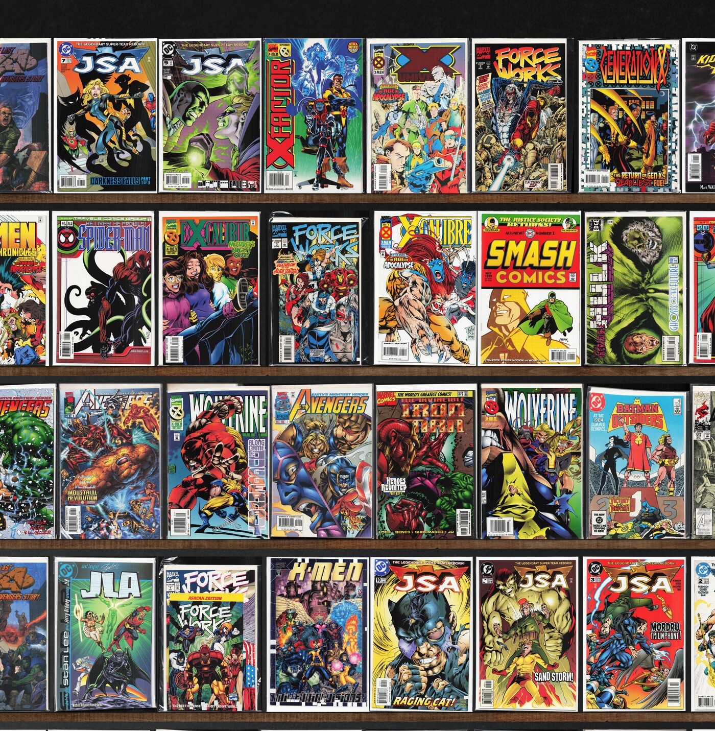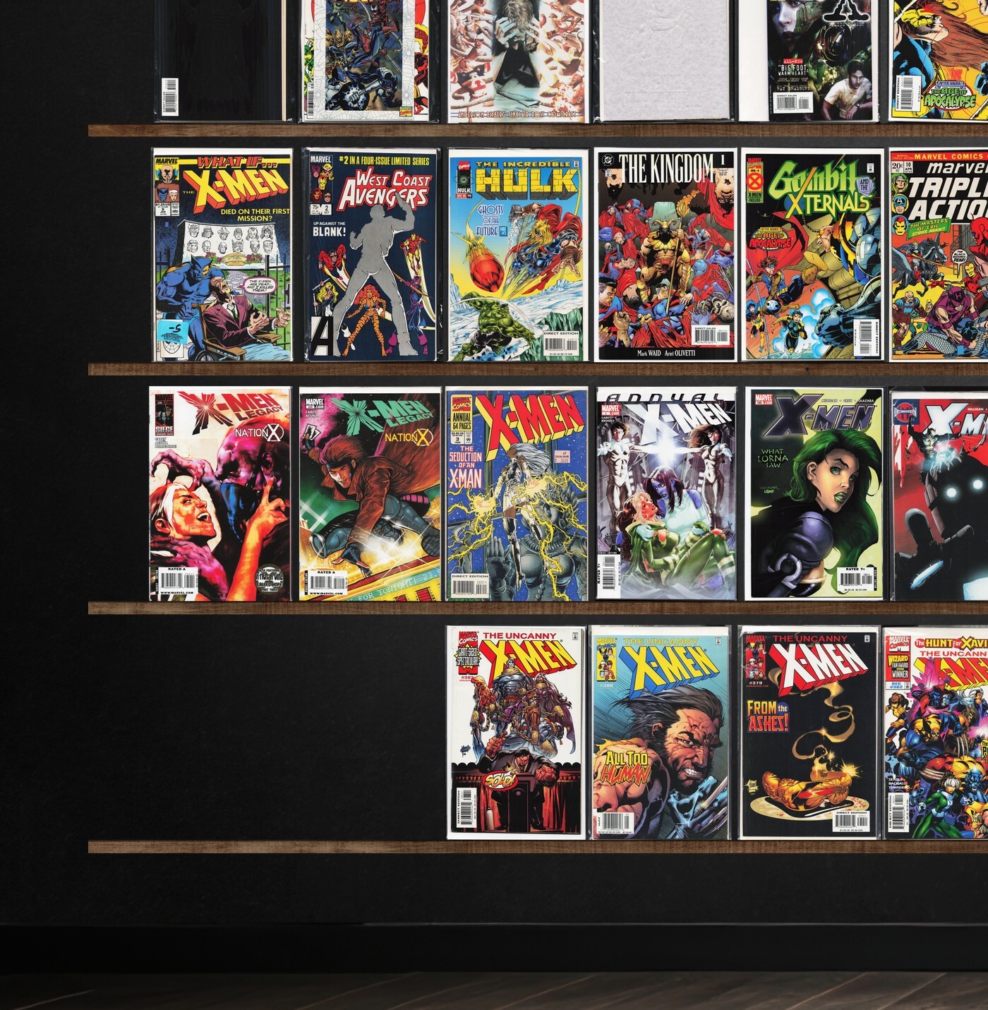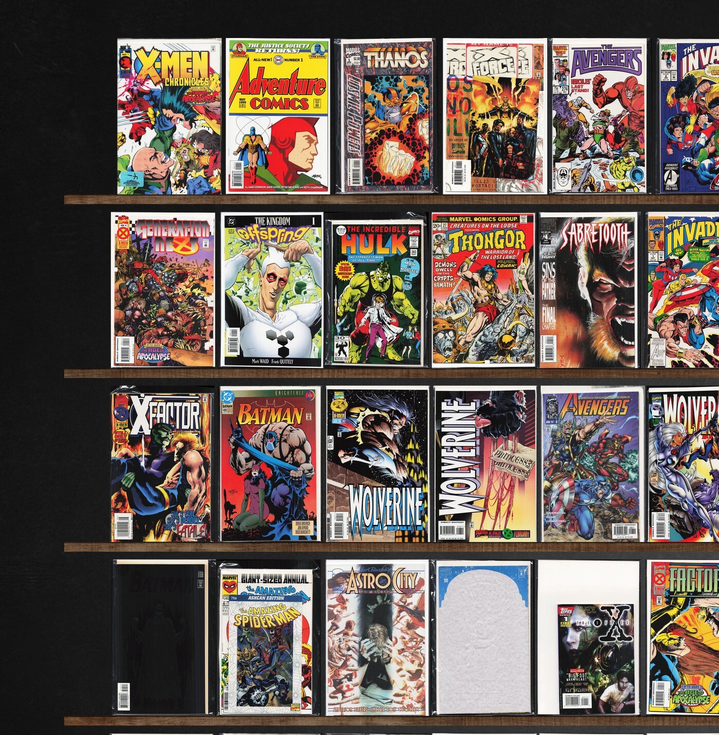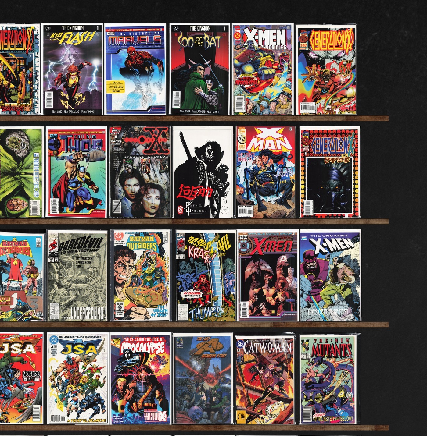 The Uncanny X-Men, X-Men, Wolverine, Jsa, Avengers, Marvel Super Heroes, X-Men: Legacy, X-Men Chronicles, Generation X, The Incredible Hulk, Cosmic Powers, X-Force, The Avengers, The Invaders, Detective Comics, X-Factor, Force Works, Iron Man, Daredevil, F5, X-Universe, Generation Next, Sabretooth, Youngblood/X-Force (1996) Youngblood, Marvels Comics: Spider-Man, Excalibur, X-Calibre, Marvels Comics: Thor, X-Files Special Edition, X-Man, Batman, Marvels Comics: X-Men, Factor X, Power Man, Hero For Hire, Marvels, All Star Comics, Catwoman, The New Mutants, What If...?, West Coast Avengers, The Kingdom, Marvel Triple Action, Captain America, X-Men Annual