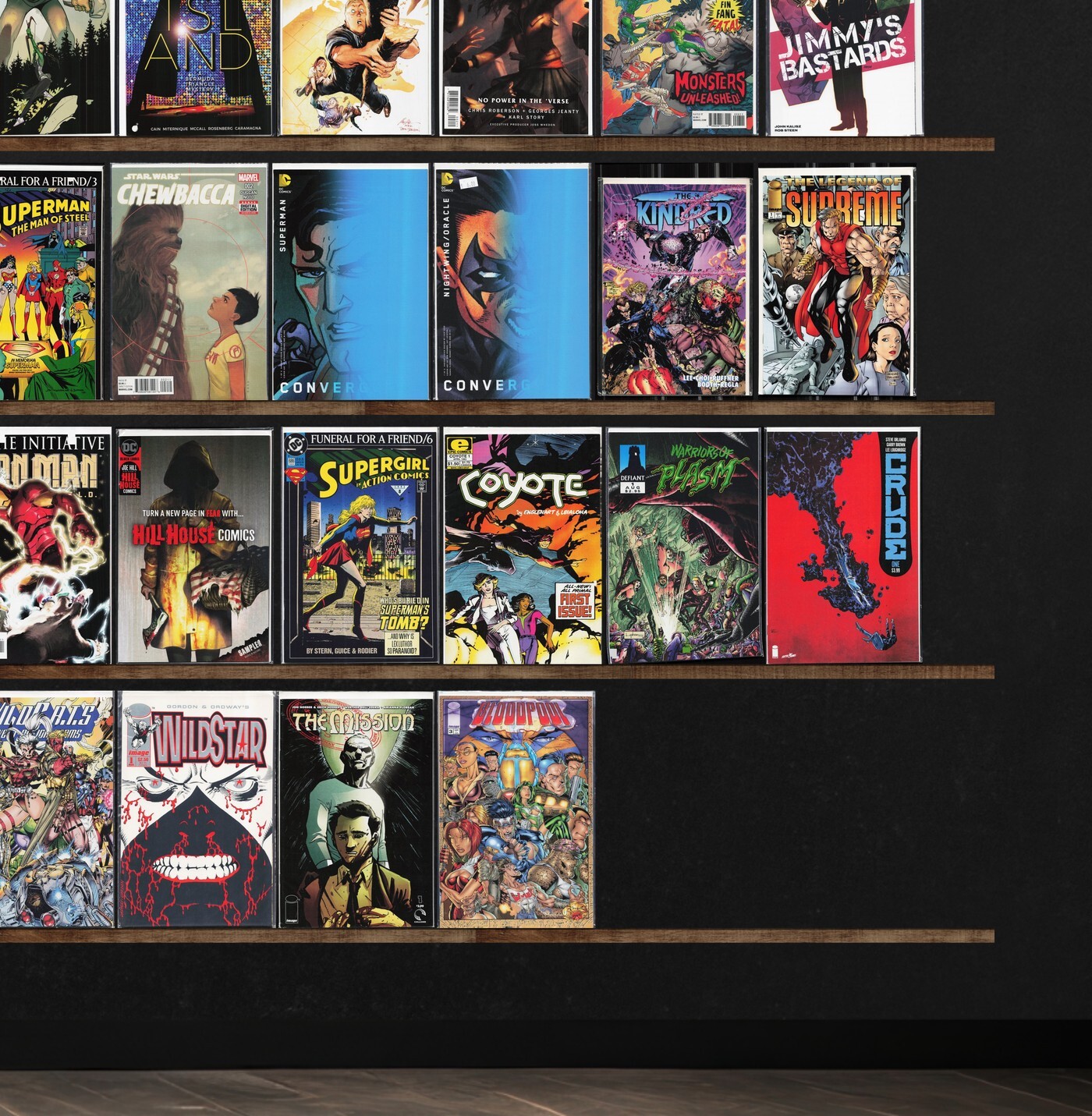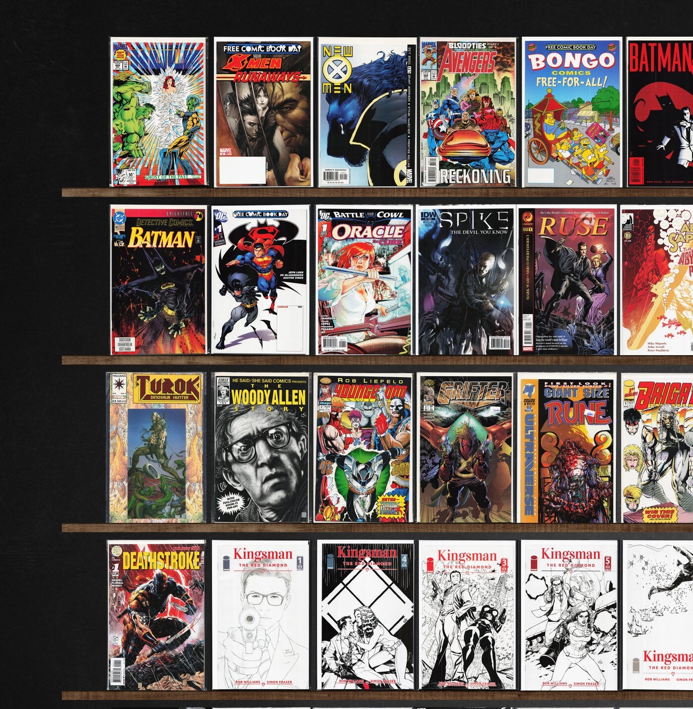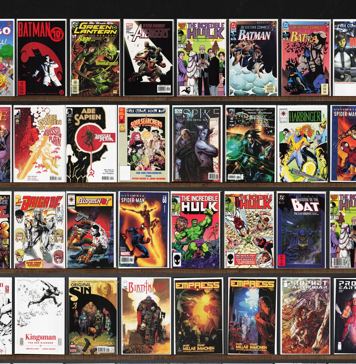 Ultimate Spider-Man, The Incredible Hulk, Detective Comics, Superman, Green Lantern: Rebirth, Jimmy'S Bastards, Wildstar: Sky Zero, Prophet: Earth War, Wetworks, Bongo Comics Free For All!, New Avengers, Turok, Dinosaur Hunter, Iron Man, Empress, White Ash, Heavy, Spider-Man Classics, X-Men/Runaways (2006) Runaways, New X-Men, The Avengers, Nervous Rex, Oracle: The Cure, Ruse, The Darkness, Harbinger, New Gods, Youngblood, Grifter, Brigade, Bloodshot, Nightvision, Robin, Fantastic Four, Daredevil, Deathstroke, Original Sin, Birthright, Outer Darkness/Chew, Chu, Spy Island, Huck, Monsters Unleashed, Collider (2013), Marvel Super Heroes, X-Force, Luger, Warchild, Chewbacca, Convergence Superman, Convergence Nightwing/Oracle, The Kindred, Harrow County, Convergence, Groot, The Gift, Fathom, Convergence Suicide Squad, Action Comics, Coyote, Warriors Of Plasm, Crude, Wildc.A.T.S Trilogy, The Mission, Bloodpool