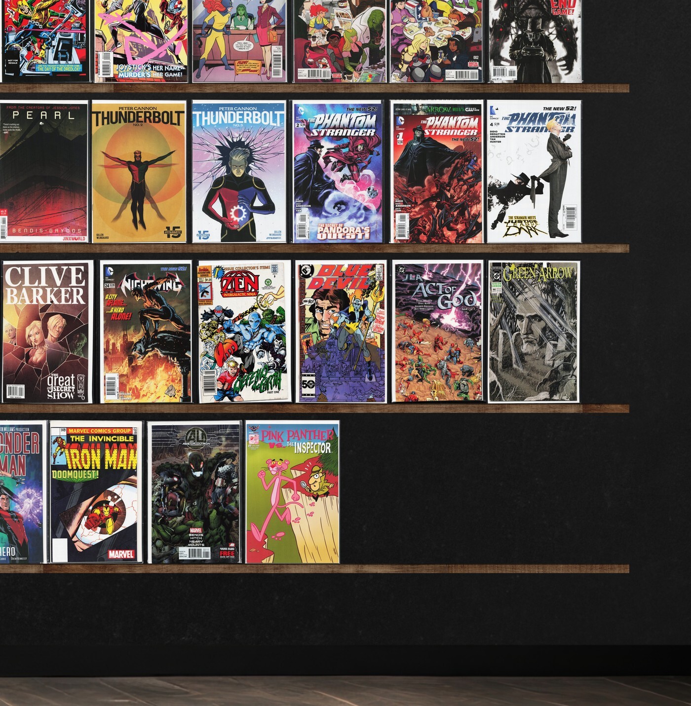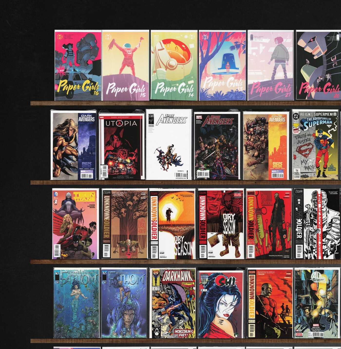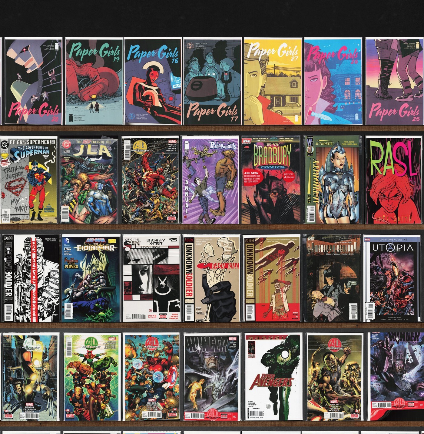 Unknown Soldier, Paper Girls, The Phantom Stranger, Dark Avengers, Age Of Ultron, Pearl, Teen Titans, Wonder Man, Cloak And Dagger, Action Comics, Rasl, Fathom, Hunger, Peter Cannon: Thunderbolt, Blue Devil, Iron Man, Original Sins, Adventures Of Superman, Jla, Ray Bradbury Comics, The Authority, Tellos, Uncanny X-Men, American Century, Hawkworld, Brigade, Darkhawk, Omega The Unknown, Ghost Rider, Nightwing, Zen Intergalactic Ninja, Green Arrow, The Filth, Iron Man/Thor