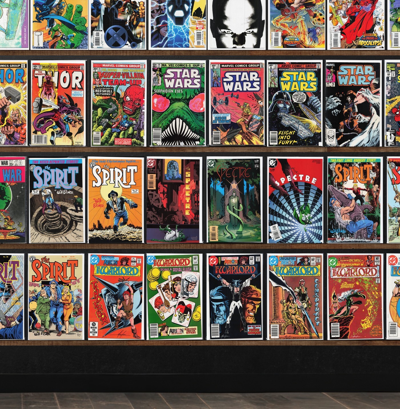 Warlord, Ultimate X-Men, The Spirit, Astonishing X-Men, The Spectre, Star Wars, Avengers, Thor, Atari Force, Iron Man, Warriors Of Plasm, Spacehawk, Star Hunters, X-Force, Weird Western Tales, Warlord Annual, Magnus, Robot Fighter, Superman, Mod Wheels, X-Men/Alpha Flight, Super Villain Team Up, The Spectacular Spider-Man, Enchanted Valley, Space War