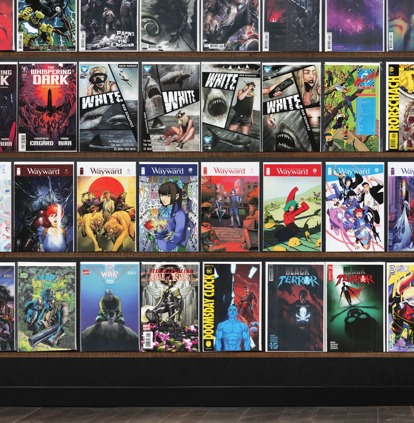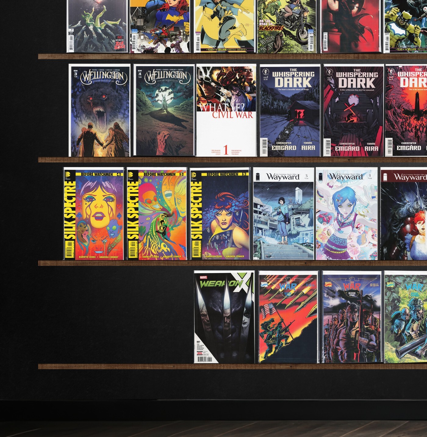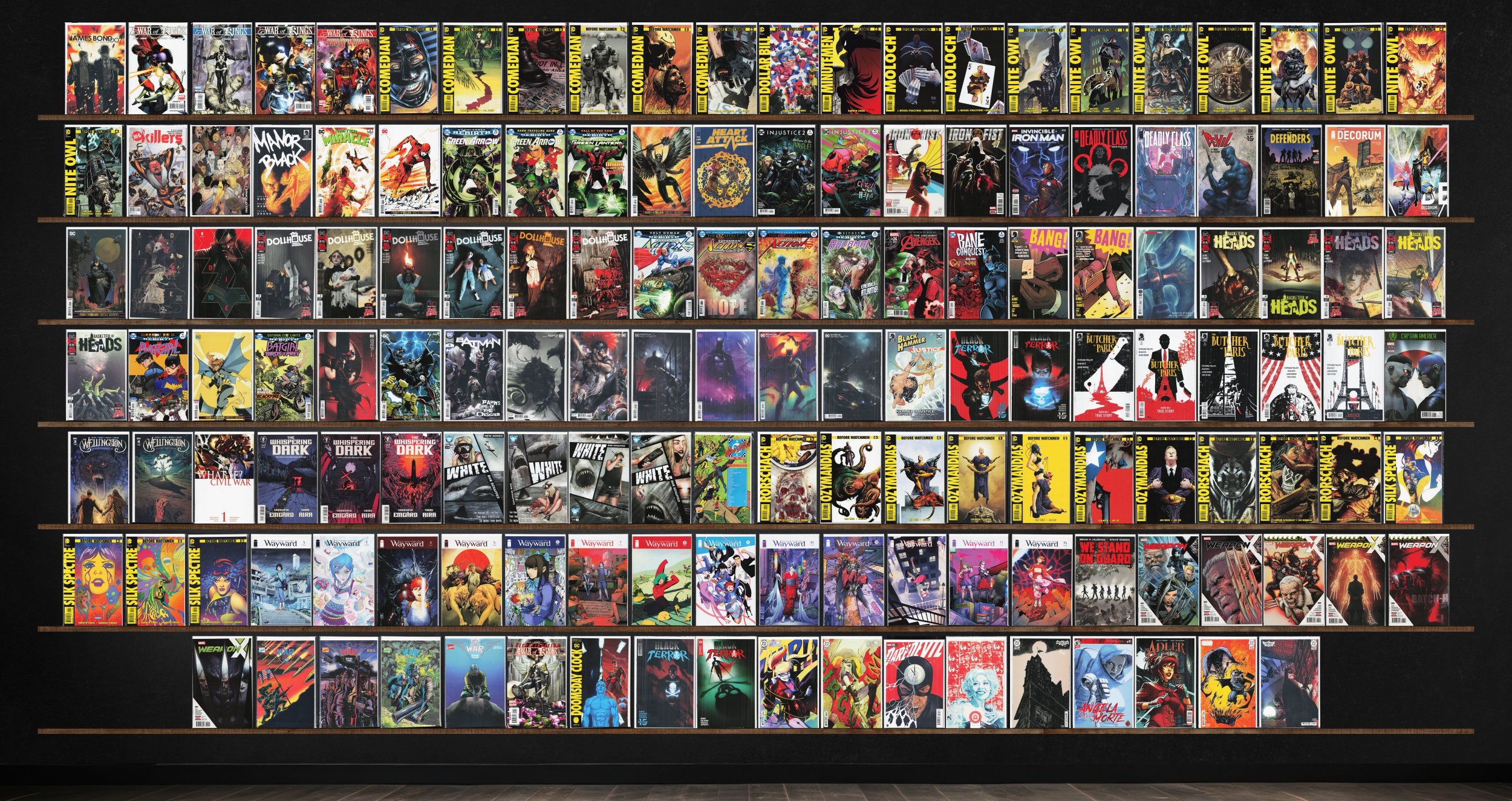 Wayward, Before Watchmen: Comedian, Batman, The Dollhouse Family, Basketful Of Heads, Weapon X, Black Terror, White, Before Watchmen: Rorschach, Before Watchmen: Ozymandias, The War, War Of Kings, Action Comics, The Whispering Dark, Before Watchmen: Moloch, Green Arrow, Injustice 2, Iron Fist, Deadly Class, Decorum, Die, Bang!, Batgirl, Wellington, James Bond 007, Before Watchmen: Minutemen, Ki 6: Killers, King Of Nowhere, Manor Black, Mister Miracle, The Flash, Hawkman, Heart Attack, Invincible Iron Man, Death Defying 'Devil, The Defenders, Detective Comics, Aquaman, Uncanny Avengers, Bane: Conquest, Captain America, Update '88, Doomsday Clock