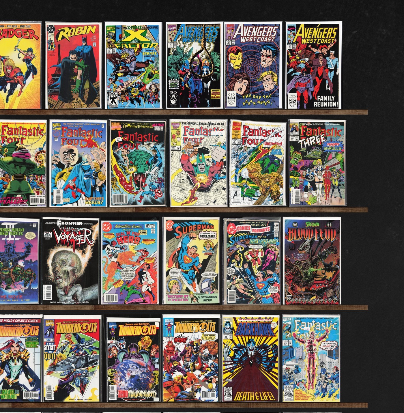 X-Factor, Fantastic Four, Avengers West Coast, Spawn, X-Force, Thunderbolts, Fantastic Four Unlimited, Thor, The Flash, The New Mutants, Wolverine, Violator, Guy Gardner: Warrior, Spider-Man 2099, Daredevil, Showcase '94, Ravage 2099, Darkhawk, Thunderstrike, The Flash Annual, The Avengers Annual, Spider, Badger, Robin, The Comet, The Demon, The Spectacular Spider-Man, Fantastic Four (1992), Fantastic Four Annual, The Batman Adventures, Adventure Comics, Superman (1981), Dc Comics Presents, Spawn: Blood Feud, Alf* Comics Magazine, Doom 2099, Action Comics, Thor Corps, The New Warriors, Sleepwalker, X-Factor Annual, West Coast Avengers