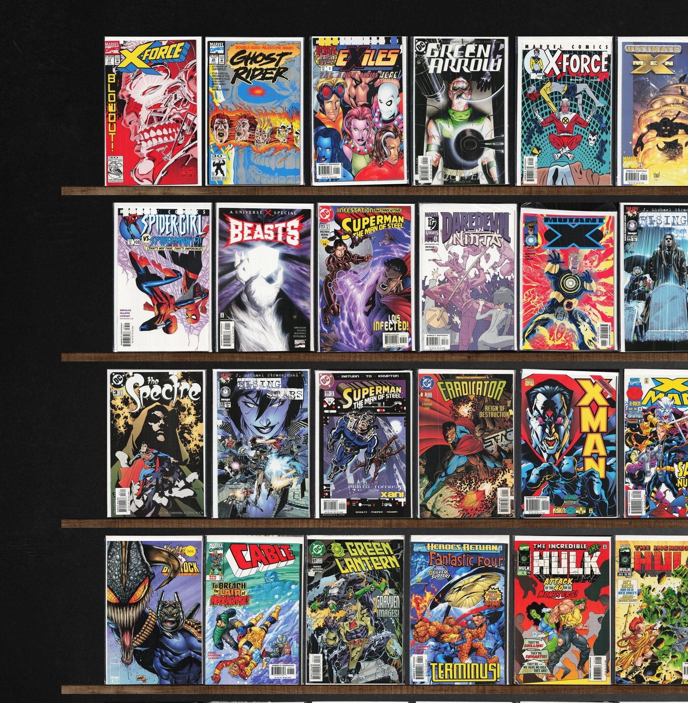 X-Man, Green Lantern, Hardcase, The Flash, Cable, The Incredible Hulk, Jla, Weapon X, X-Force, The Uncanny X-Men, Spawn/Wildc.A.T.S, Fantastic Four, Batman, Green Arrow, Ultimate Spider-Man, Mutant X, Rising Stars, Thunderbolts, Captain America, The Spectre, Marvel Knights, Punisher, Chapel, Prime, Wolverine, Ghost Rider, Exiles, Ultimate X-Men, Superman, Deadman: Dead Again, Ultimate Marvel Team Up, Superboy'S Legion, Action Comics, Spider-Girl, Daredevil: Ninja, Wild Thing, Tom Strong, Eradicator, X-Men, Azrael, Violator Vs. Badrock, Askani'Son, Darkhawk, Marvel Comics Exiles, Daredevil (1998), Spawn, Adventures Of Superman, Alpha Flight, Generation Next, Factor X, X-Men Unlimited