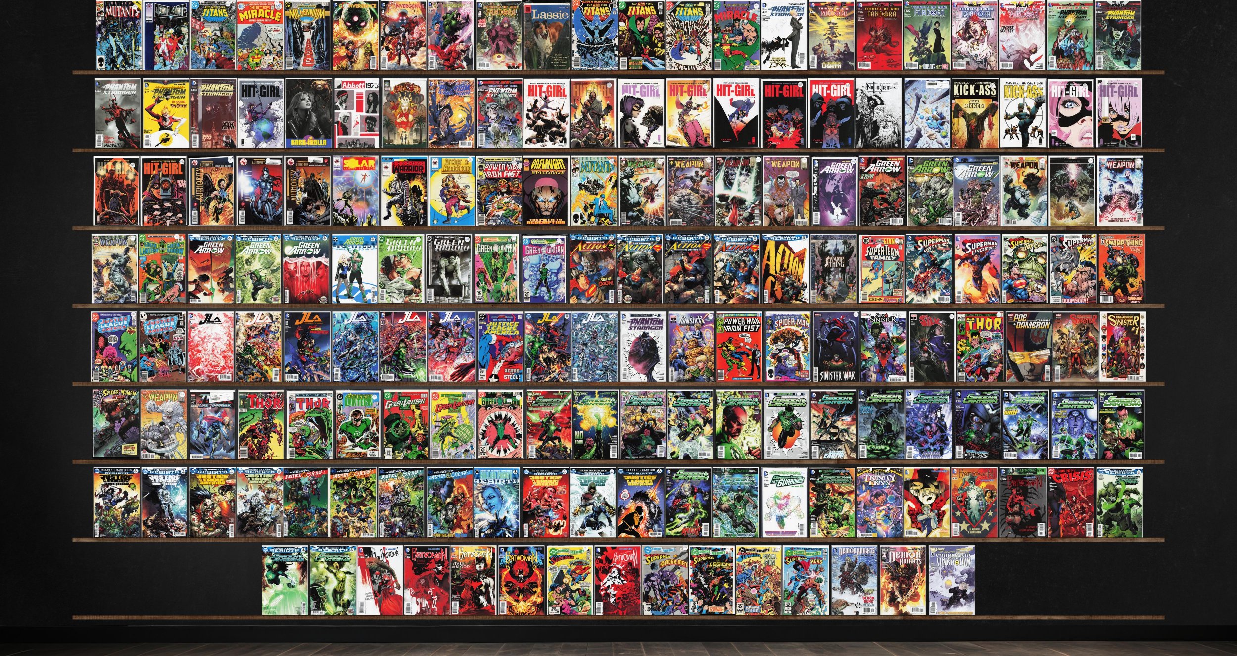 Green Lantern, The Phantom Stranger, Weapon H, Green Arrow, Hit Girl, Batwoman, Action Comics, Dc Comics Presents, Hit Girl Season Two, Thor, Convergence, The Authority, The New Mutants, Mister Miracle, Kick Ass, Superman Unchained, Squadron Sinister, Green Lanterns, Demon Knights, Deathmate, Millennium, Lassie, Barbarella, Abbott: 1973, Shrugged, Nottingham, Twig, Eternal Warrior, Archer & Armstrong, Swamp Thing Annual, Super Team Family, Swamp Thing, The Punisher, The Spectacular Spider-Man, Sinister War, Silk, Spider-Woman, Identity Crisis, Dc Universe Presents