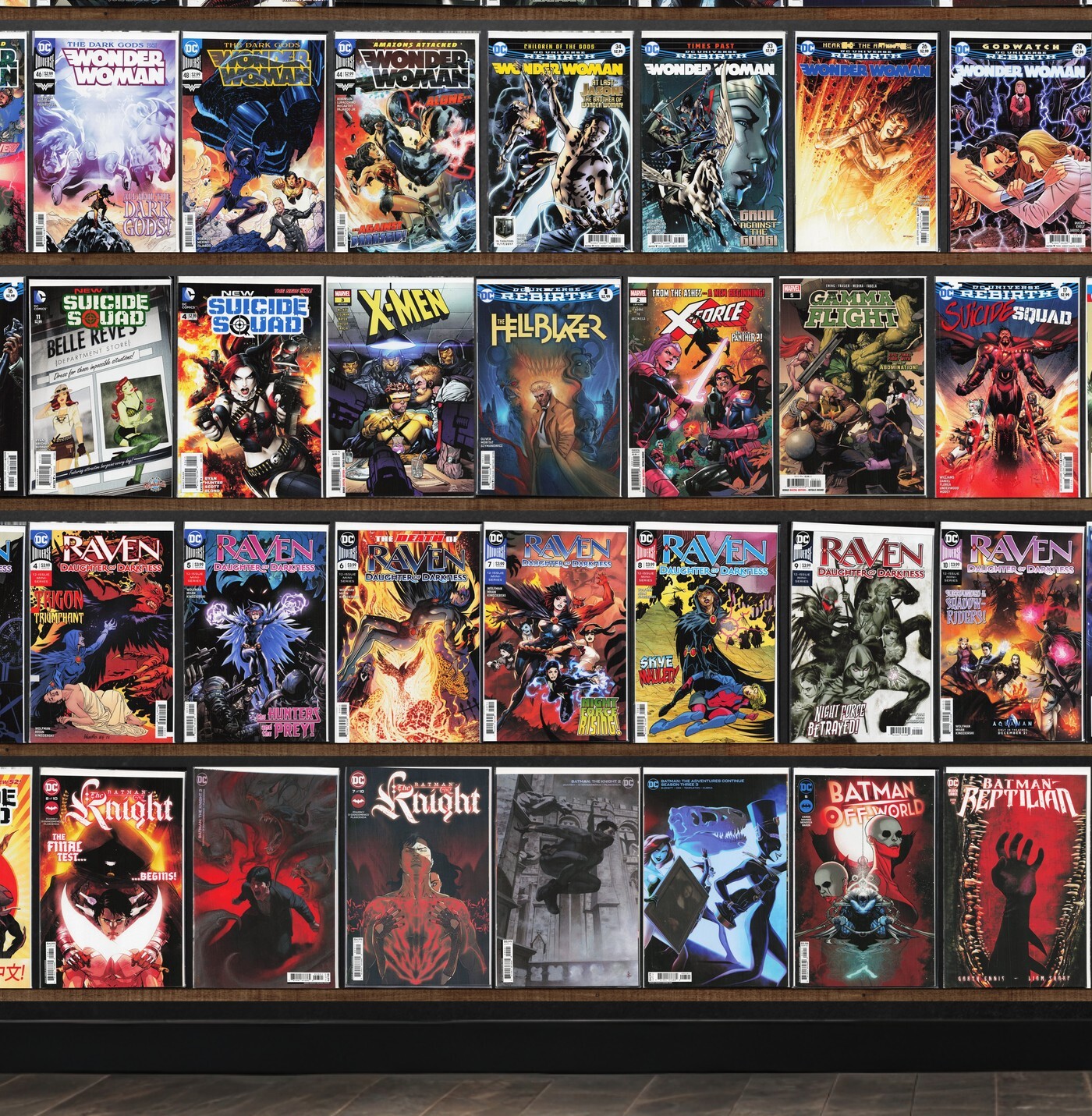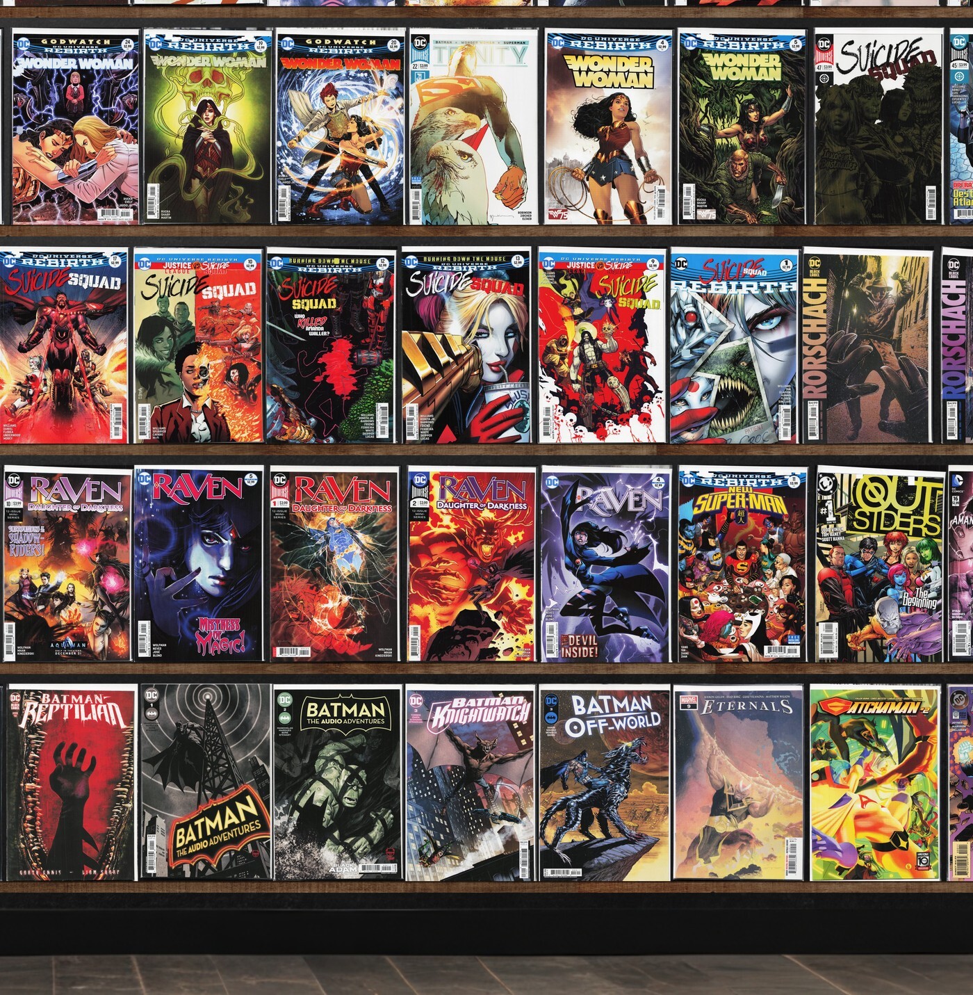 Suicide Squad, Wonder Woman, Trinity, New Suicide Squad, Rorschach, Batman: The Knight, Raven, Batman: Off World, Batman, Super Sons, X-Men, Hellblazer, X-Force, Gamma Flight, Batwoman, New Super Man, Outsiders, Batman Reptilian, Batman: Knightwatch, Eternals, Gatchaman, Damage, Aquaman