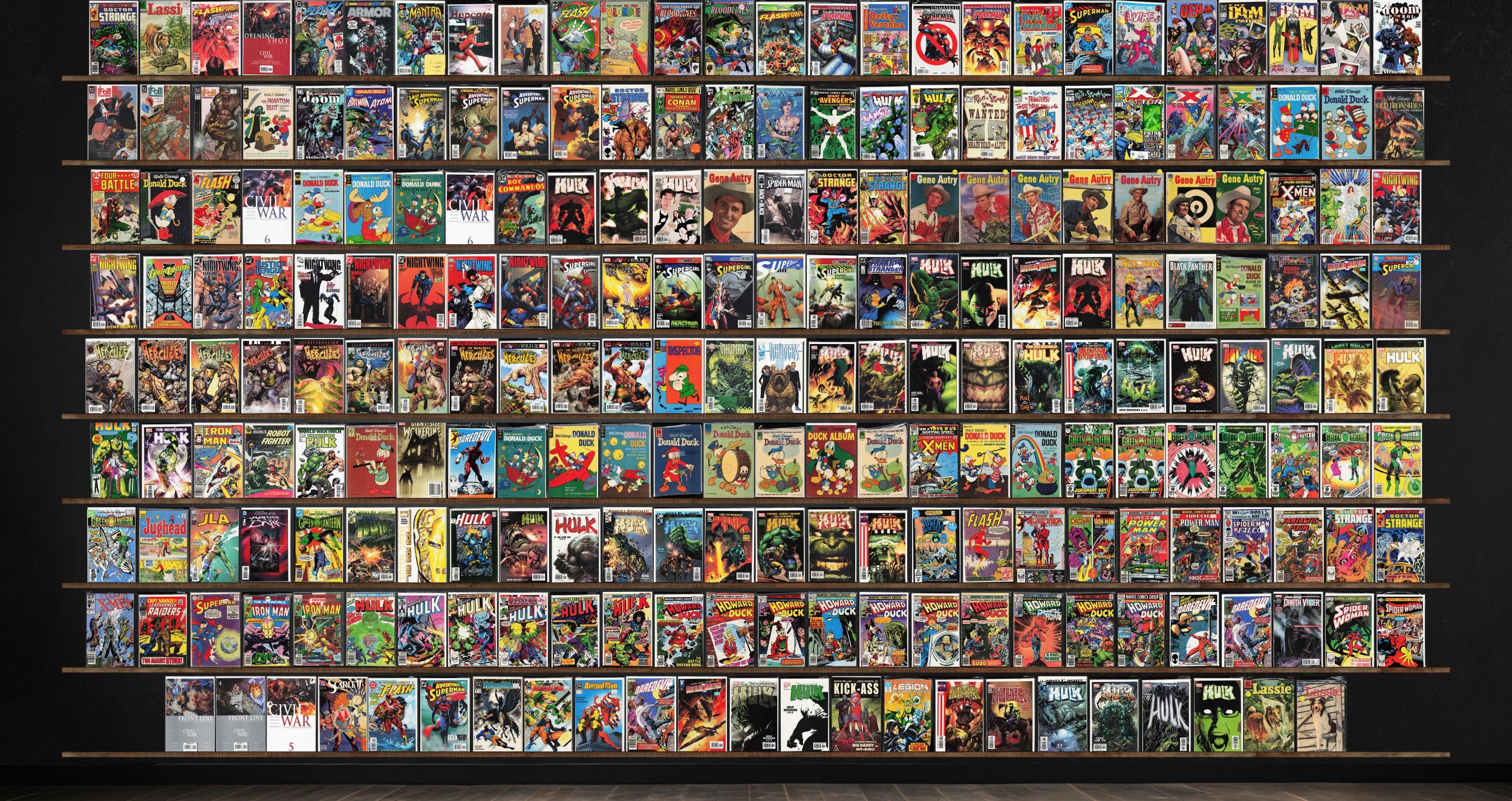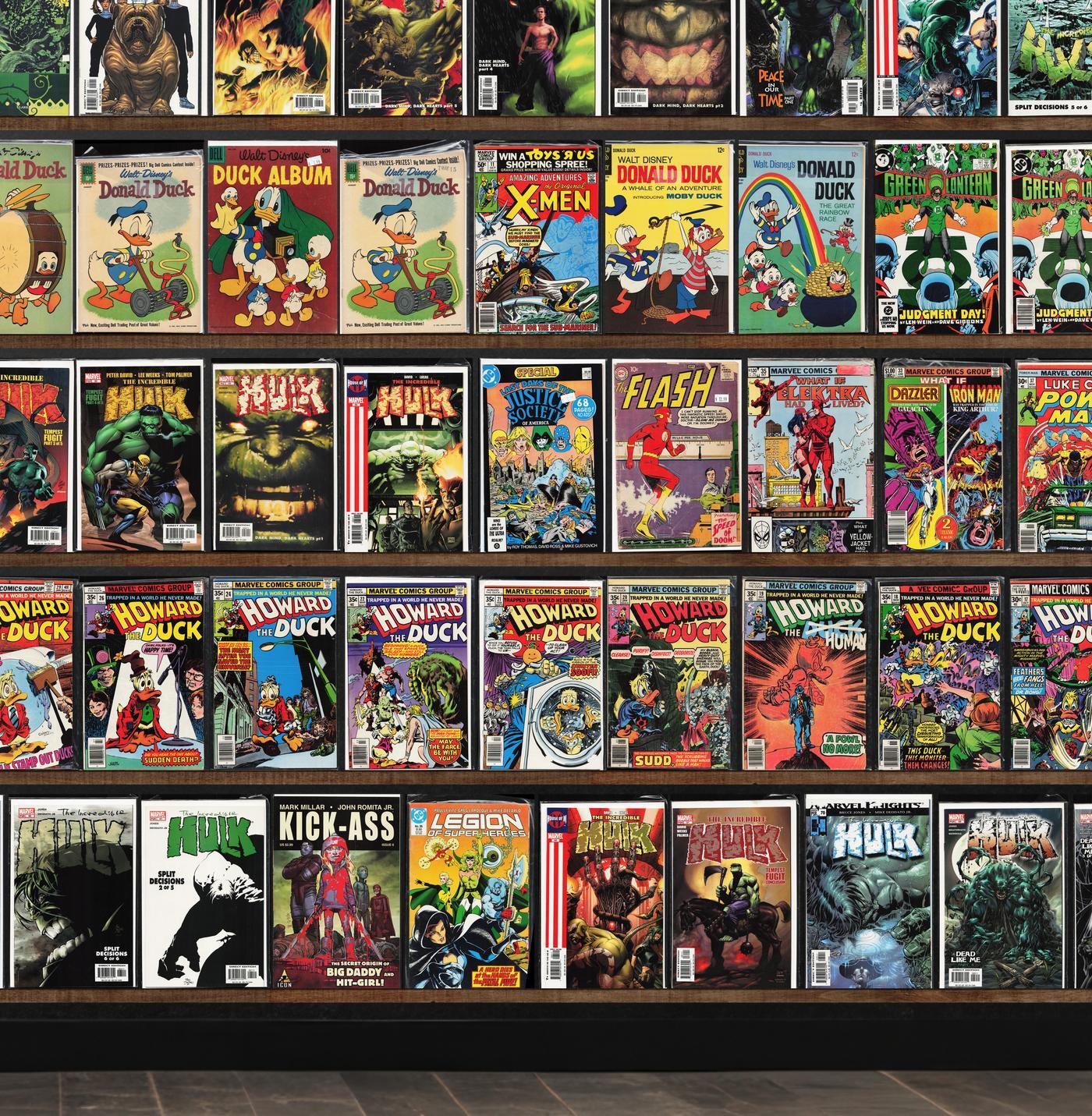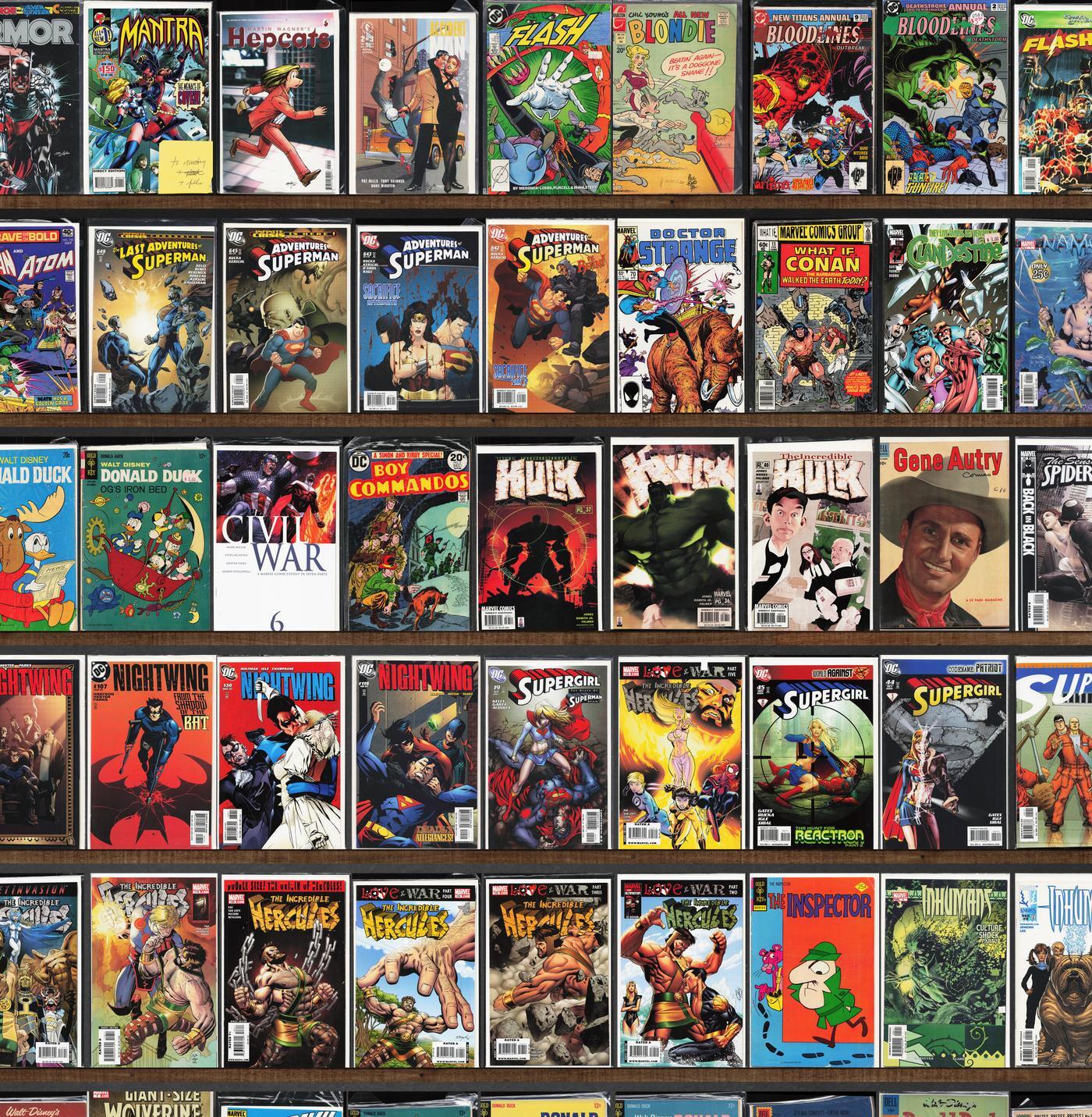 Incredible Hulk, Donald Duck, Incredible Hercules, Green Lantern, Howard The Duck, Doom Patrol, Gene Autry Comics, Nightwing, The Incredible Hulk, Doctor Strange, The Flash, Adventures Of Superman, What If?, Supergirl, Daredevil, Lassie, Friendly Neighborhood Spider-Man, Civil War, Battler Britton, Animal Man, Superman, Rampaging Hulk, X-Factor Annual, Amazing Adventures, Inhumans, Power Man, Iron Man, Spider-Woman, Flashpoint Deluxe, Armor, Mantra, Hepcats, Accident Man, Chic Young'S Blondie, Comic Shop News, Gen 13, The Phantom Blot, Clandestine, Namor, X-Factor, Old Ironsides, Boy Commandos, The Sensational Spider-Man, Justice League America, All Star Superman, The Phantom Stranger, Scimidar Book Iii, Supergirl Annual, The Inspector, Iron Man Annual, Magnus, Robot Fighter, Jughead, Jla: Classified, Hulk 2099, Marvel Team Up, Fantastic Four, Classic X-Men, Captain Savage, Darth Vader, Scarlett, Kick Ass, Legion Of Super Heroes