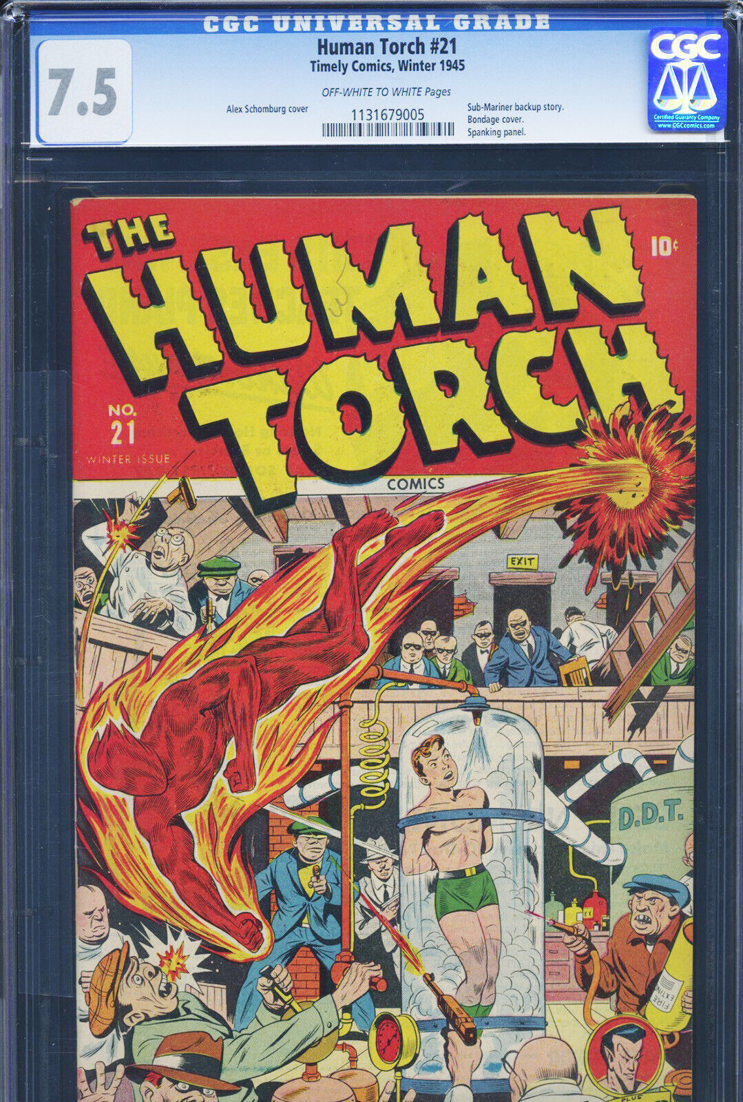 HUMAN TORCH #21 - CGC-7.5, OW-W - Timely - Sub-Mariner - Golden Age DESCRIPTION:This very sharp, unrestored copy is complete, fully readable and has both covers attached. The book has off white to white pages. Alex Schomburg cover. Human Torch and Sub-Mariner stories. Condition is a very conservatively graded CGC-7.5, VFN-.SHIPPING INFORMATION:Combine our auctions and $ave on shipping!Please remember that Media Rate may take up to 4 weeks delivery.FEDEX services available.Nevada residents, please add sales tax.We accept PayPal, MasterCard, Visa, Discover, American Express.NOTES AND FINE PRINT: Welcome to Redbeard's Book Den! For most that have collected comic books for the last 30 years, you have probably heard of us. Redbeard's founder and current owner is Ron Pussell (aka Redbeard), senior Overstreet Price Guide consultant since 1980.REDBEARD'S BOOK DENPO Box 217Crystal Bay, NV 89402-0217 _gsrx_vers_1680 (GS 9.8.3 (1680))