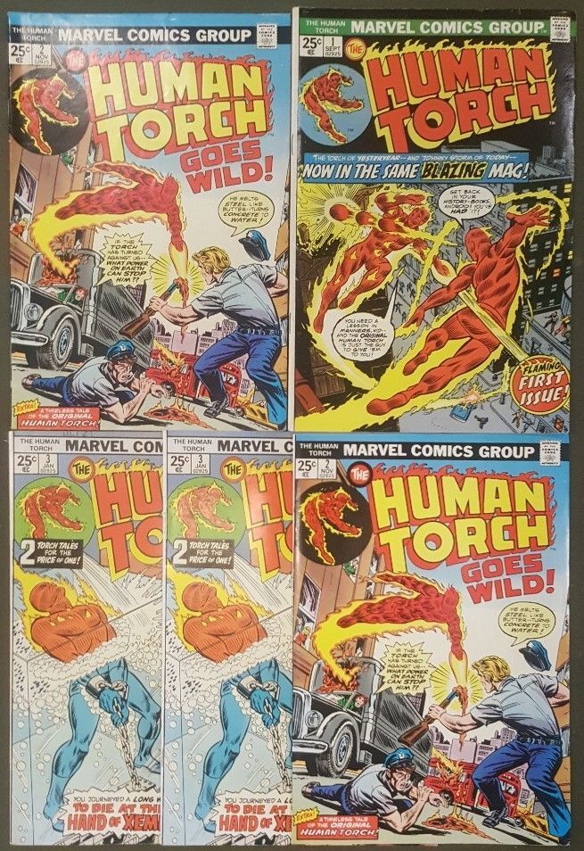 Human torch (1974-1975) #1 (vf-), #2 (vg/fn), #2 (vf/nm), #3 (nm-) and #3 (vf+). 2022 overstreet value for this 5 issue group is $112.00 based on condition. (bs94)..... Items will be shipped in a USPS MEDIUM FLAT RATE PRIORITY BOX. Check out our store and save money by combining multiple purchases to save on shipping costs.