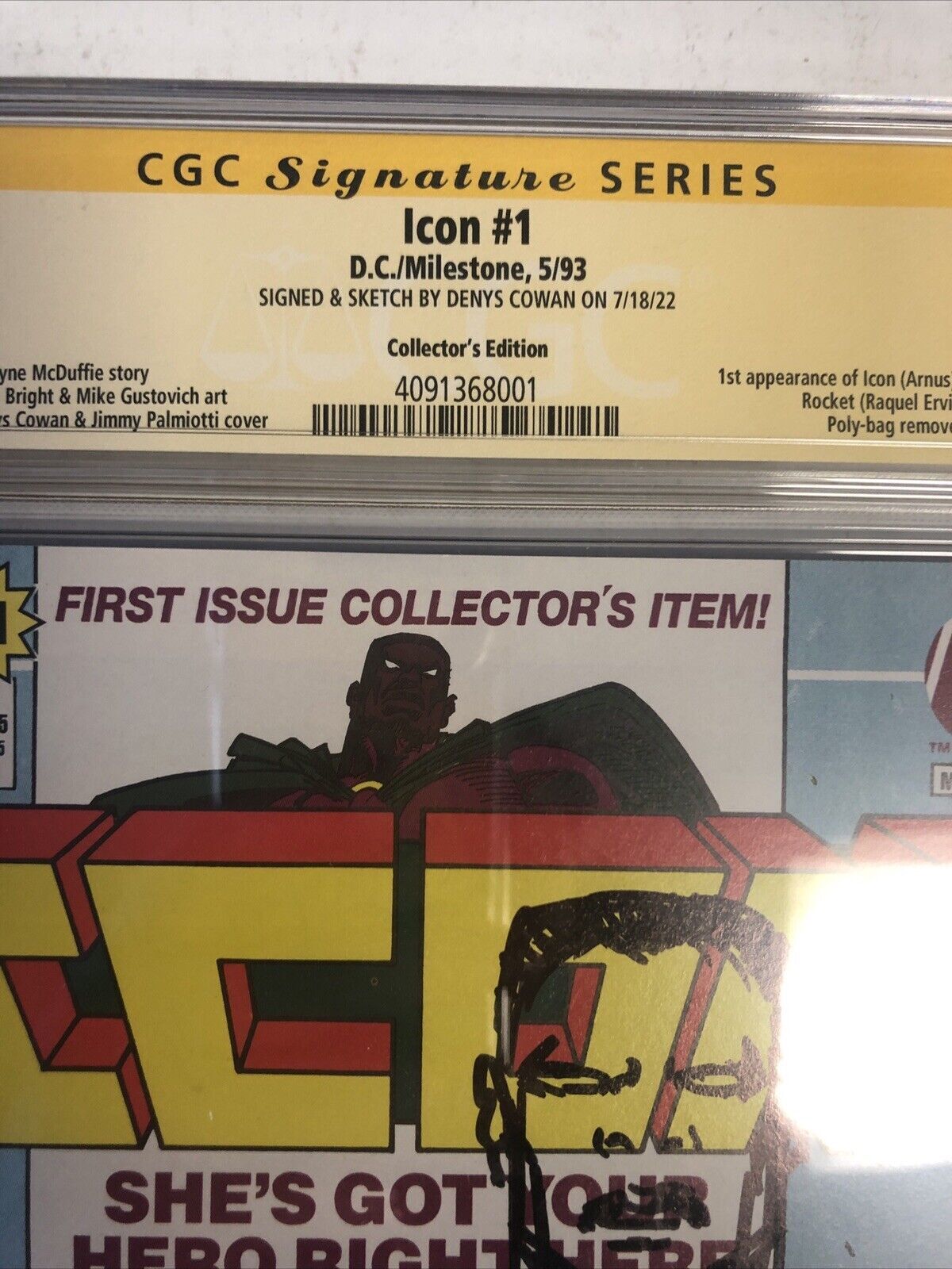Grade: 9.2 Near Mint- Icon (1993) #1 (CGC 9.2 SS WP) Signed & Sketch Denys Cowan
