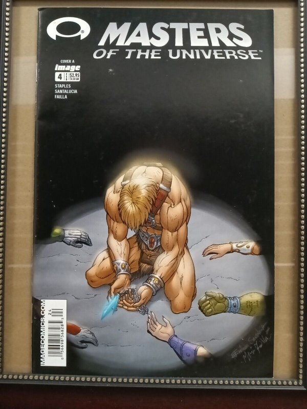 Grade: 7.0 Fine/Very FineThis is a highly collectible Image Comics MASTERS OF THE UNIVERSE #4 first printing cover A comic book. It features the iconic character He-Man in a fantasy genre storyline. The cover variant is highly sought after by fans and collectors alike. The comic is in a 7.0 Fine/Very Fine grade and is intended for a general audience. It was published in the United States in 2003 and is written by Emiliano Santalucia, Val Staples, Enza Fontana, and Marco Failla, with artwork by Emiliano Santalucia and Marco Failla. This comic book is an excellent addition to any comic book or Masters of the Universe collection.