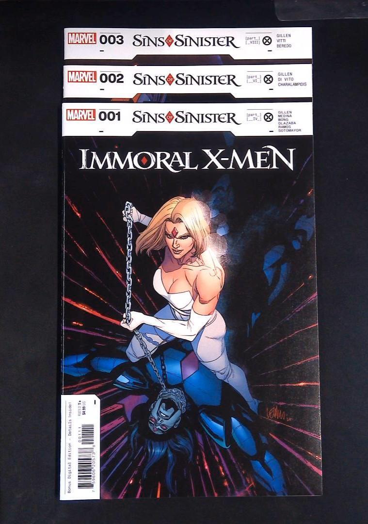 In "Immoral X-Men" issues 1-3, the Sins of Sinister storyline unfolds with the mutants navigating the consequences of Mr. Sinister's machinations. The series focuses on the ethical dilemmas and power struggles within the X-Men as they confront their darkest impulses. Each cover features dynamic artwork capturing the intense drama and moral conflicts of the series. No noticeable condition issues are present in the images provided.