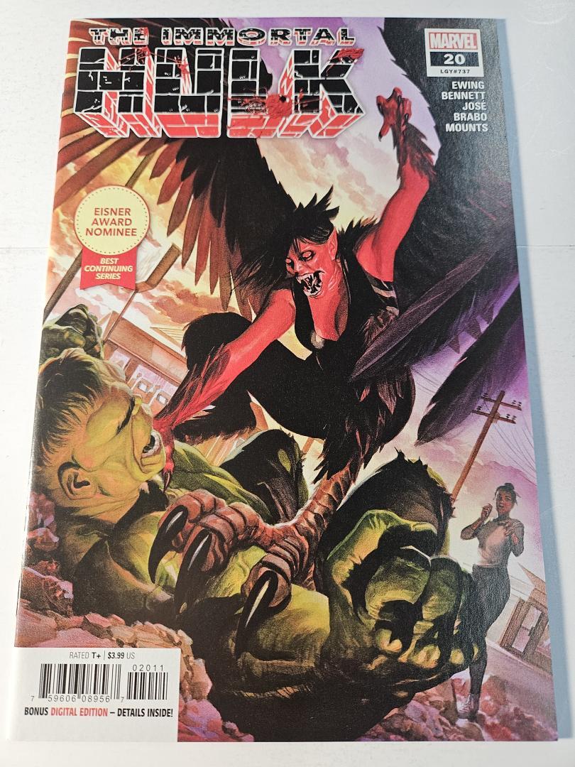 "The Immortal Hulk #20" features a thrilling battle as the Hulk encounters new terrifying threats, including monstrous creatures intent on his downfall. The intense cover artwork by Alex Ross vividly captures the action, emphasizing the relentless energy and dark twists in the storyline. Readers are drawn into the psychological and supernatural elements that challenge Bruce Banner's resilience and the Hulk's indestructibility.
