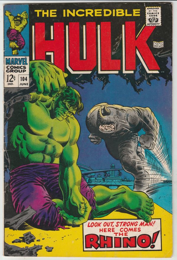 Incredible Hulk #104 - Look Out, Strong Man! Here Comes the Rhino! APPEARANCE - 3rd Hulk in his own ongoing series. APPEARANCE - The Rhino {{Grade Synopsis}} Characters Hulk, Betty Ross, General Ross, Rhino, Bett ... Read More