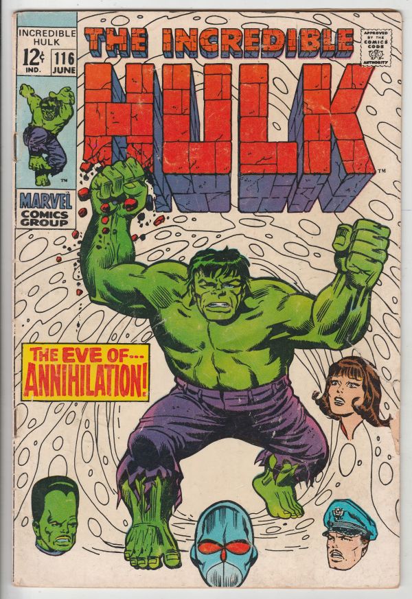 Incredible Hulk #116 - The Eve of Annihilation! APPEARANCE - The Leader ARTIST - Herb Trimpe This book has deep rich color and decent eye-appeal. There is a thin tape-seal at the inside front cover's outer-edge w ... Read More