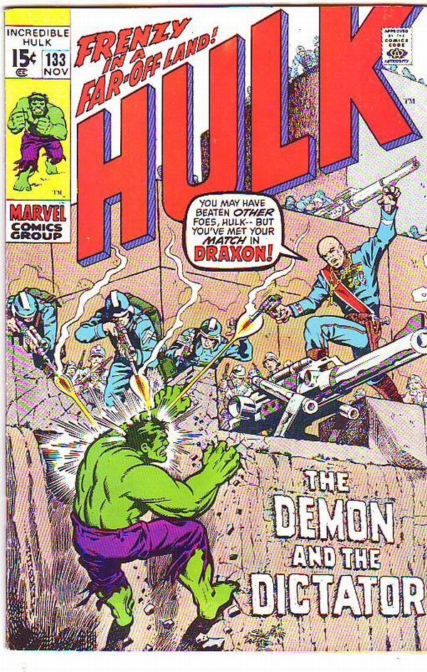 Incredible Hulk #133 - The Demon Dictator! Characters Hulk, Betty Ross, Thunderbolt Ross, Jim Wilson, Draxon Stories "Day of Thunder Night of Death!" Issue #133 - Vol. 1 Era: Silver Age Date: Nov-70 Cover Pric ... Read More
