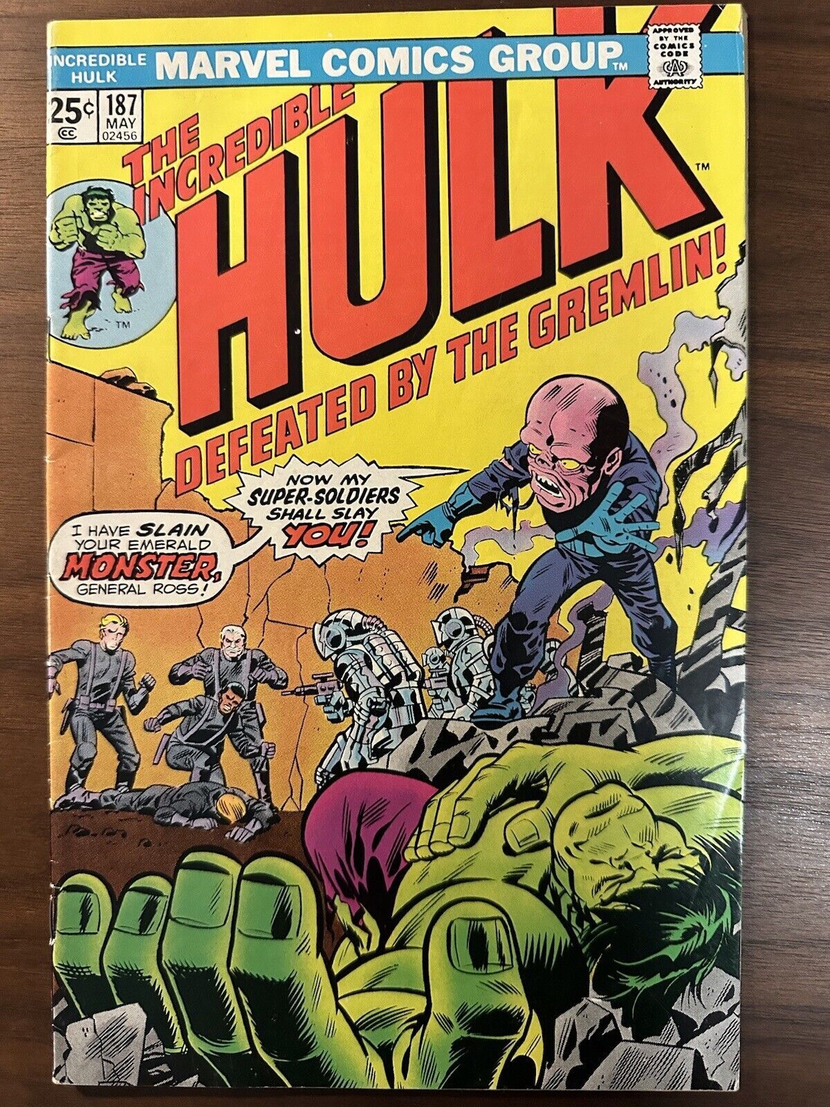 Grade: 5.5 Fine-Incredible Hulk #187 FN- Herb Trimpe Cover (Marvel 1975)Fine- 5.5 condition. Please see pictures for more grading details. Cover art by Herb Trimpe. There's a Gremlin In the Works!, script by Len Wein, pencils by Herb Trimpe, inks by Joe Staton; Banner stows away on a mission to the Soviet Union to rescue the captured Glenn Talbot, which brings the Hulk into conflict with the Gremlin, who has brainwashed Talbot.
