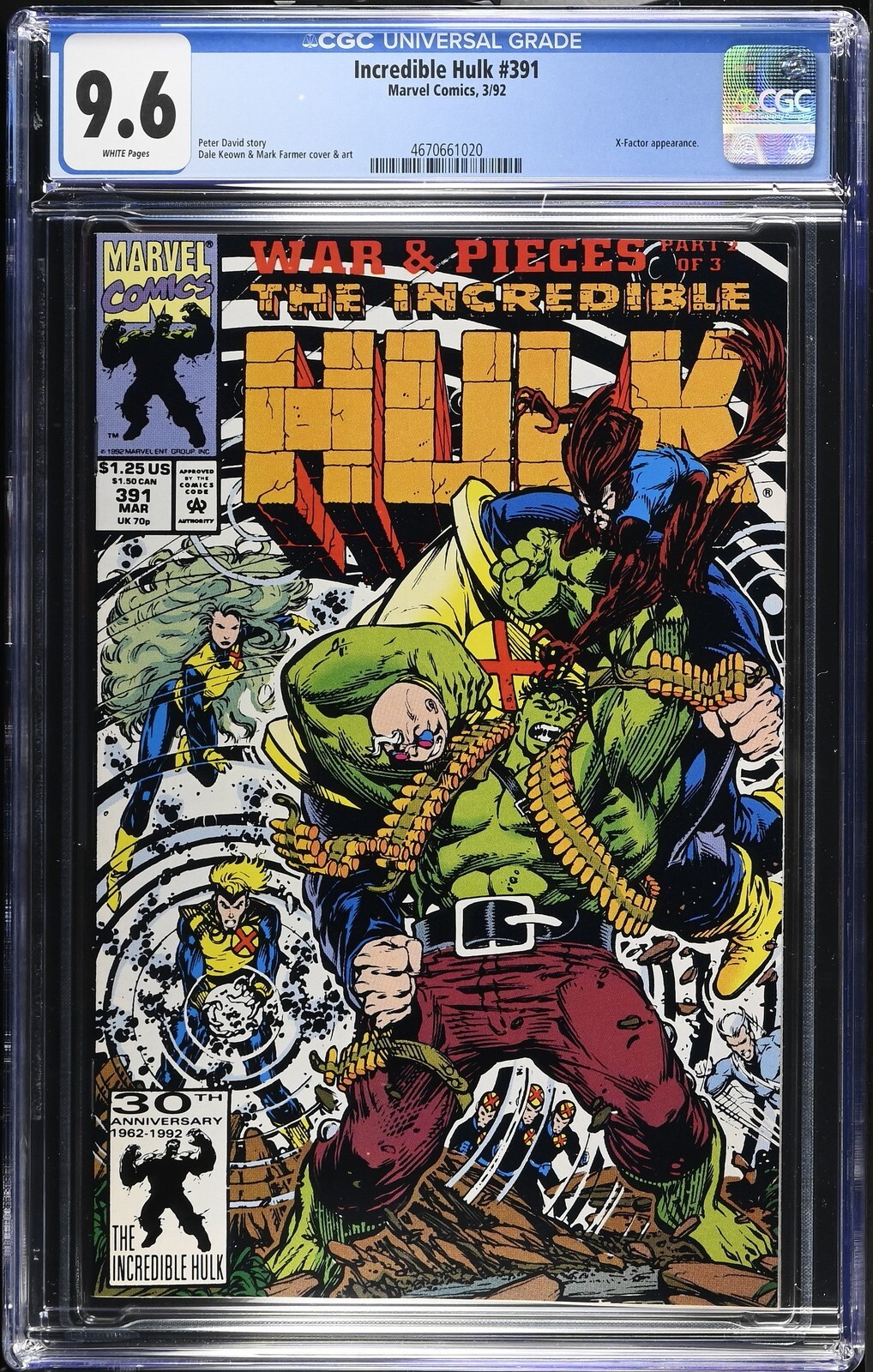 Incredible Hulk #391 from 3/92 offers a glimpse into the era's iconic storytelling. Featuring x-factor appearance., this issue is a must-have for collectors. Add this CGC 9.6 graded comic to your collection today!Attribute DetailsCertNumber 4670661020DisplayGrade 9.6GradeCategory ModernPageQuality WHITEArtComments Peter David story, Dale Keown & Mark Farmer cover & artKeyComments X-Factor appearance.CollectibleID 21471CollectibleType CTitle Incredible HulkIssue 391IssueDate 3/92Publisher Marvel ComicsYear 1992PopulationAtGrade 14population_8_0 1population_8_5 1population_9_4 11population_9_6 14population_9_8 31GraderNotes spine stress lines coverSales History