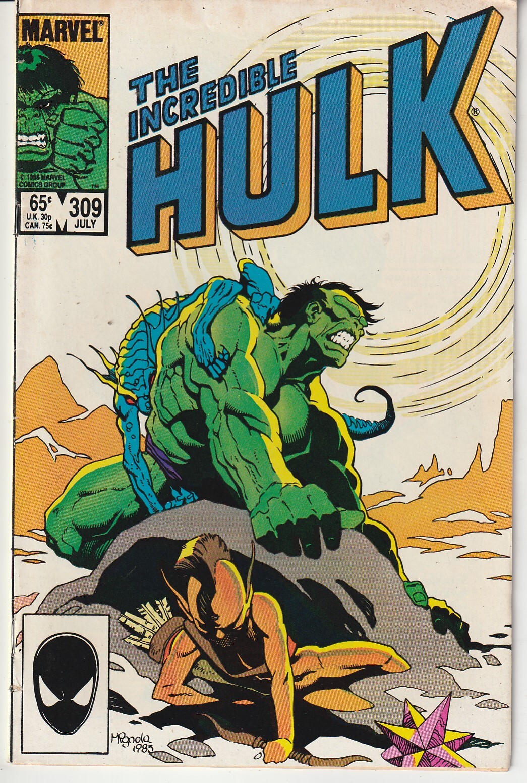 Banner’s consciousness is submerged. The hulk’s rage is all that’s left ! Dr. Strange exile’s the hulk to the infinite crossroads of time and space ! In this issue, a trio of exotic beings appear before the hulk. What are their connection to him ? Story and art by the rom spaceknight creative team of writer bill mantlo and artist sal buscema
